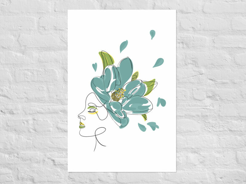Le visage féminin est tracé d’un fil unique, fragile mais continu — comme une pensée qui glisse sans se rompre. La fleur, elle, est dense, royale, comme une architecture émotionnelle posée sur la tête de la femme. Autour d’elle, les pétales se détachent : des fragments de mémoire qui s’envolent, des parts de soi que l’on accepte enfin de déposer, pour continuer à avancer plus légère.