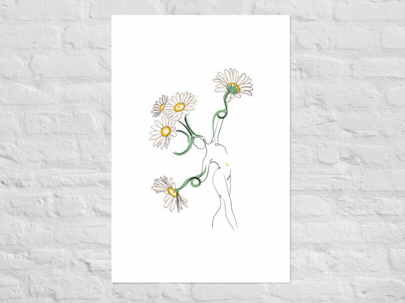 Elle apparaît comme un souffle sur la toile : une silhouette légère, presque prête à se dissoudre dans l’air. La Femme Pâquerette est un mouvement suspendu — une danse silencieuse qui oscille entre la grâce et l’insouciance. Son corps est un fil souple, tracé d’une seule ligne (presque, faisons comme si!), et de ce fil naissent des pâquerettes blanches, modestes mais lumineuses, comme si la joie la plus simple avait choisi de fleurir à travers elle.