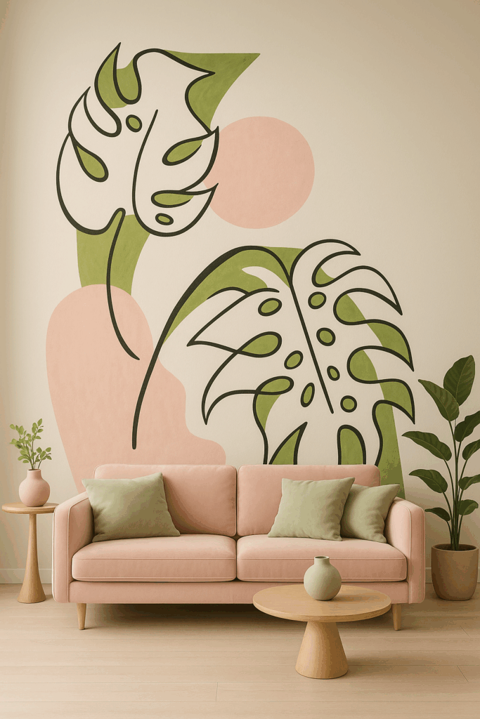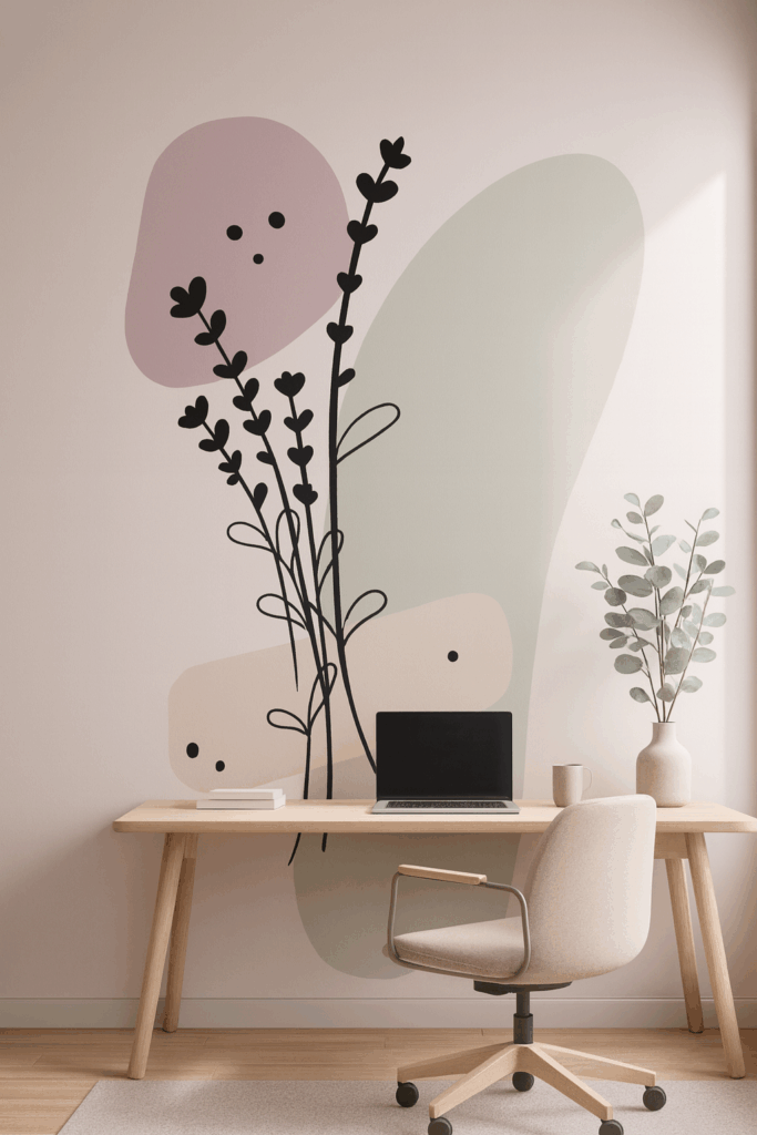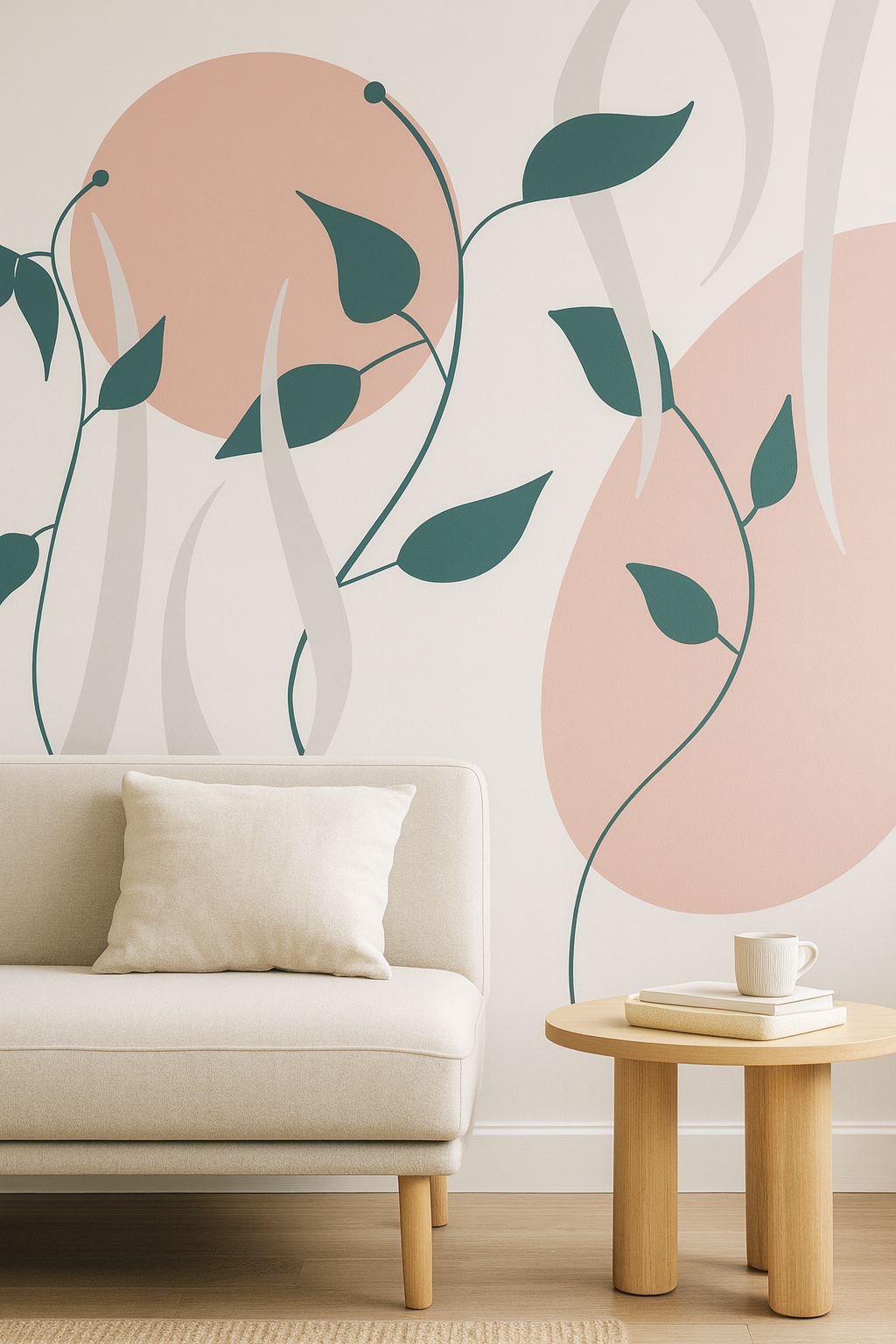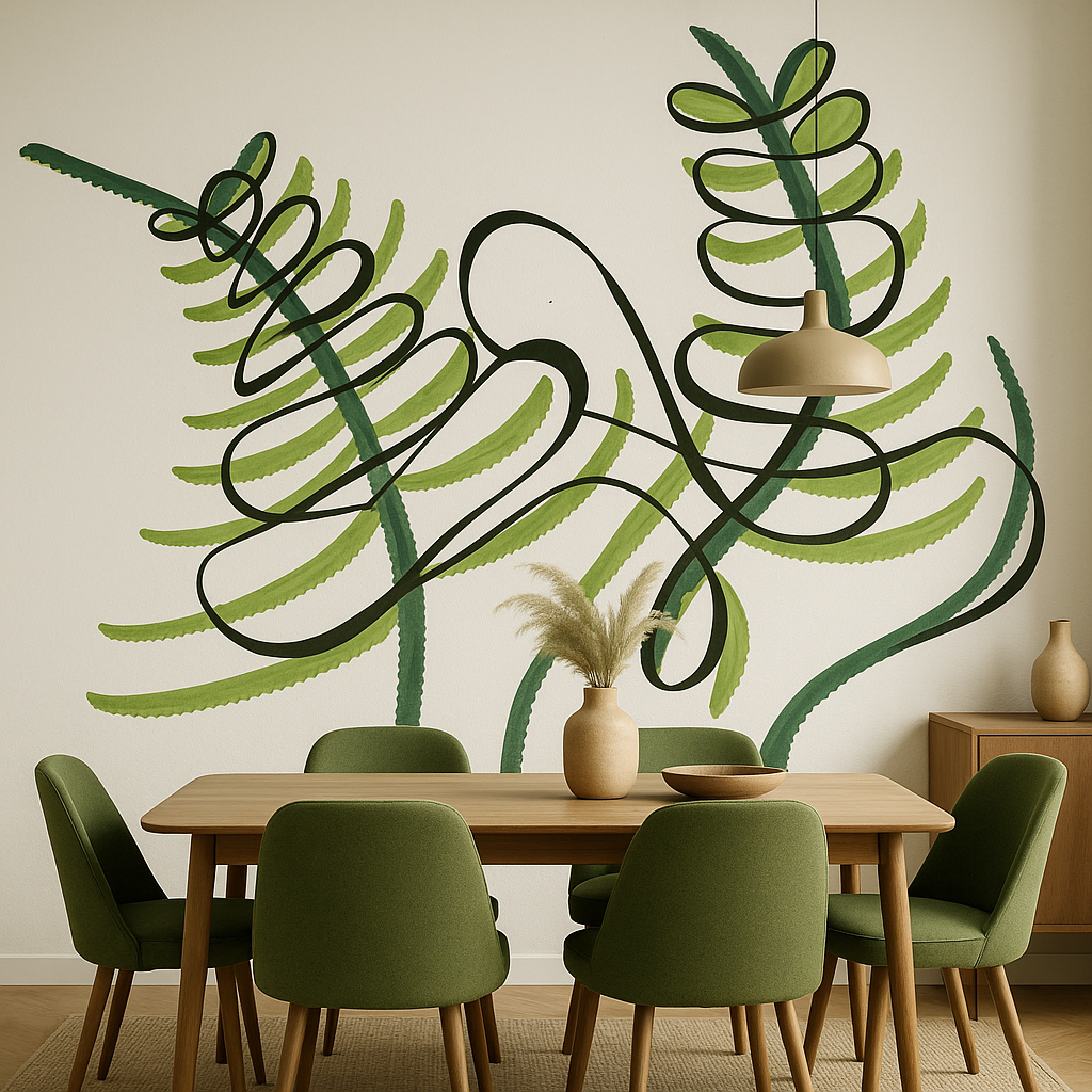 À travers mes fresques murales, j’invite la nature à reprendre sa place — doucement, poétiquement, à travers des lignes végétales qui respirent et se fondent dans votre intérieur.