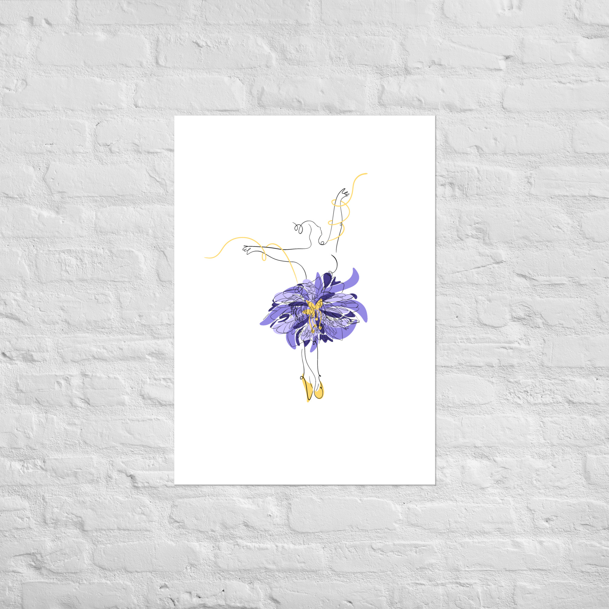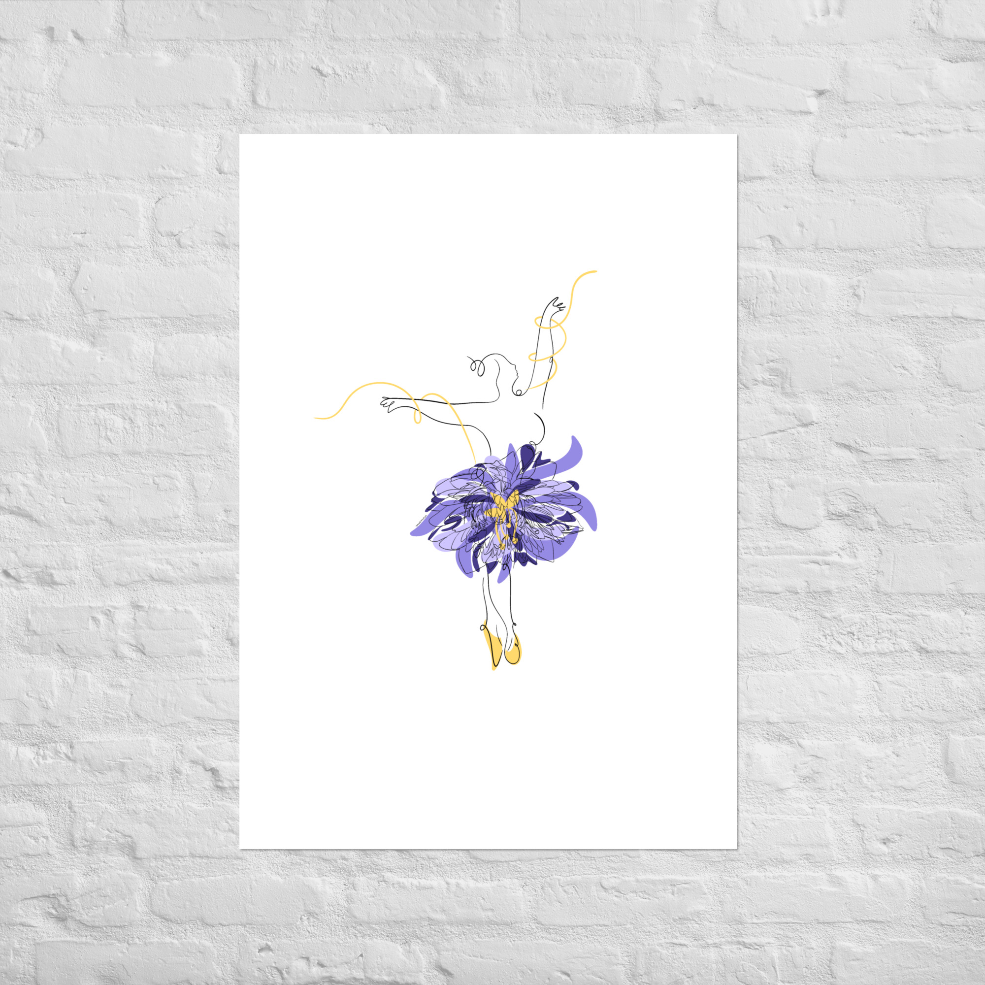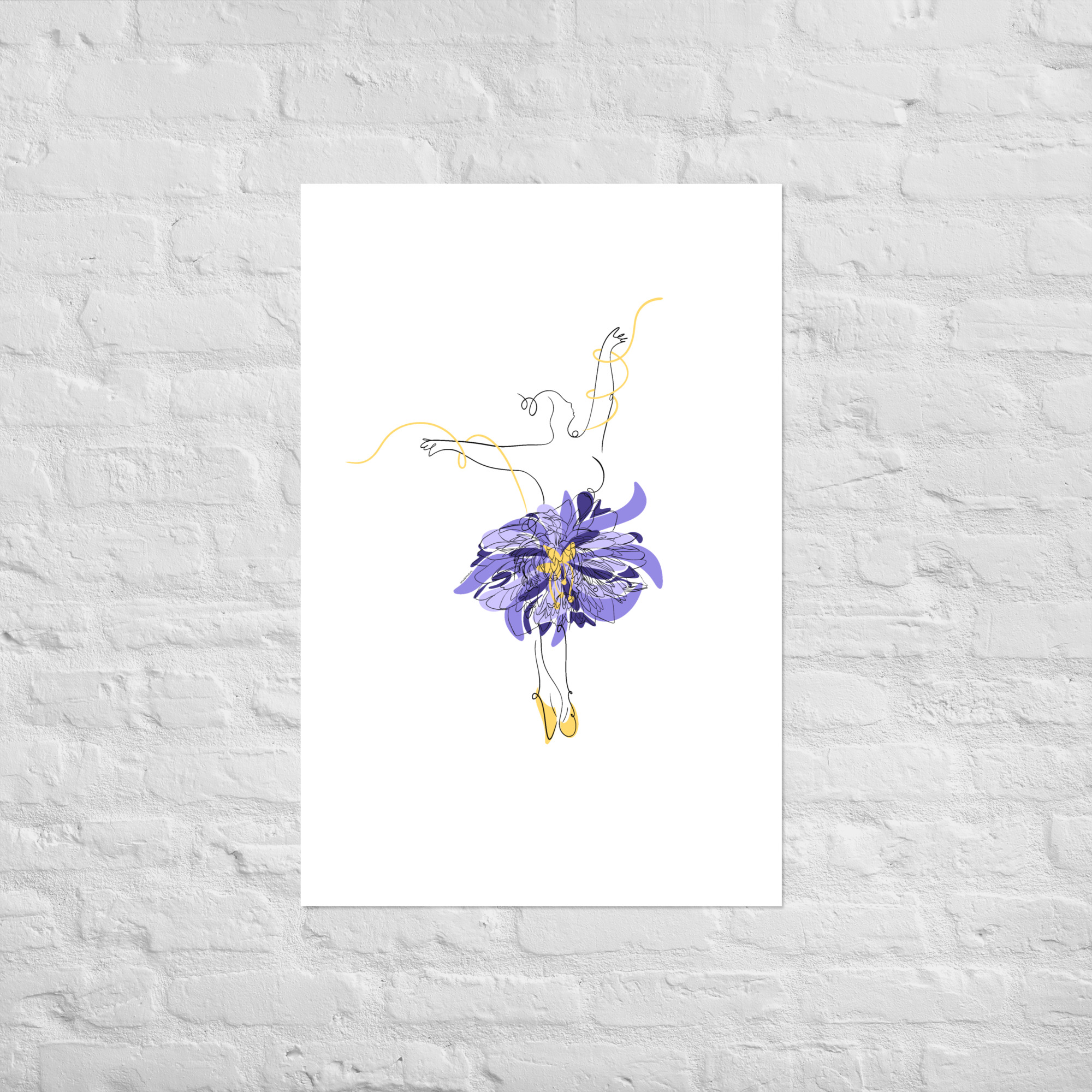 Une illustration minimaliste en line art représentant une silhouette de danseuse féminine ornée d’une grande fleur stylisée violette et de courbes dorées.