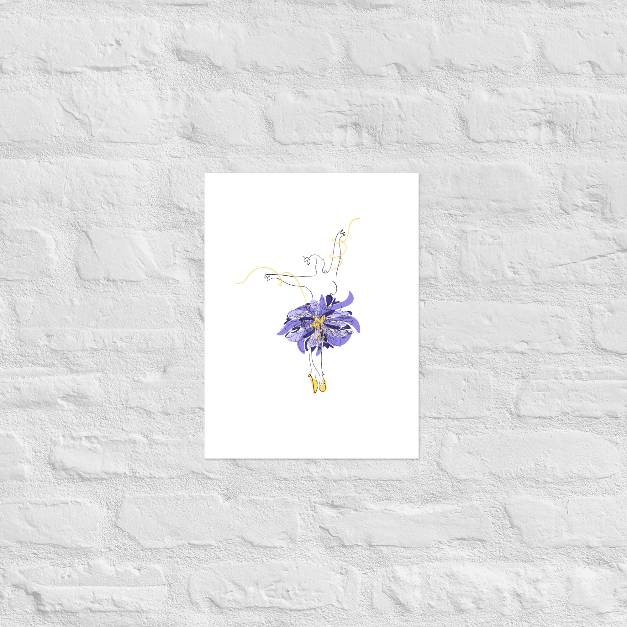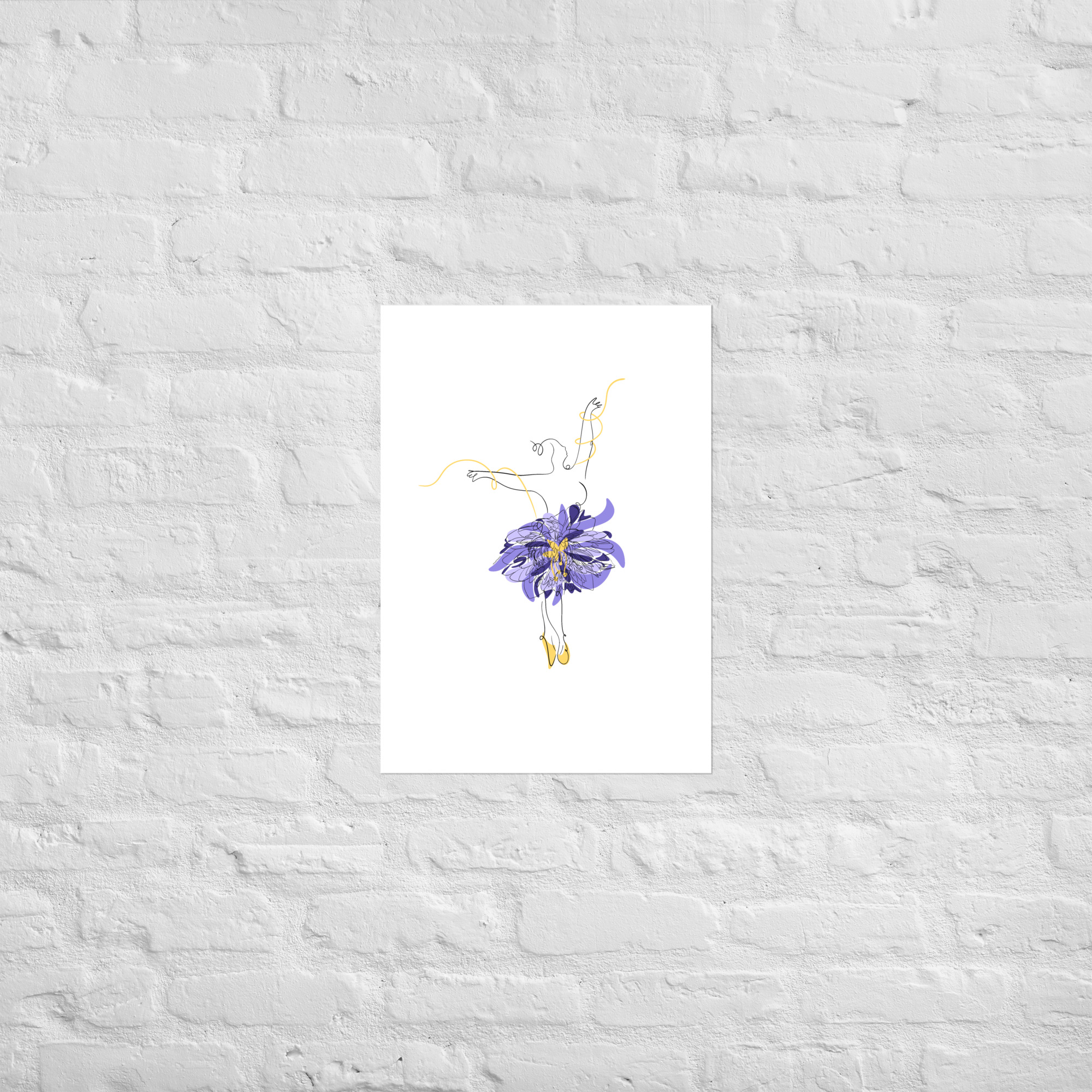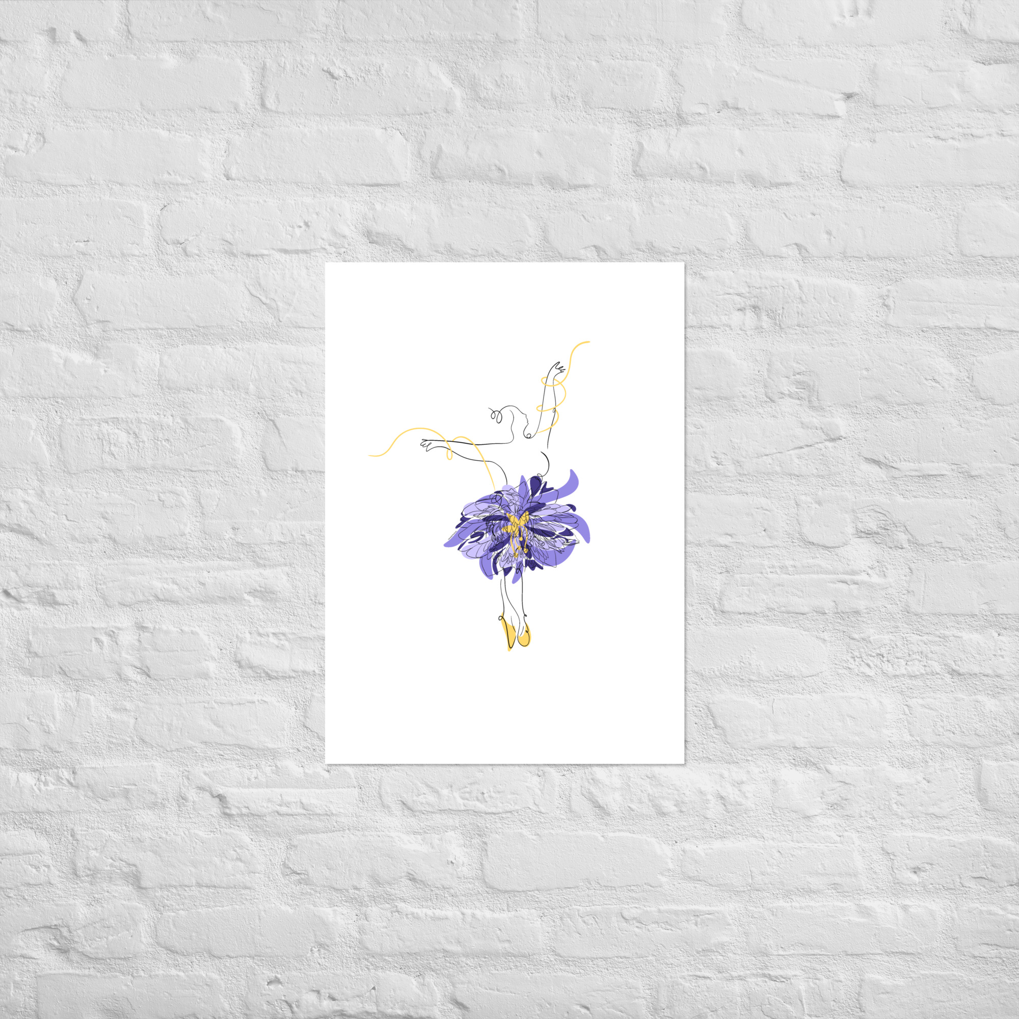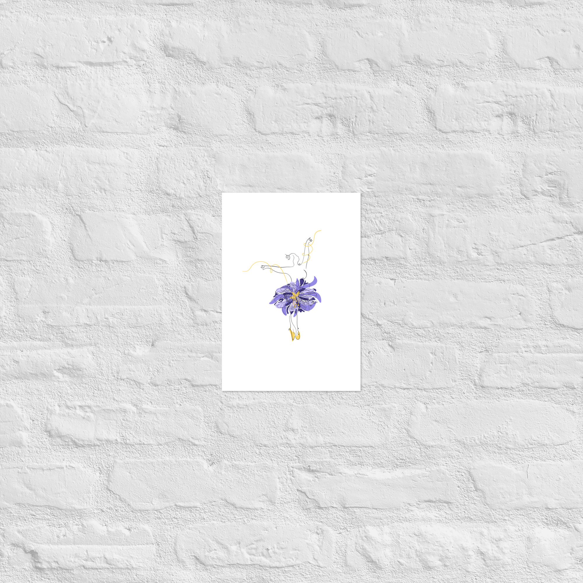 Une illustration minimaliste en line art représentant une silhouette de danseuse féminine ornée d’une grande fleur stylisée violette et de courbes dorées.
