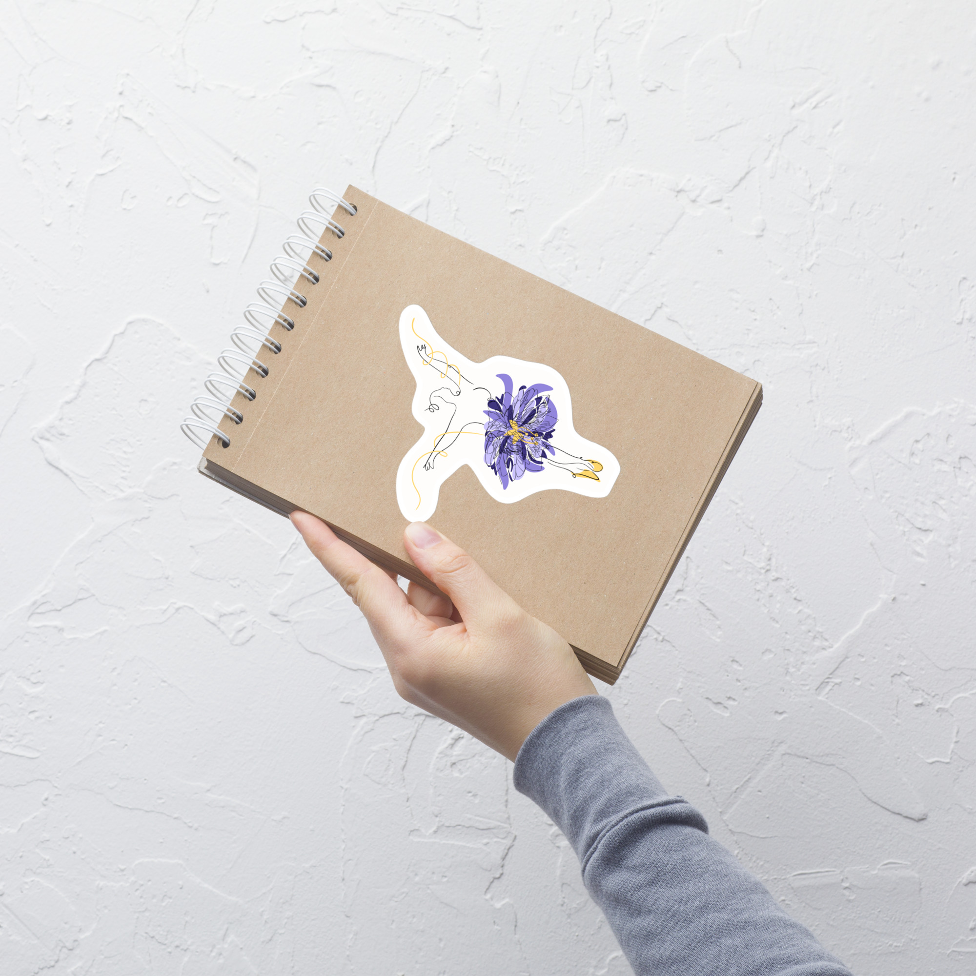 Une illustration minimaliste en line art représentant une silhouette de danseuse féminine ornée d’une grande fleur stylisée violette et de courbes dorées.