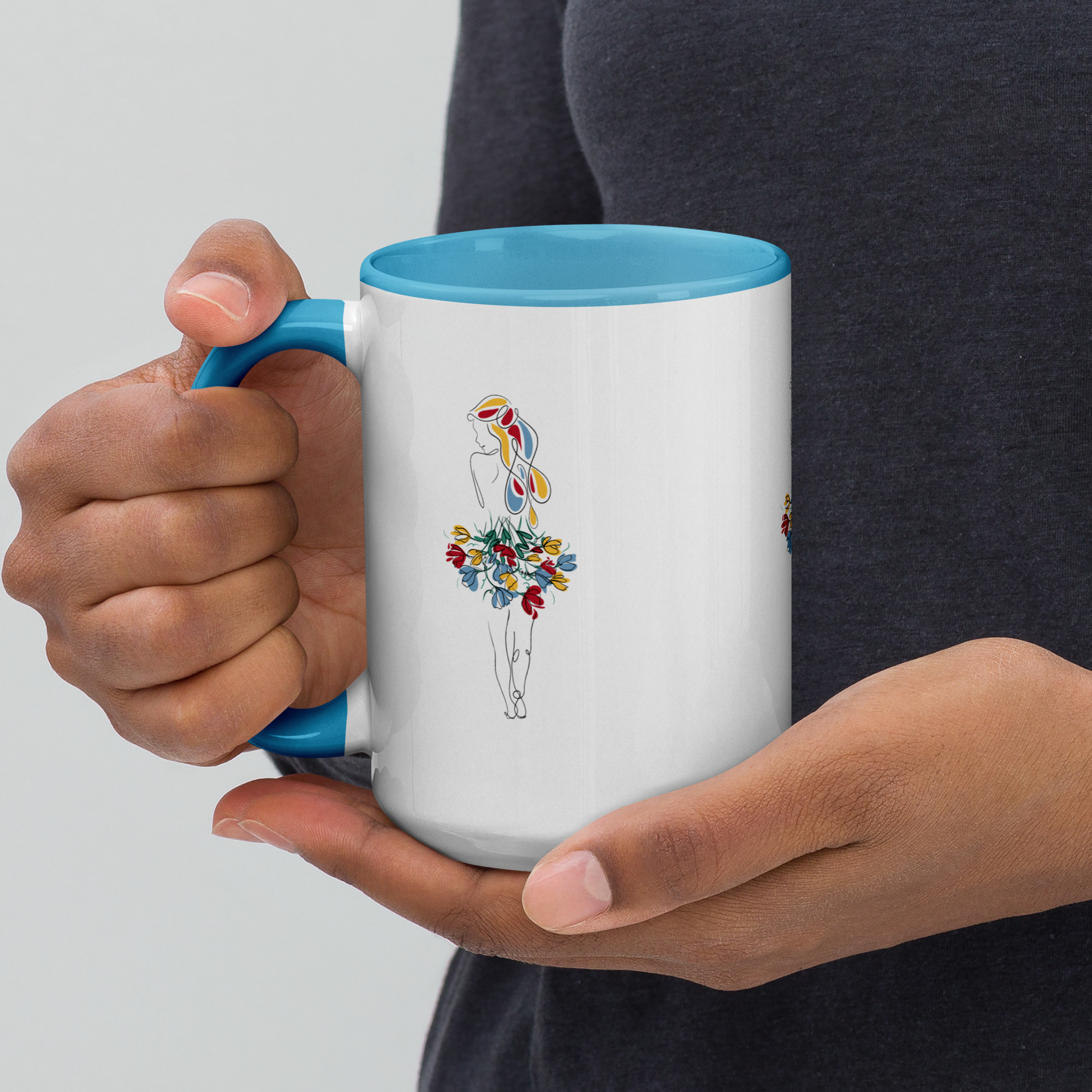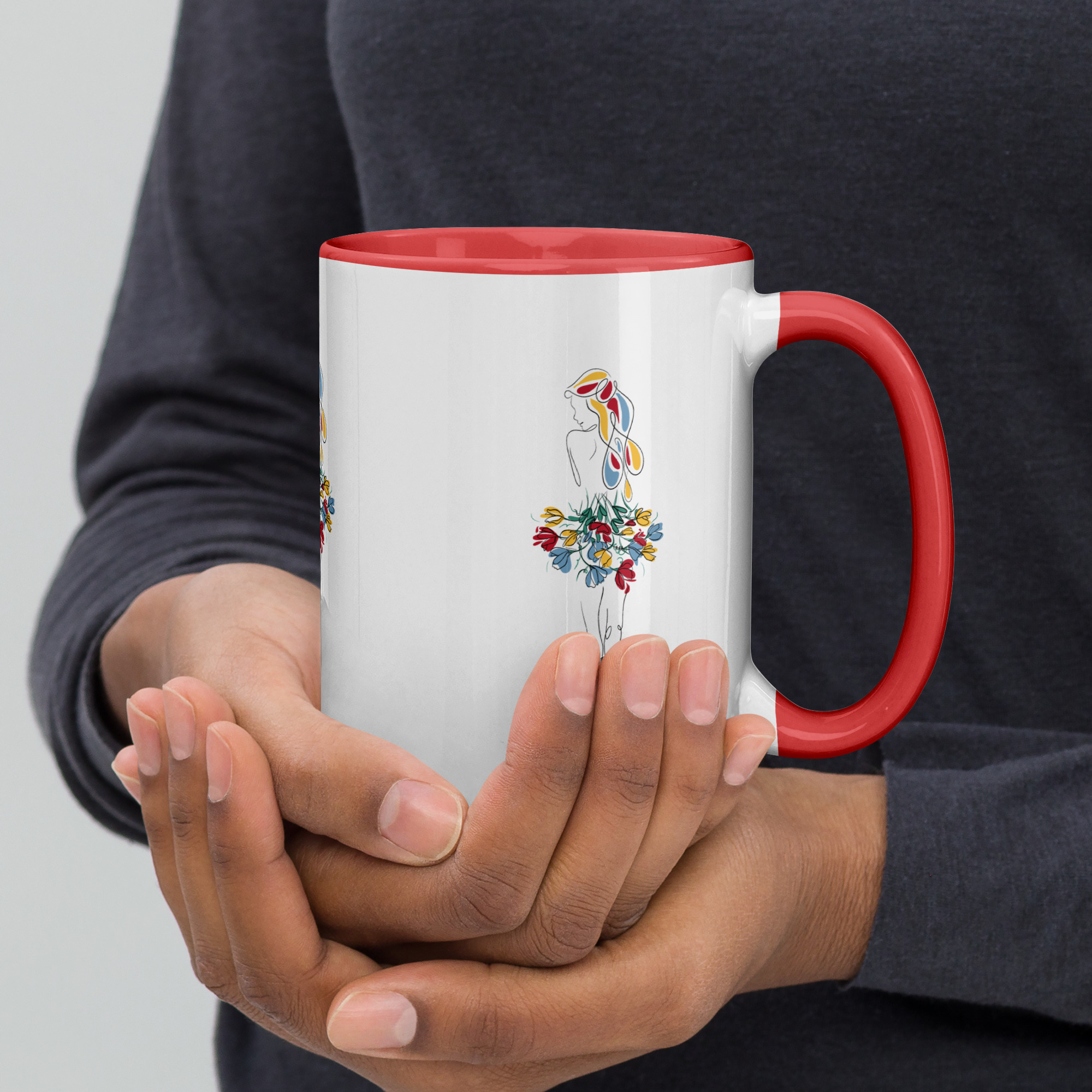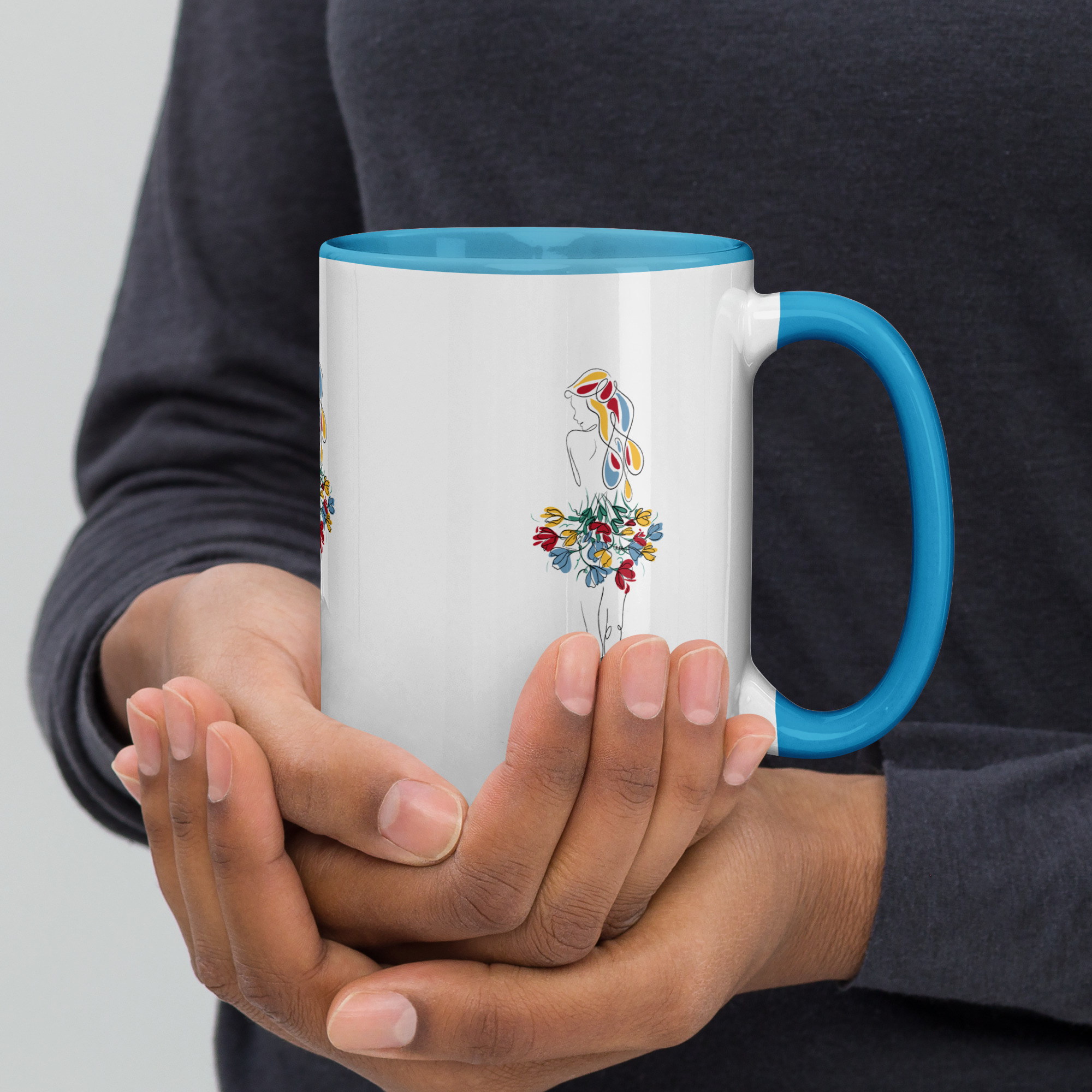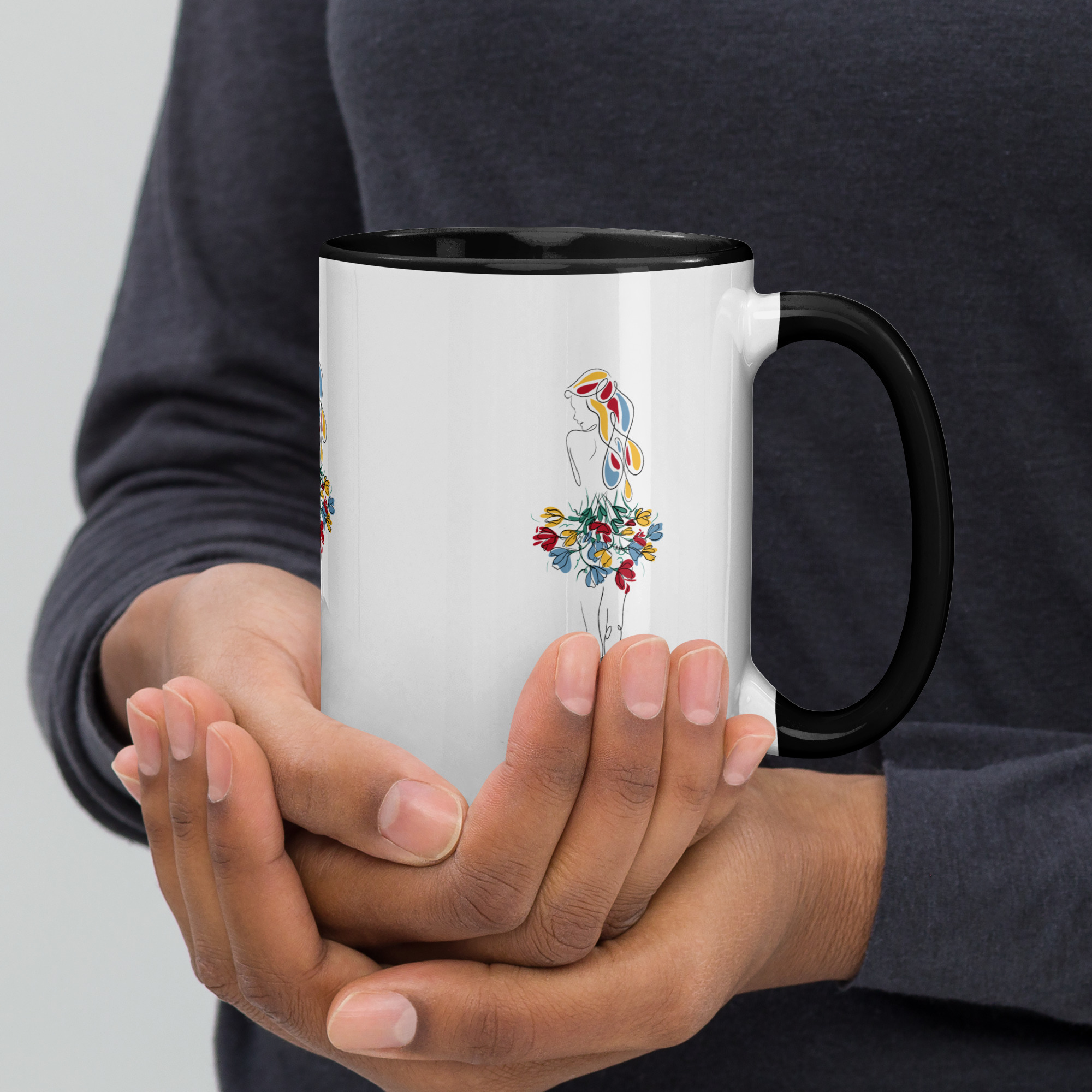Une illustration minimaliste en line art représentant une silhouette féminine ornée d’un bouquet de fleurs multicolores, dont les pétales tombent délicatement.
