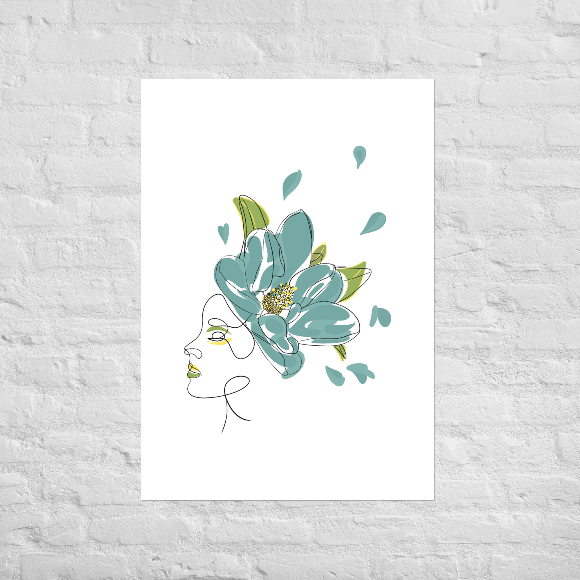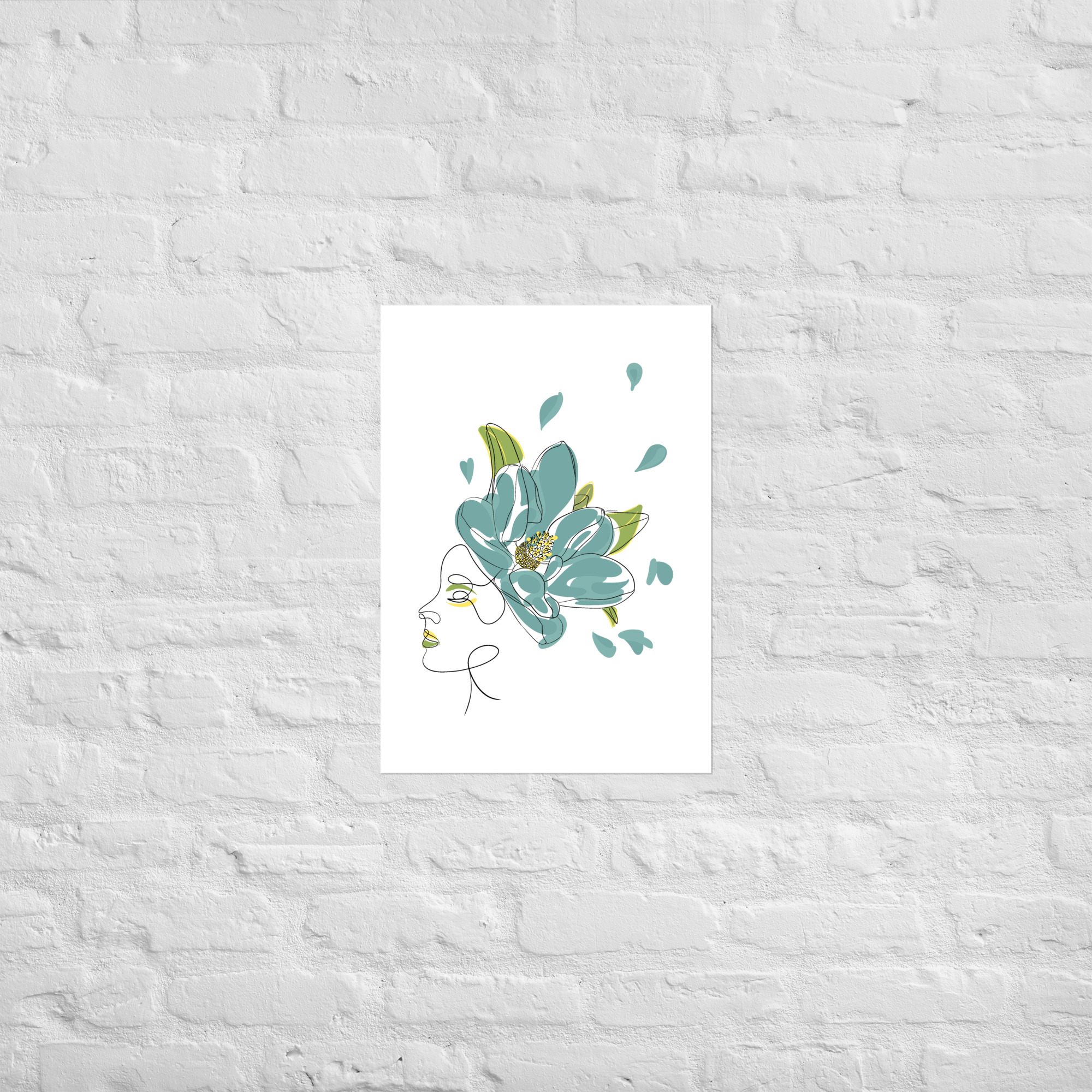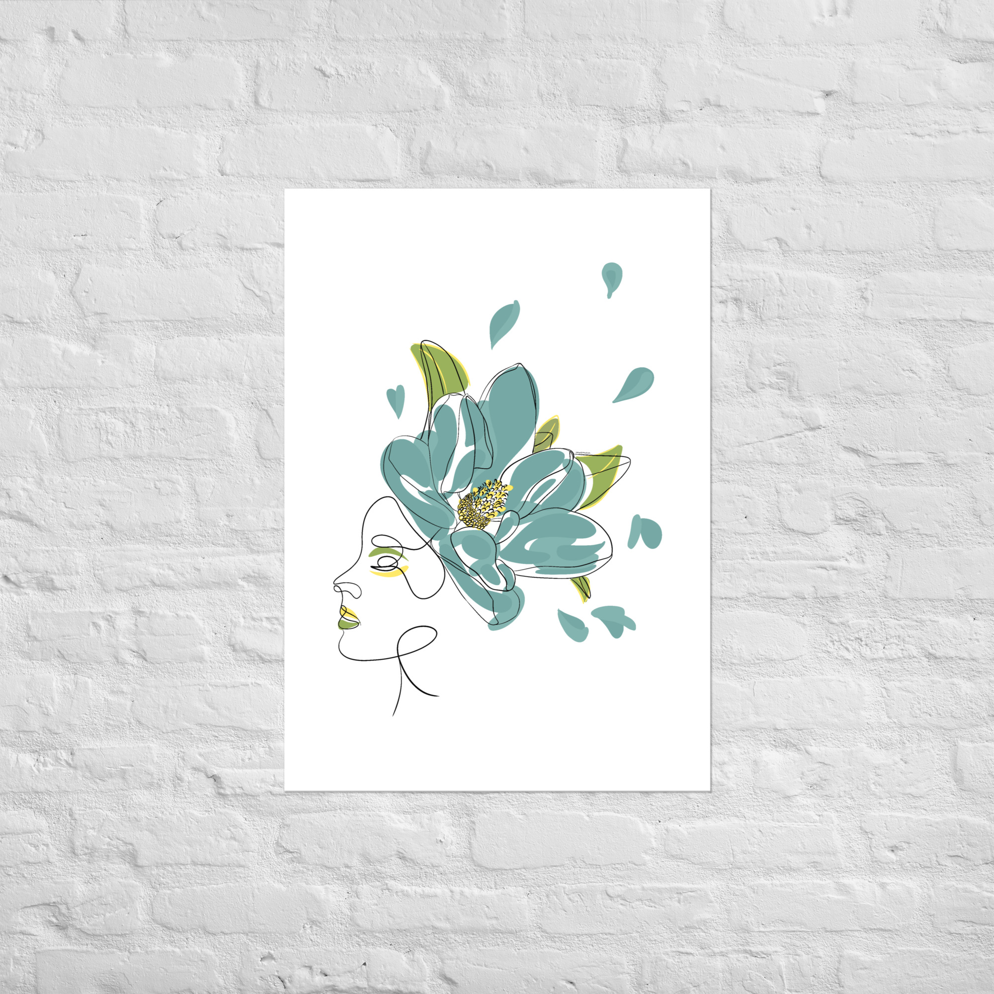 Une illustration minimaliste en line art représentant une silhouette féminine ornée d’une grande fleur stylisée aux pétales bleu-vert et aux détails dorés.