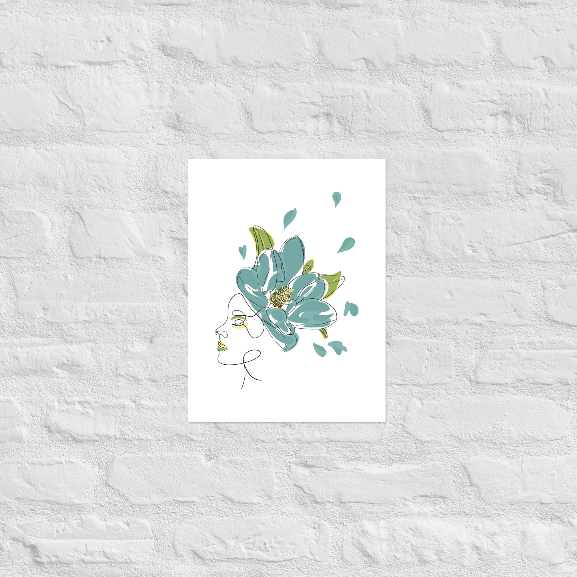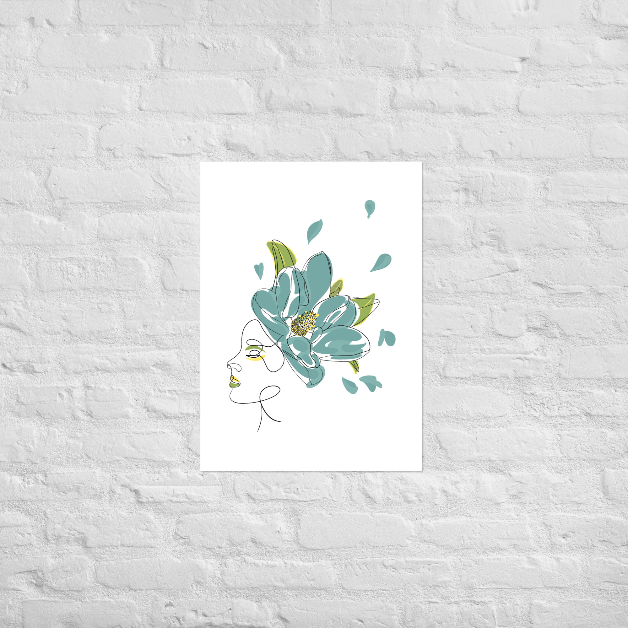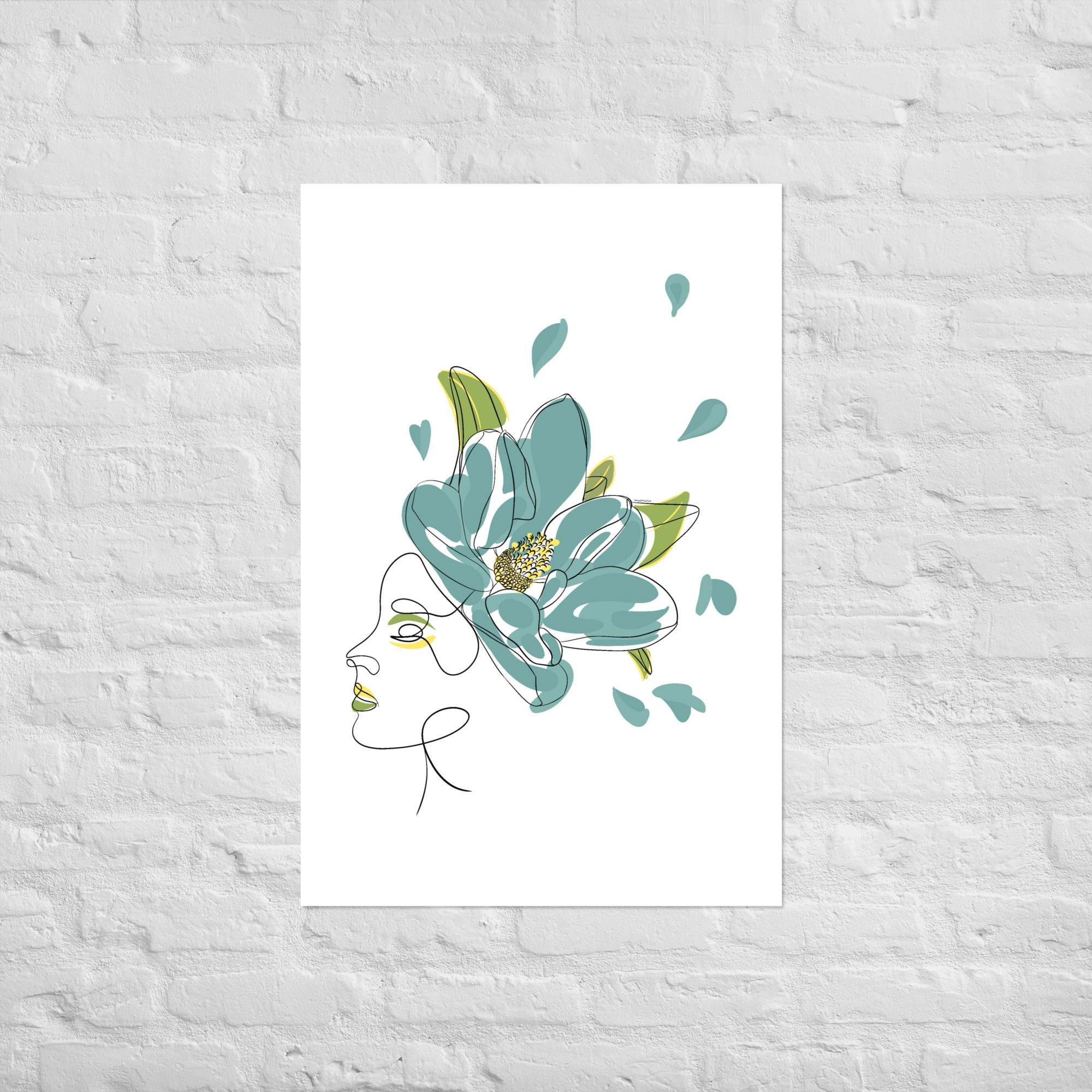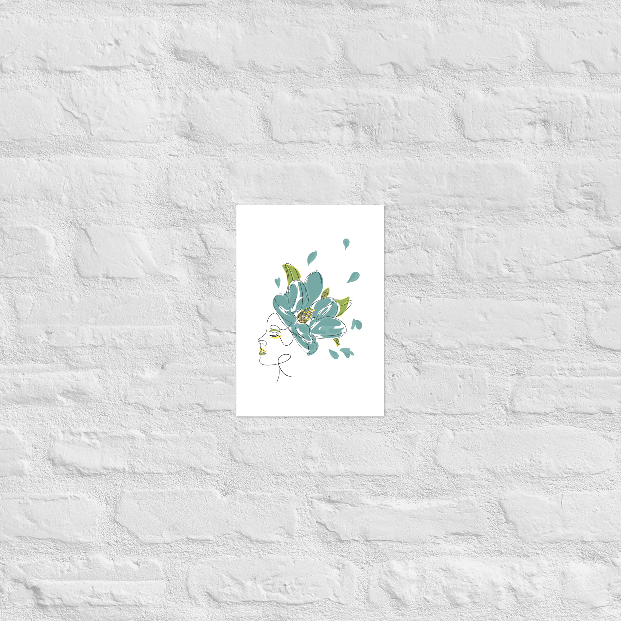 Une illustration minimaliste en line art représentant une silhouette féminine ornée d’une grande fleur stylisée aux pétales bleu-vert et aux détails dorés.