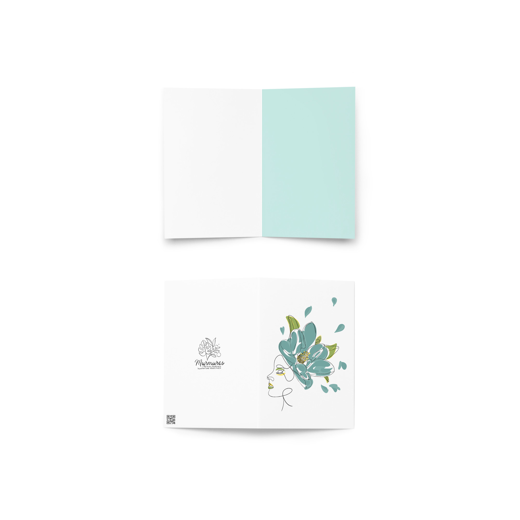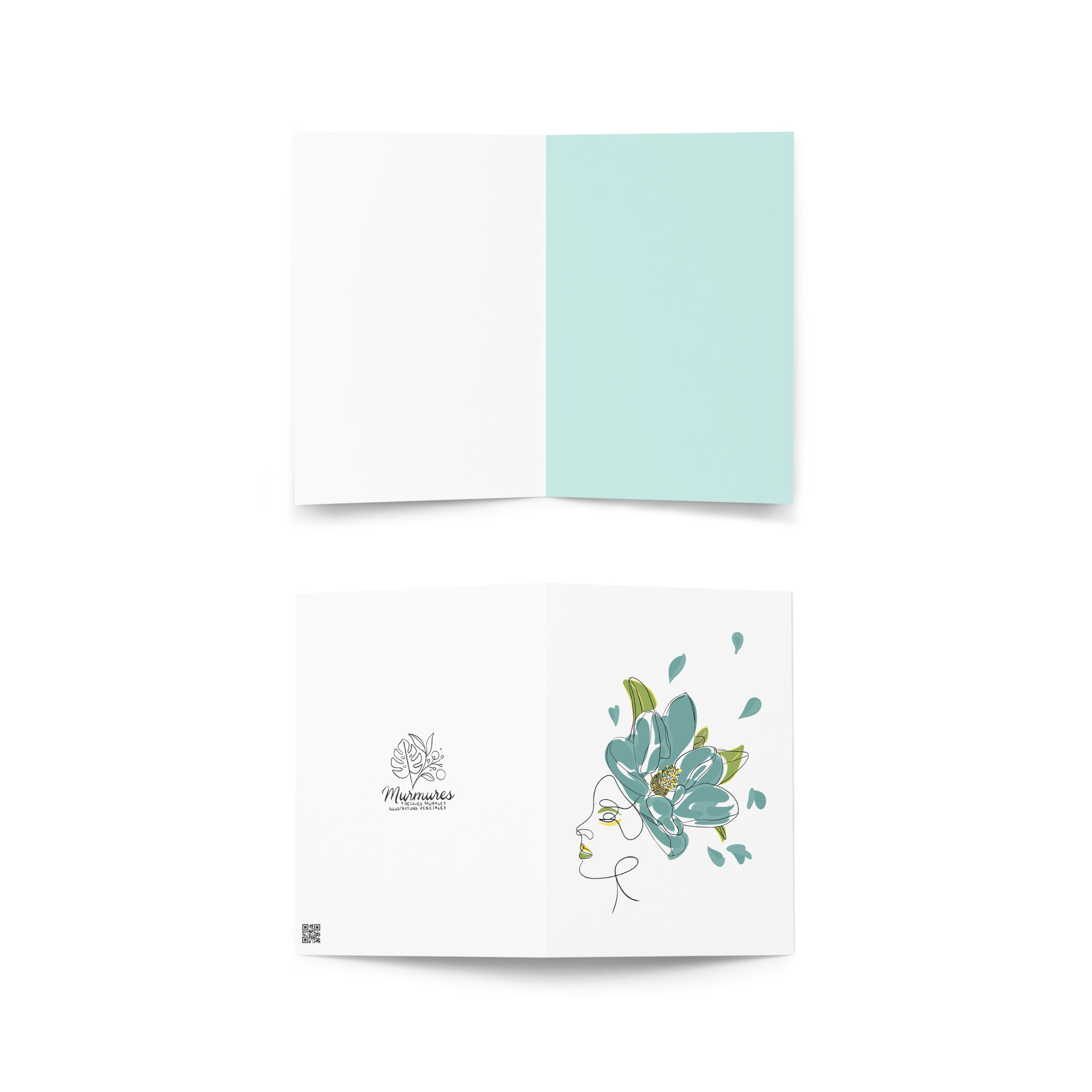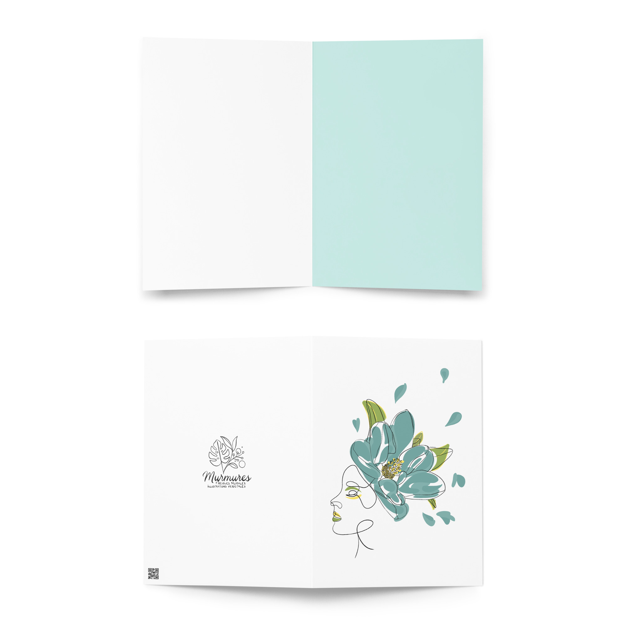 Une illustration minimaliste en line art représentant une silhouette féminine ornée d’une grande fleur stylisée aux pétales bleu-vert et aux détails dorés.