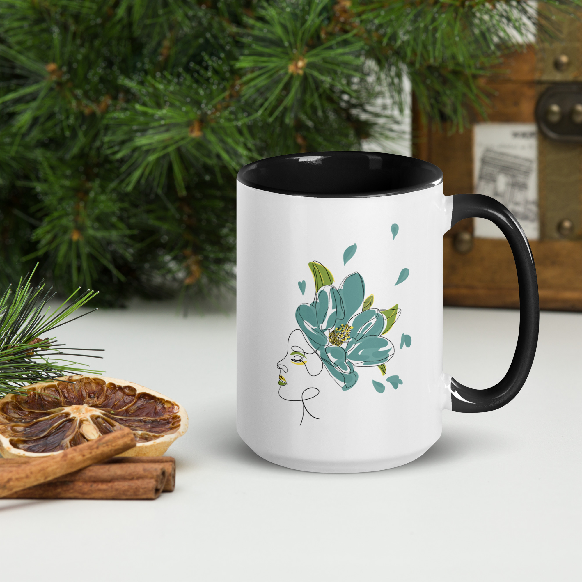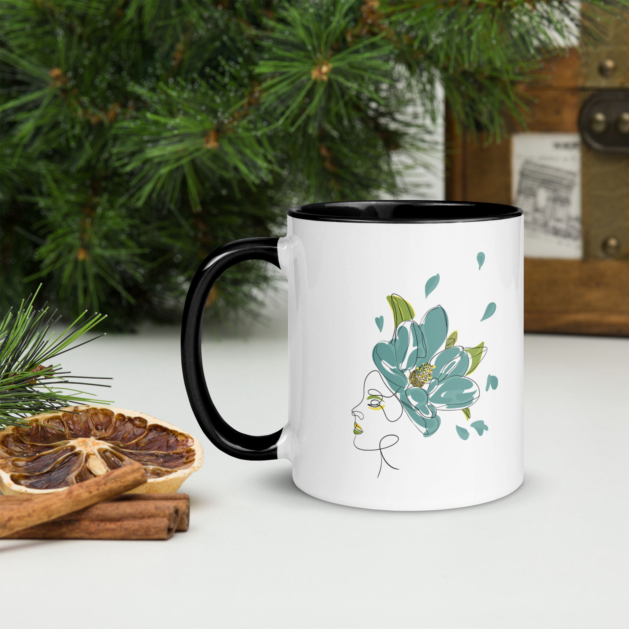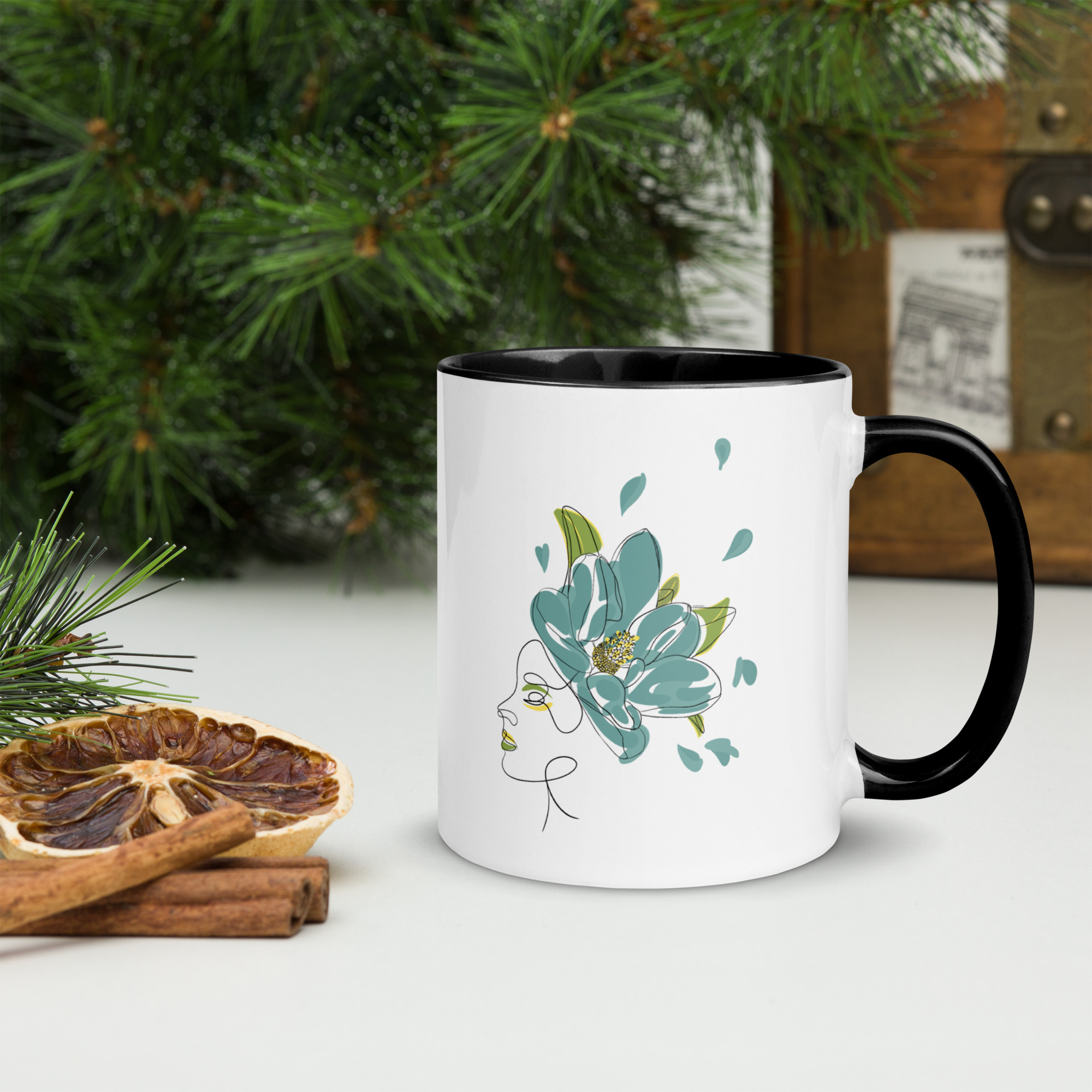Une illustration minimaliste en line art représentant une silhouette féminine ornée d’une grande fleur stylisée aux pétales bleu-vert et aux détails dorés.
