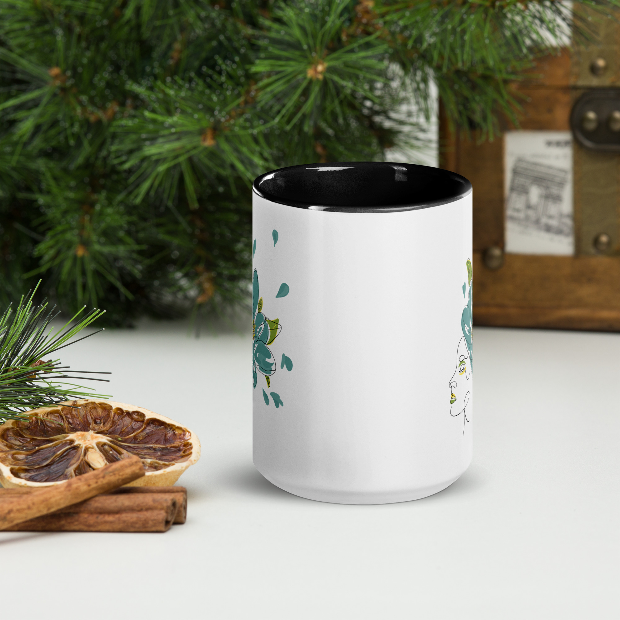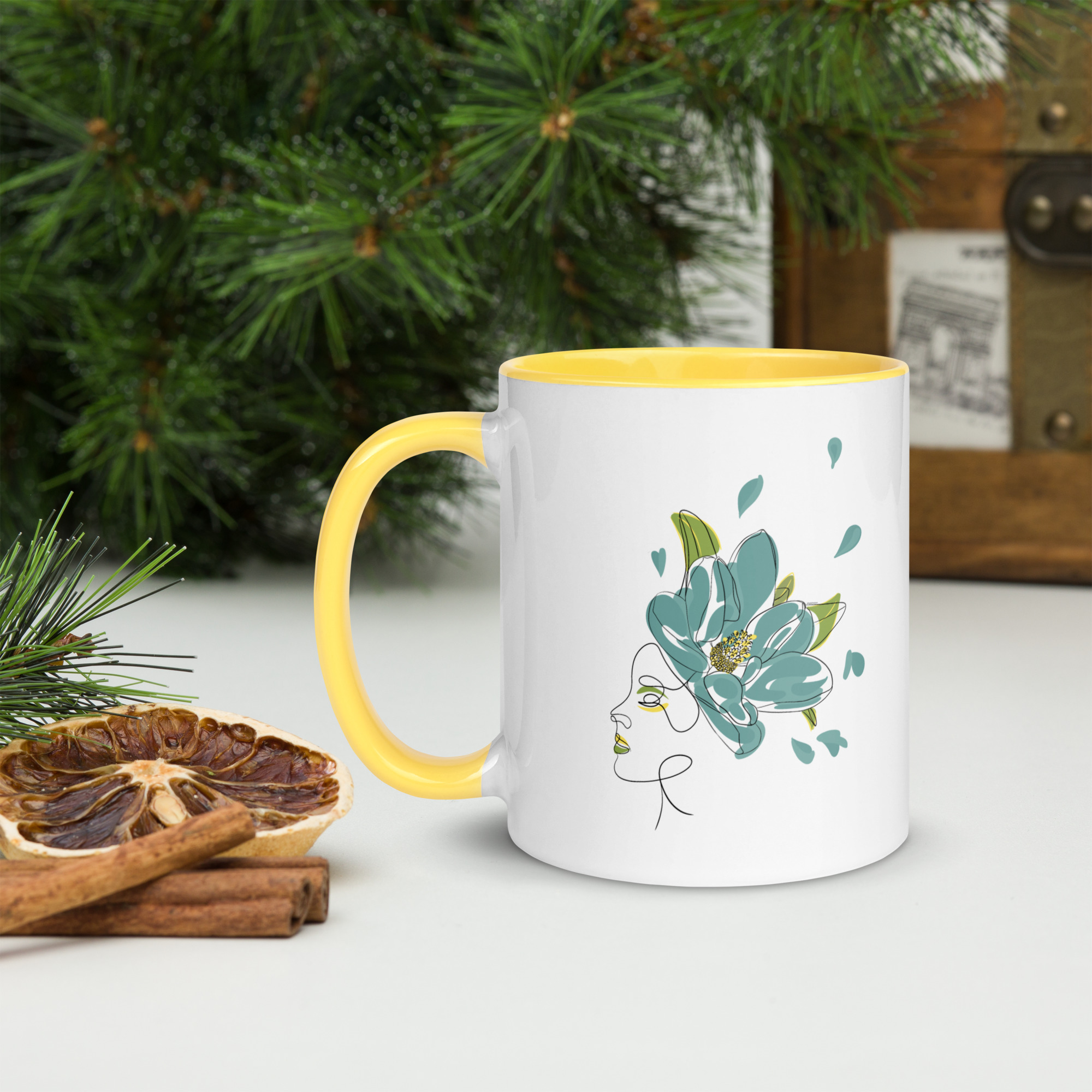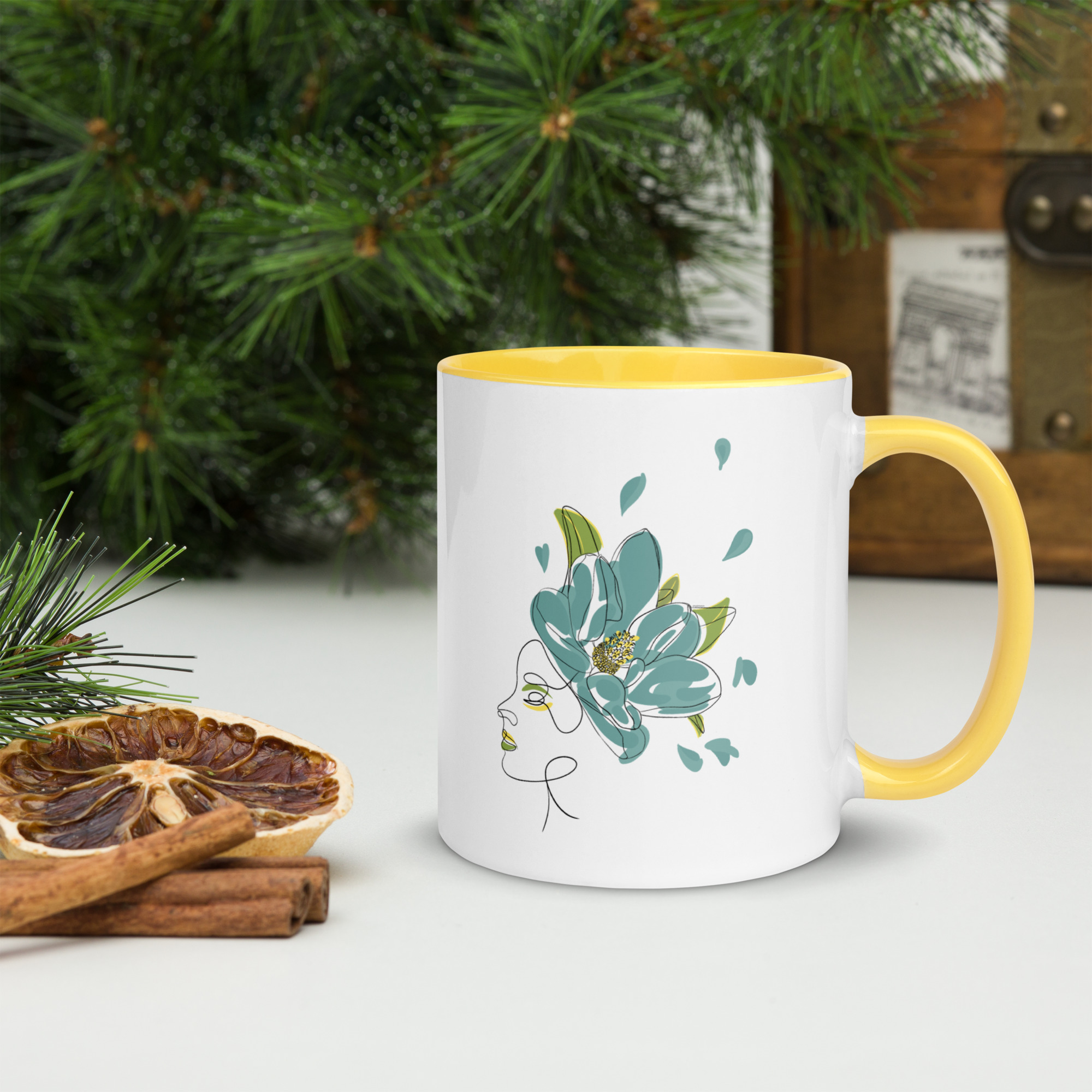 Une illustration minimaliste en line art représentant une silhouette féminine ornée d’une grande fleur stylisée aux pétales bleu-vert et aux détails dorés.