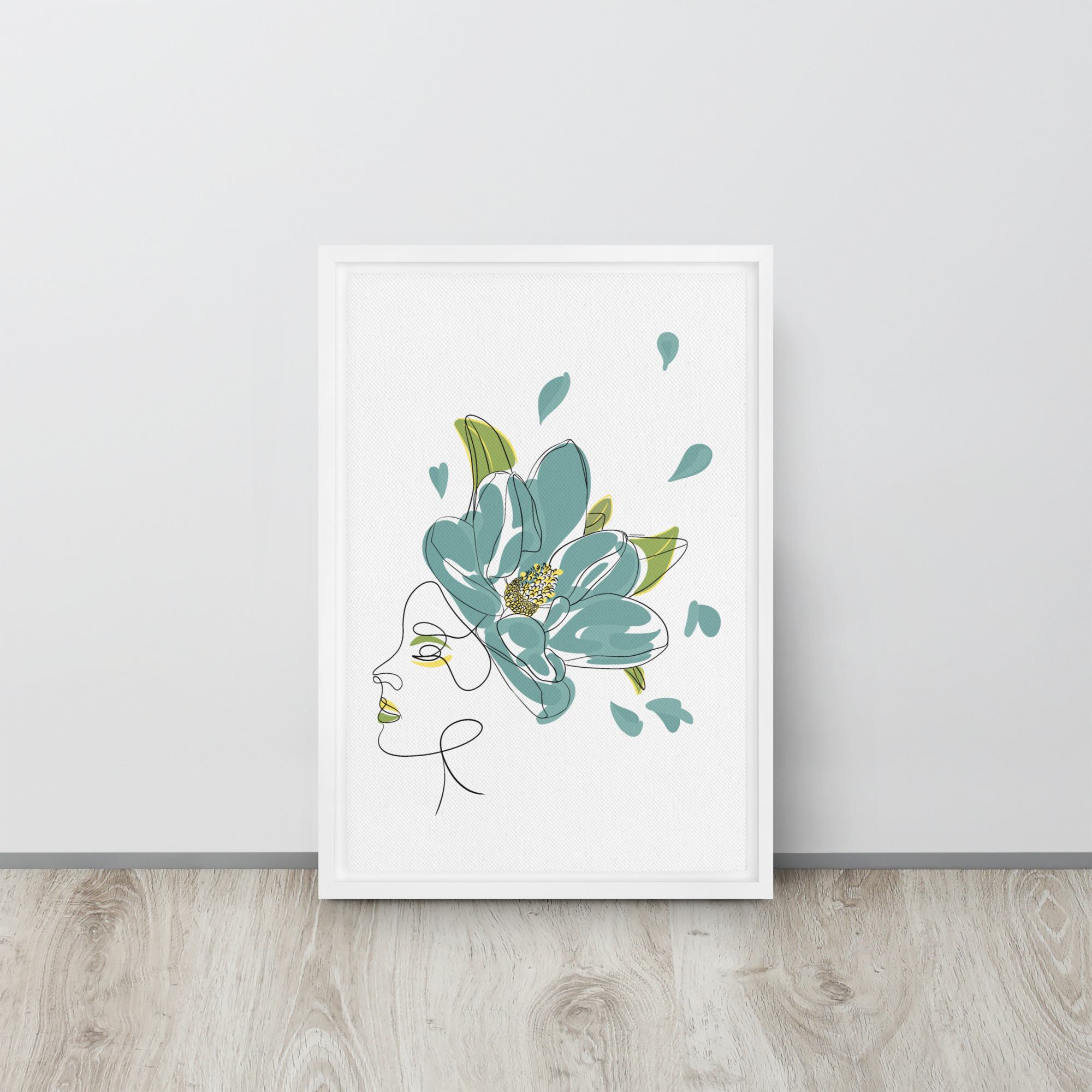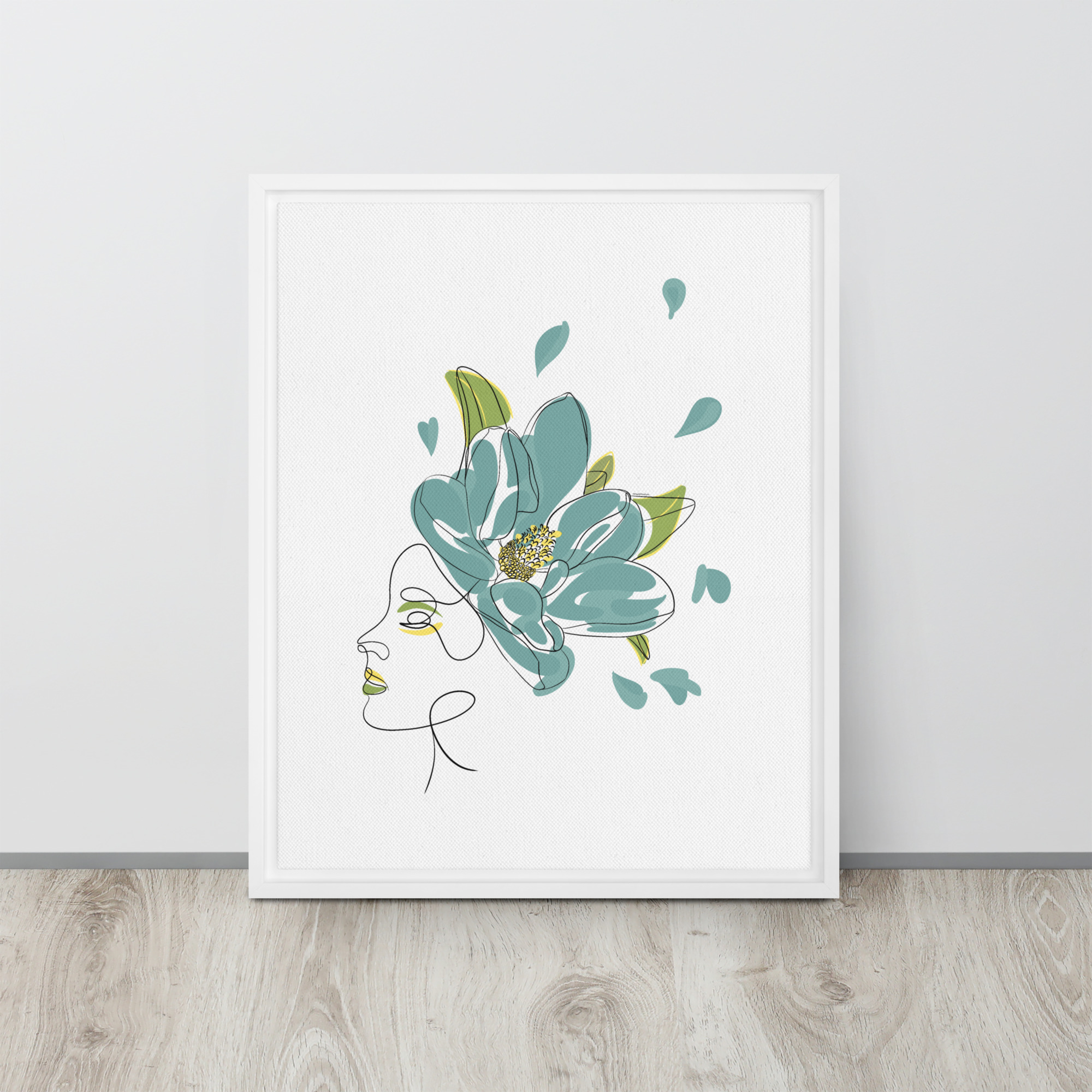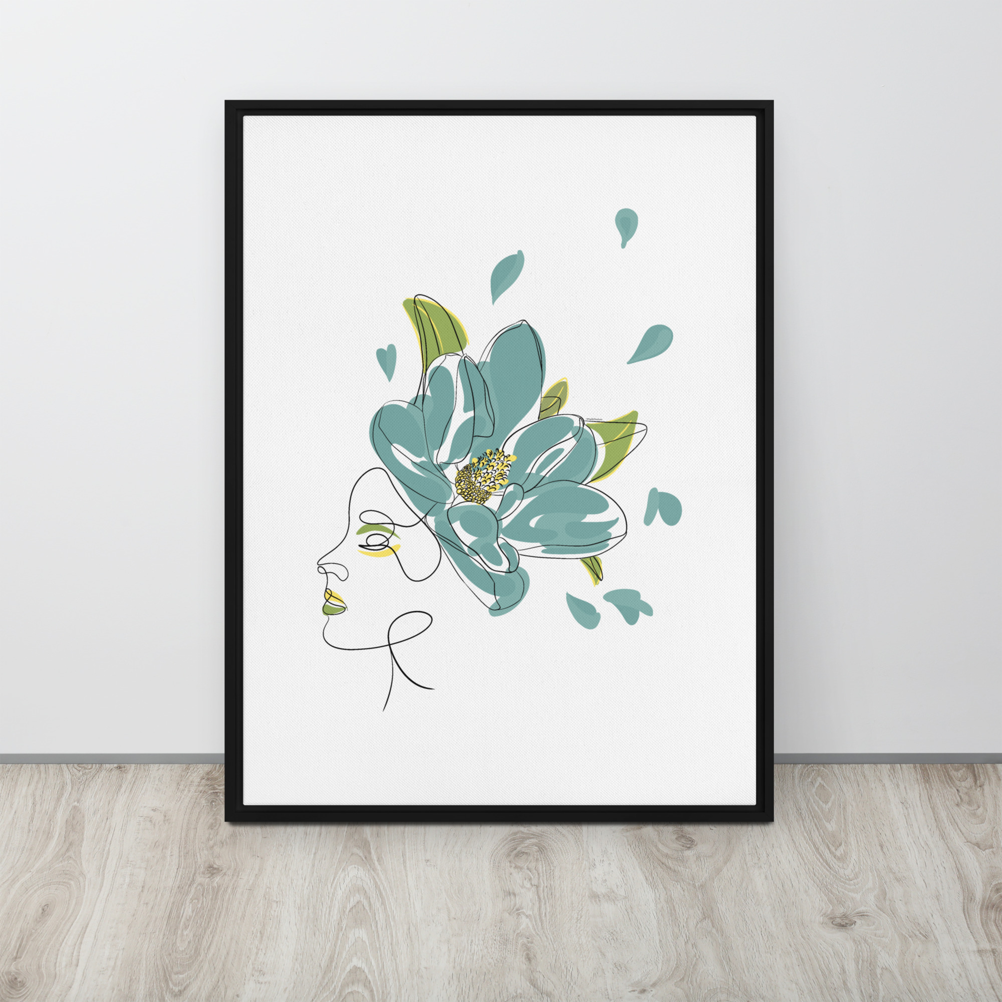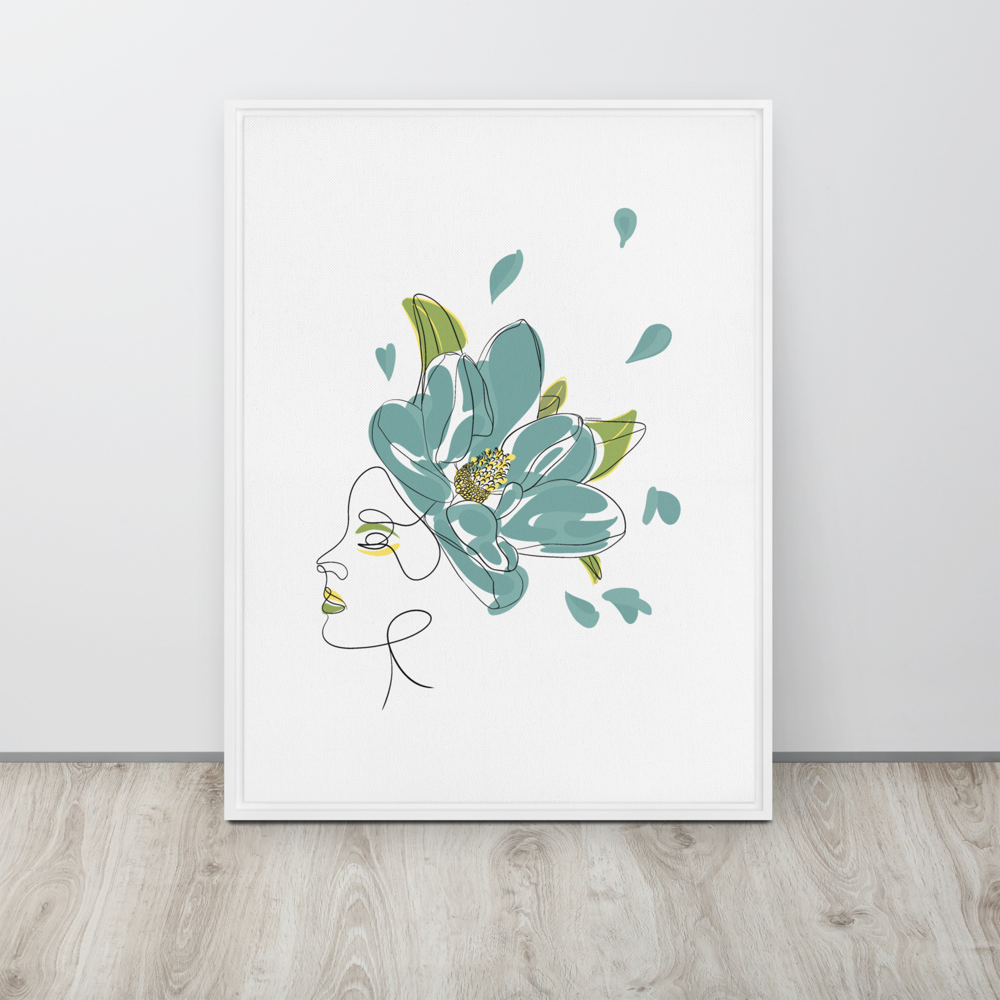 Une illustration minimaliste en line art représentant une silhouette féminine ornée d’une grande fleur stylisée aux pétales bleu-vert et aux détails dorés.