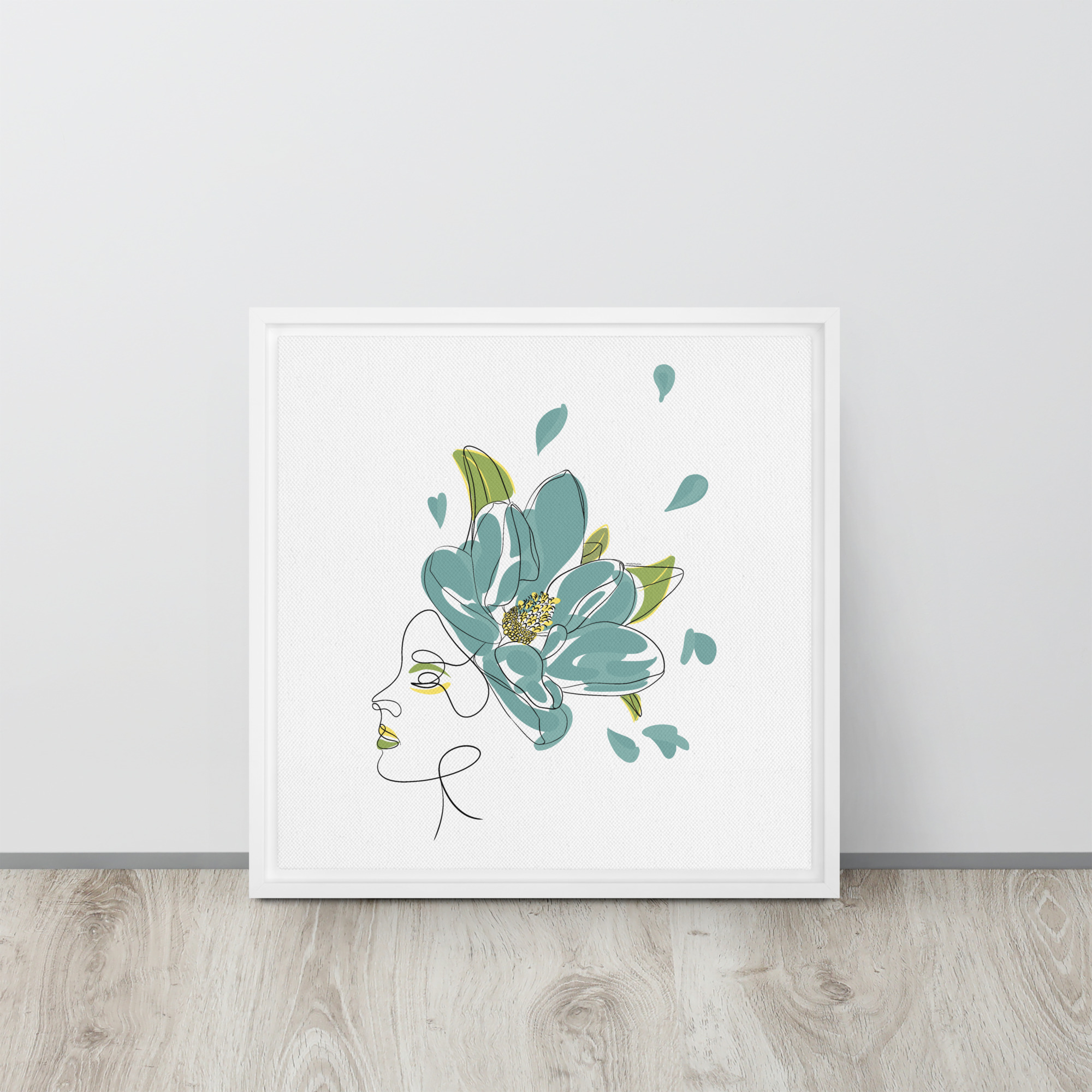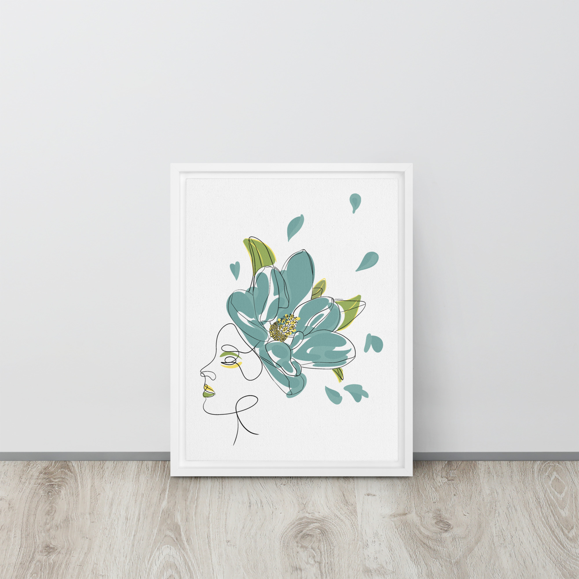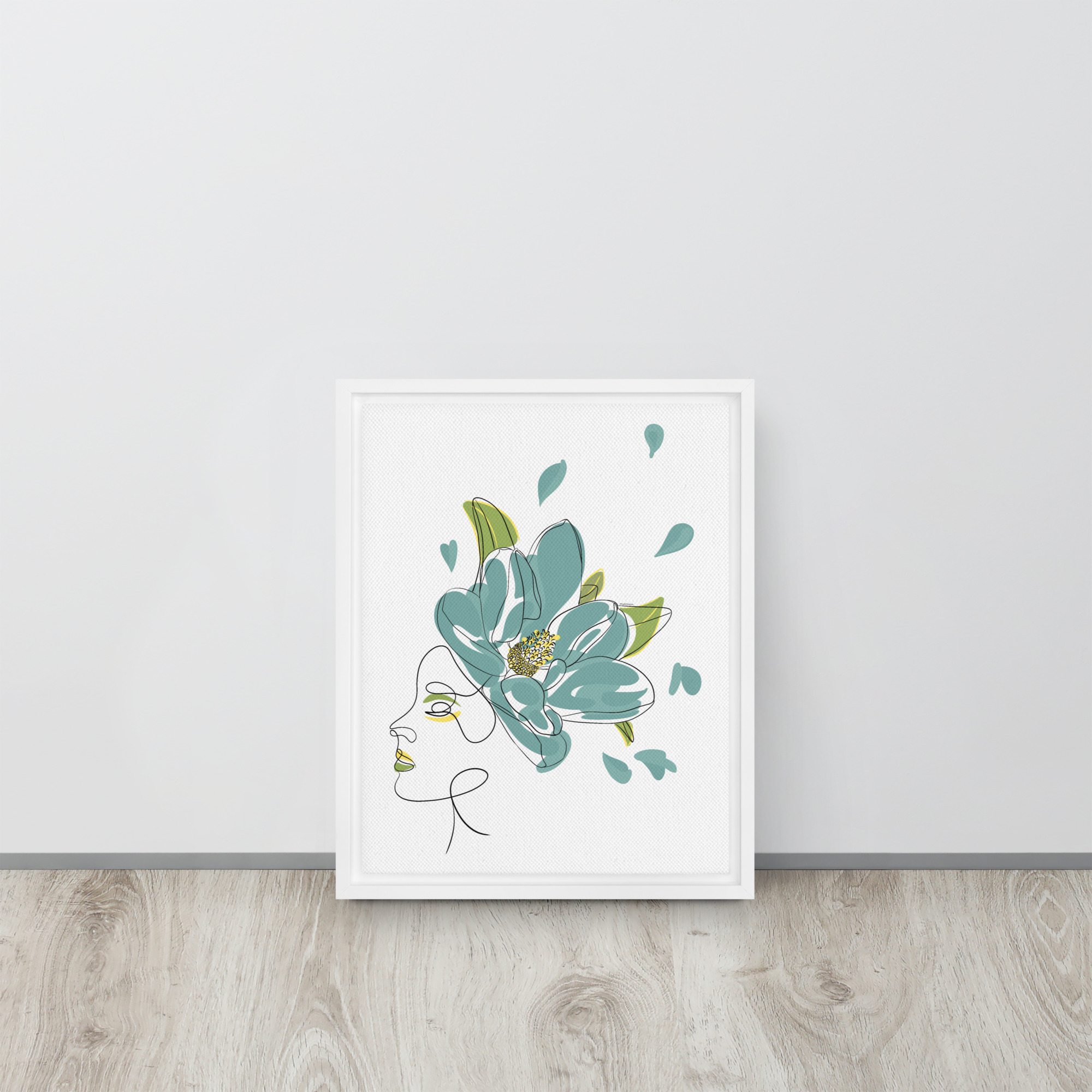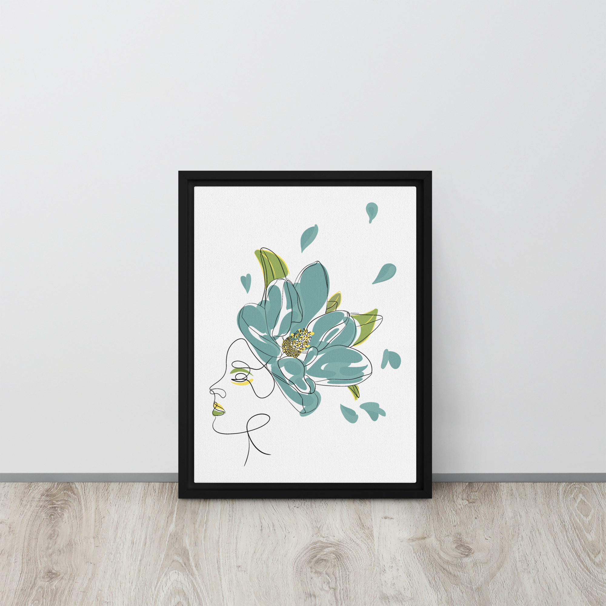 Une illustration minimaliste en line art représentant une silhouette féminine ornée d’une grande fleur stylisée aux pétales bleu-vert et aux détails dorés.