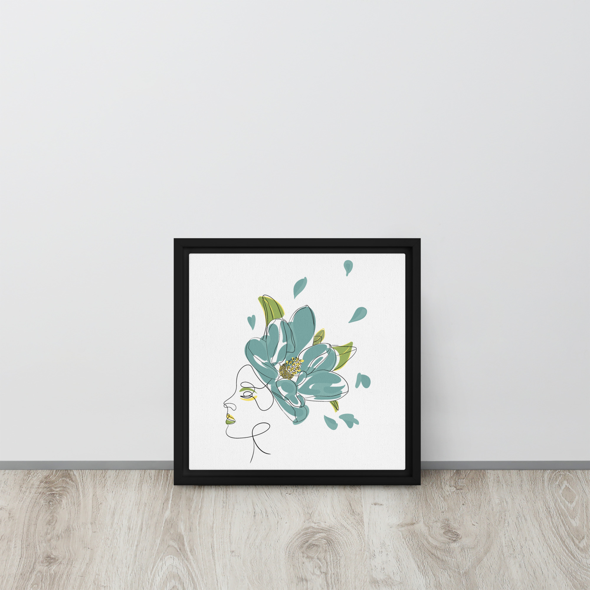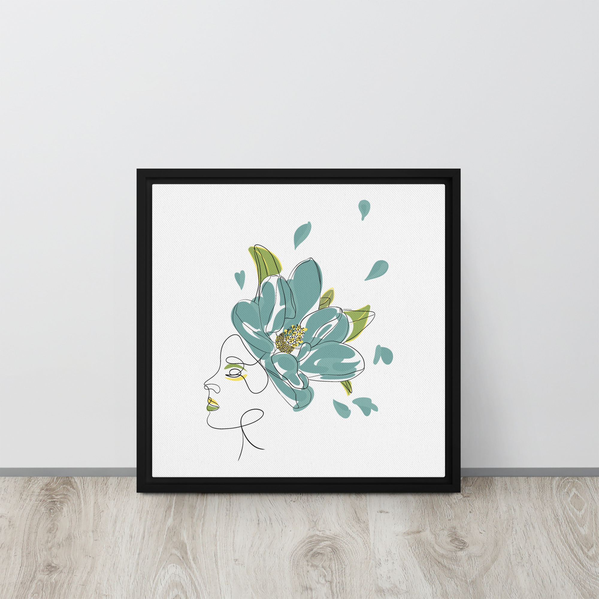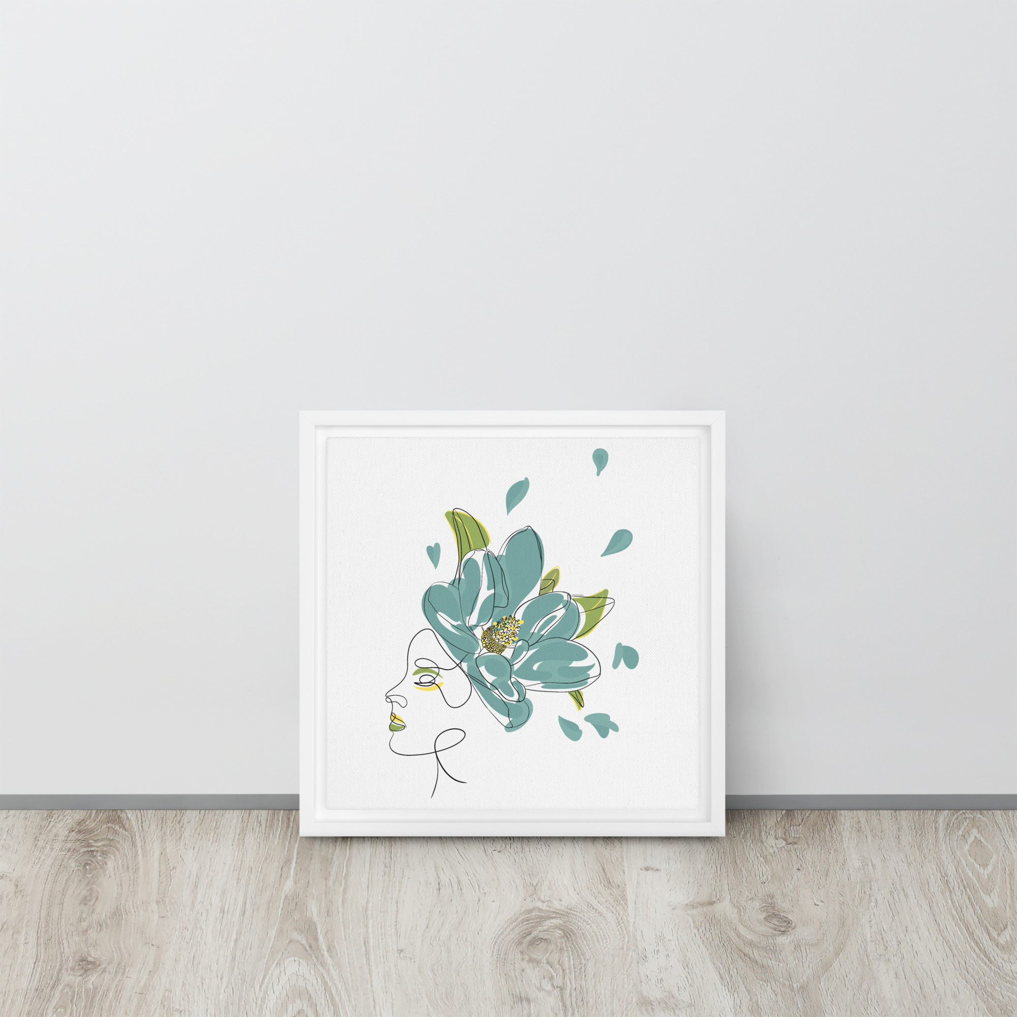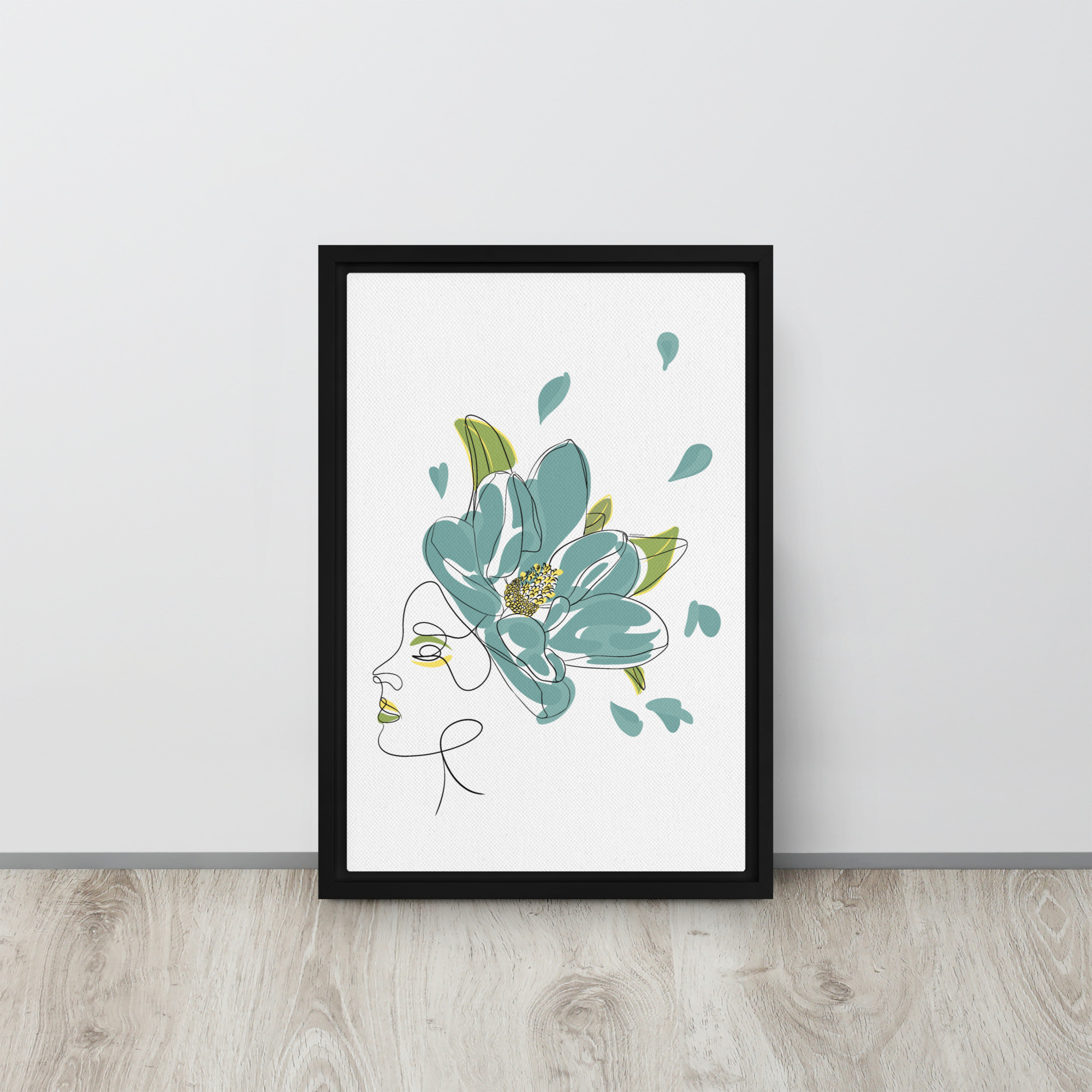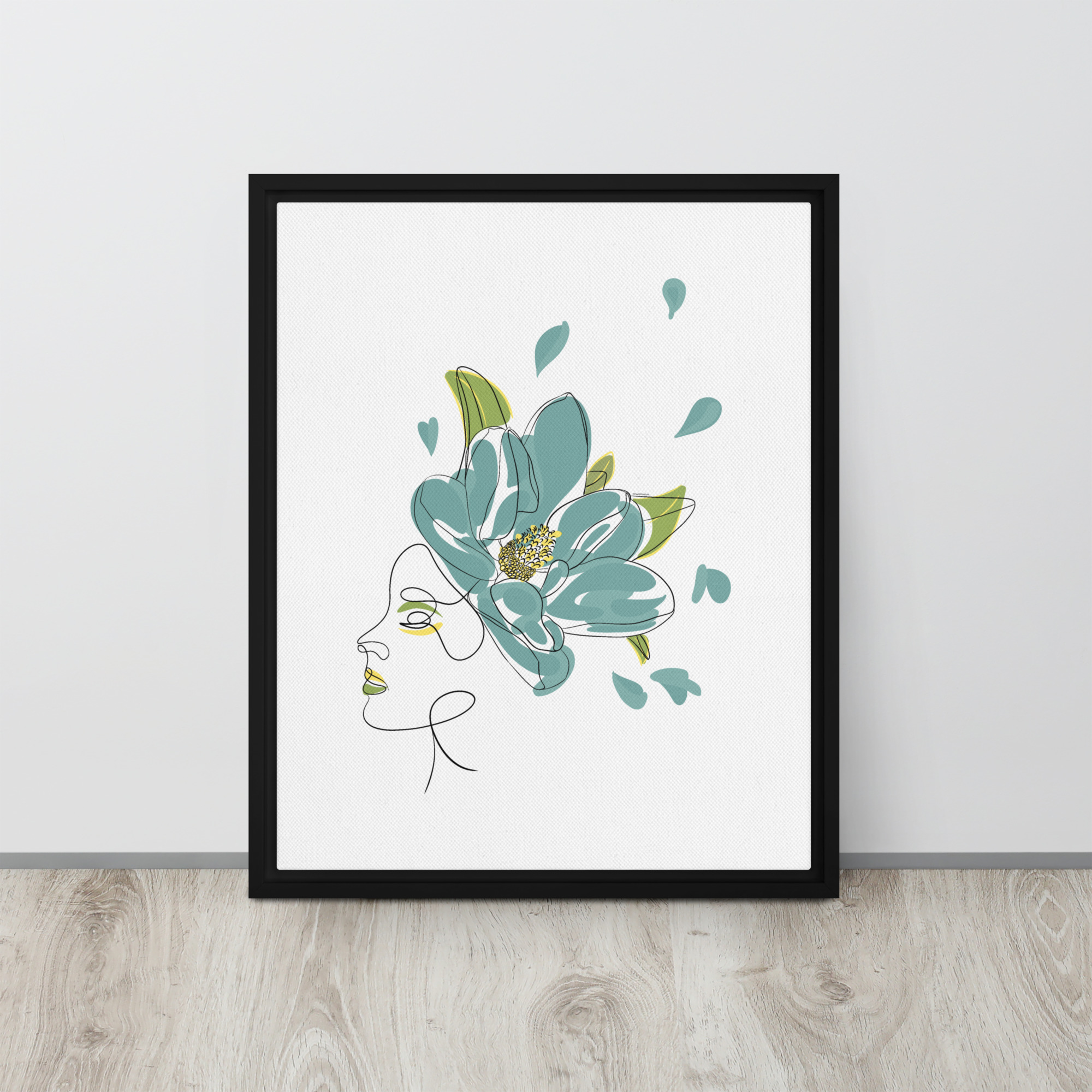 Une illustration minimaliste en line art représentant une silhouette féminine ornée d’une grande fleur stylisée aux pétales bleu-vert et aux détails dorés.