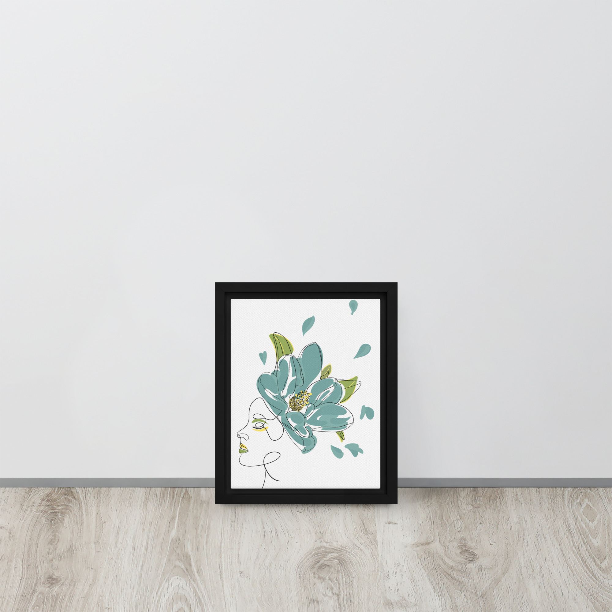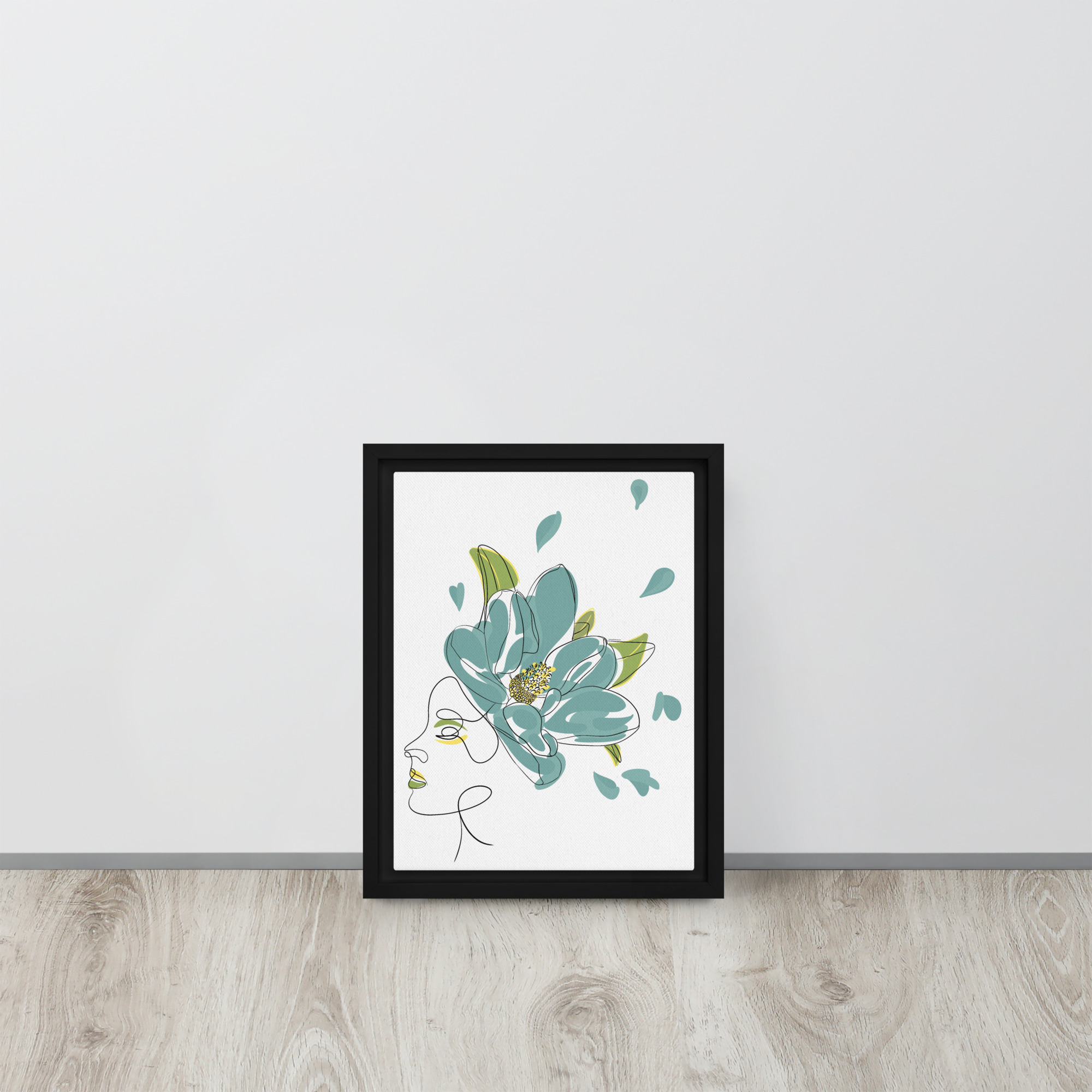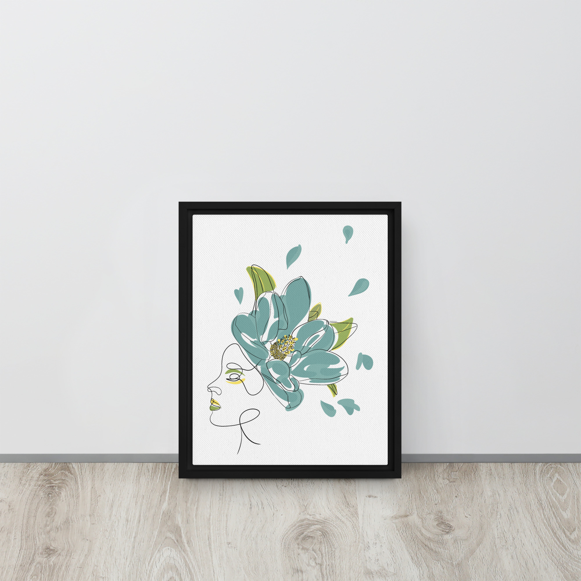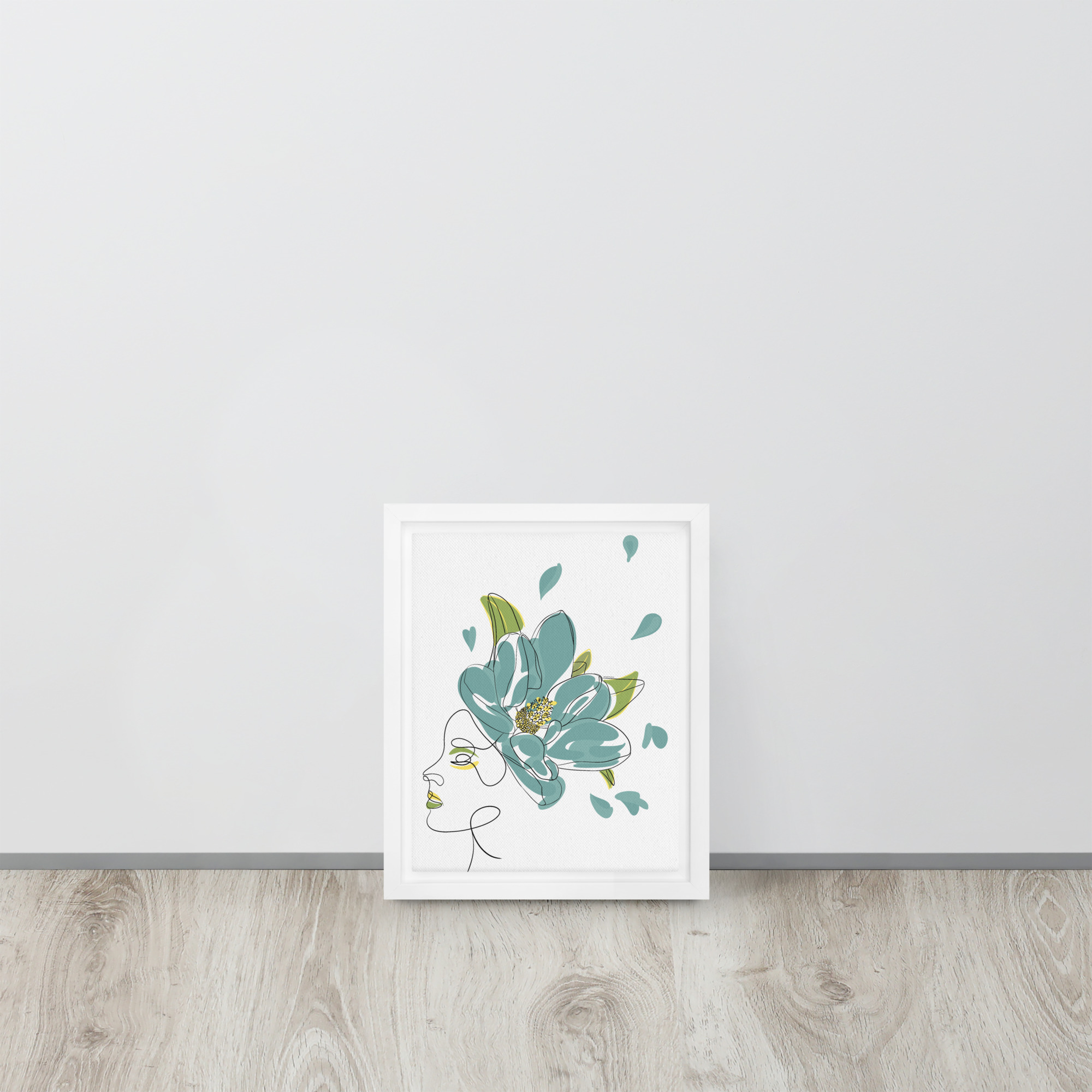 Une illustration minimaliste en line art représentant une silhouette féminine ornée d’une grande fleur stylisée aux pétales bleu-vert et aux détails dorés.