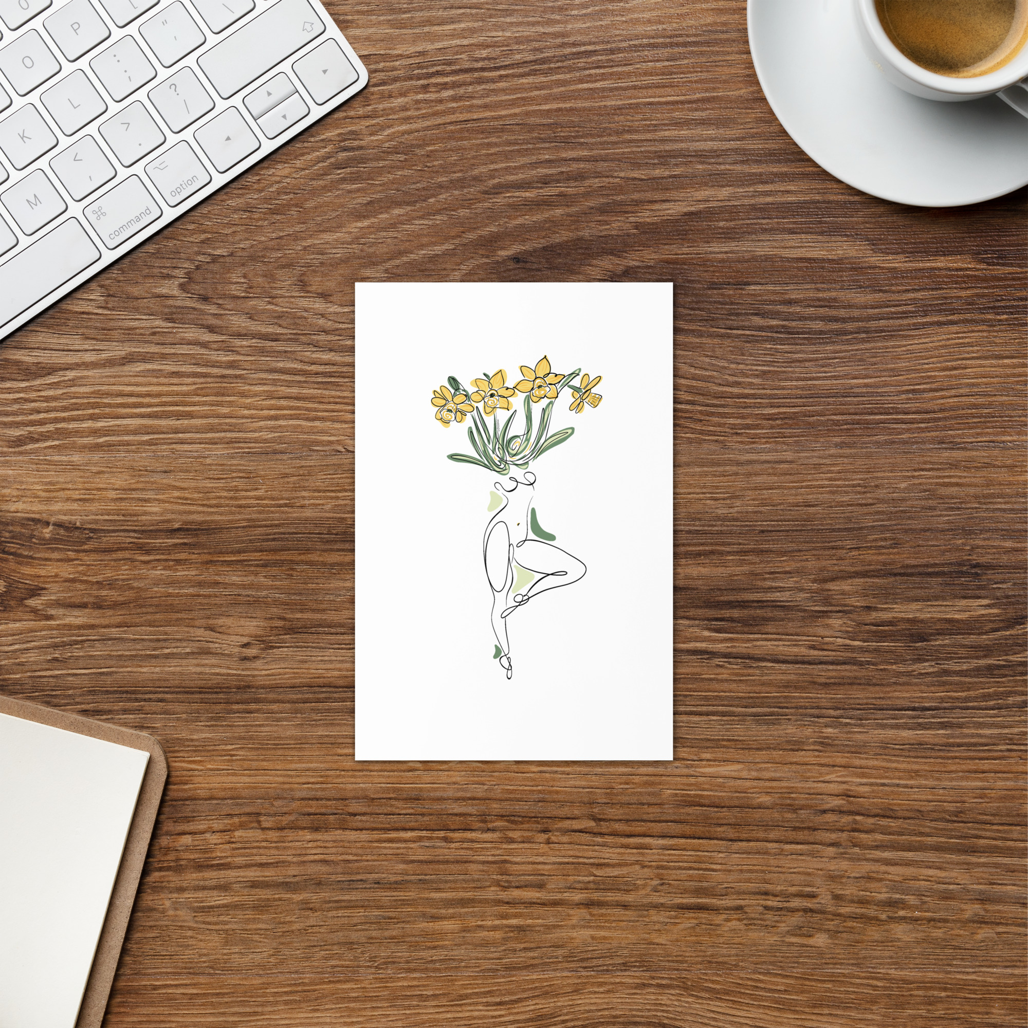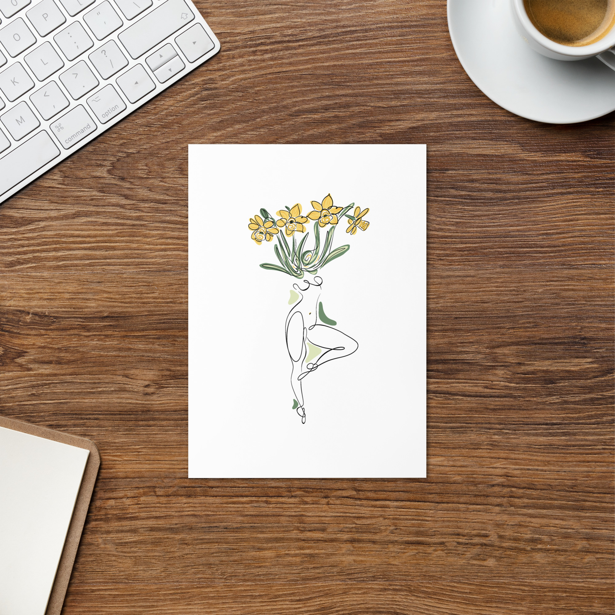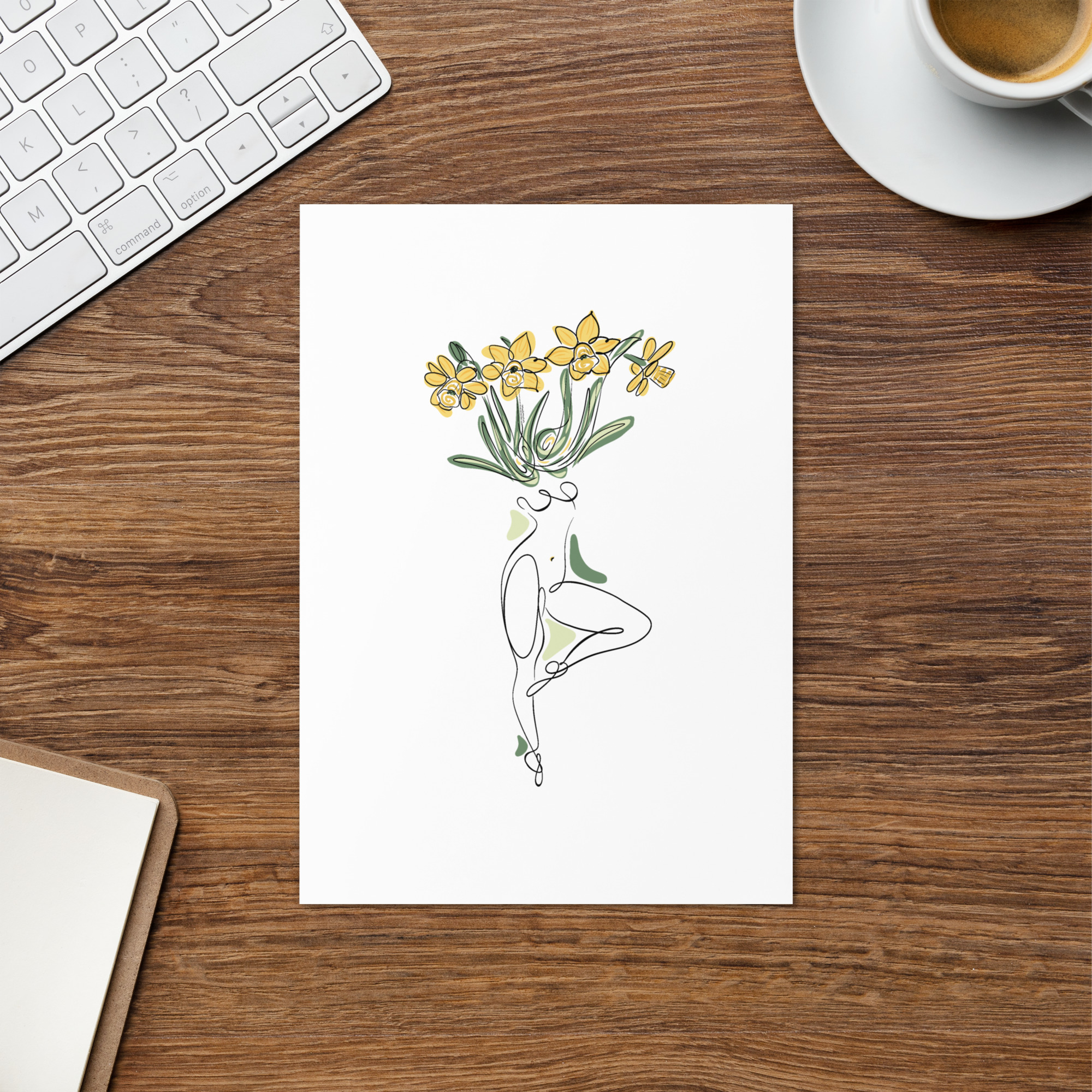 Une illustration minimaliste en line art représentant une silhouette féminine ornée de jonquilles jaunes, symbole de renouveau, lumière et espoir.
