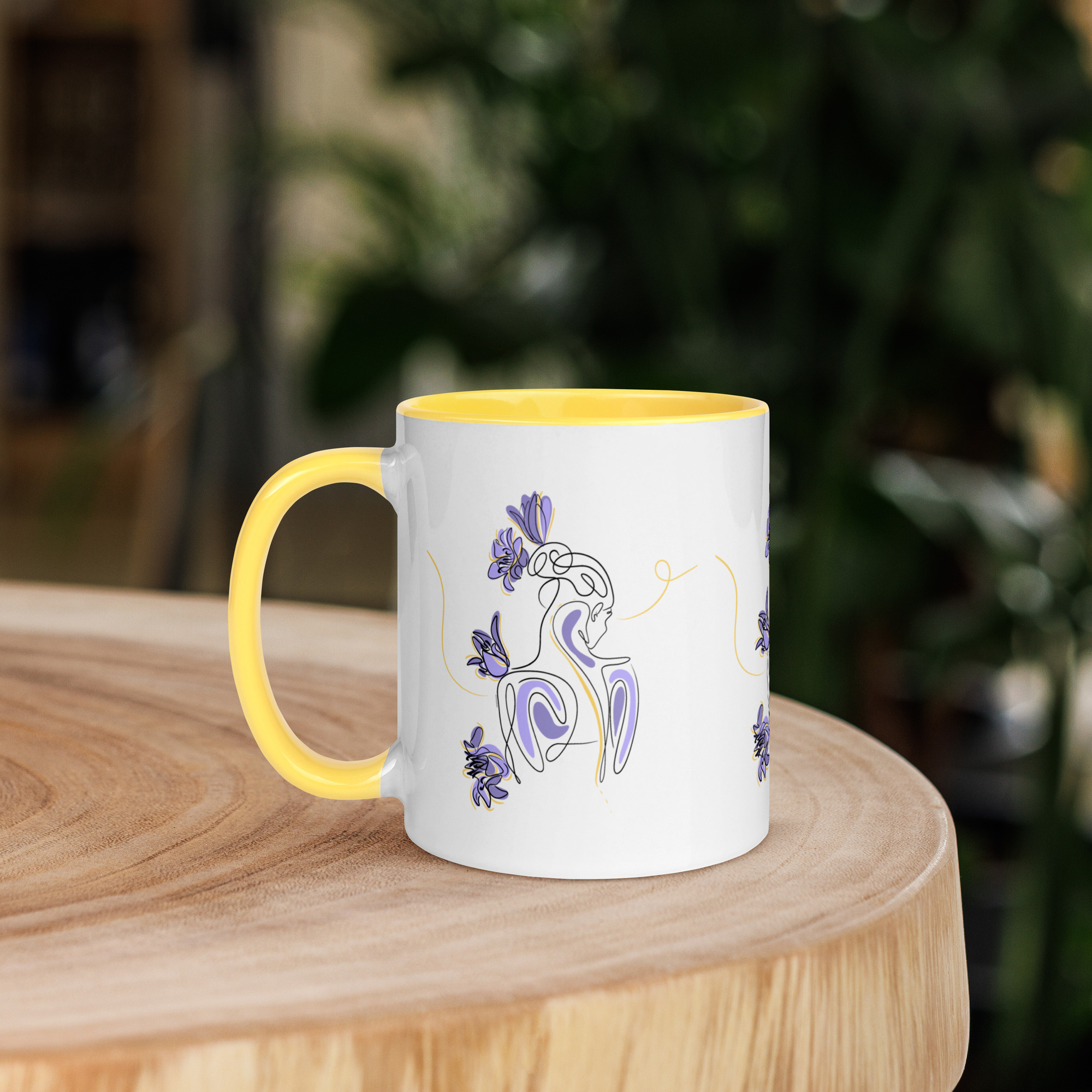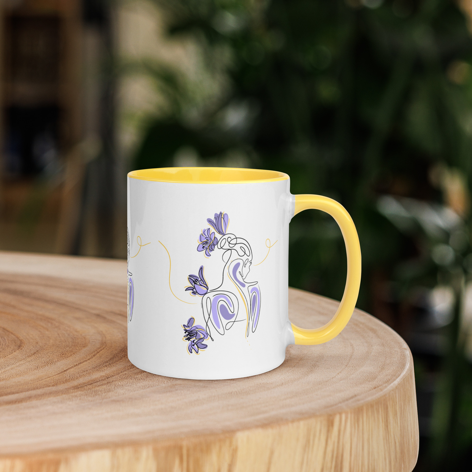 Une illustration minimaliste en line art représentant une silhouette féminine stylisée, entourée de pétales de lilas violets et de courbes dorées.