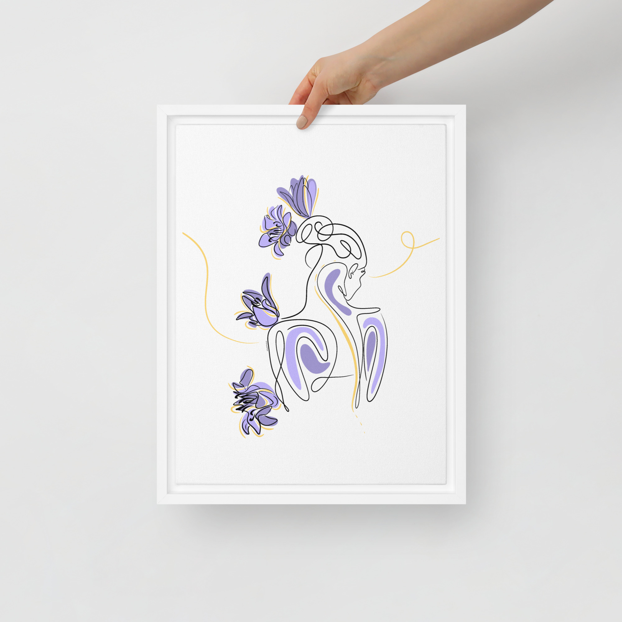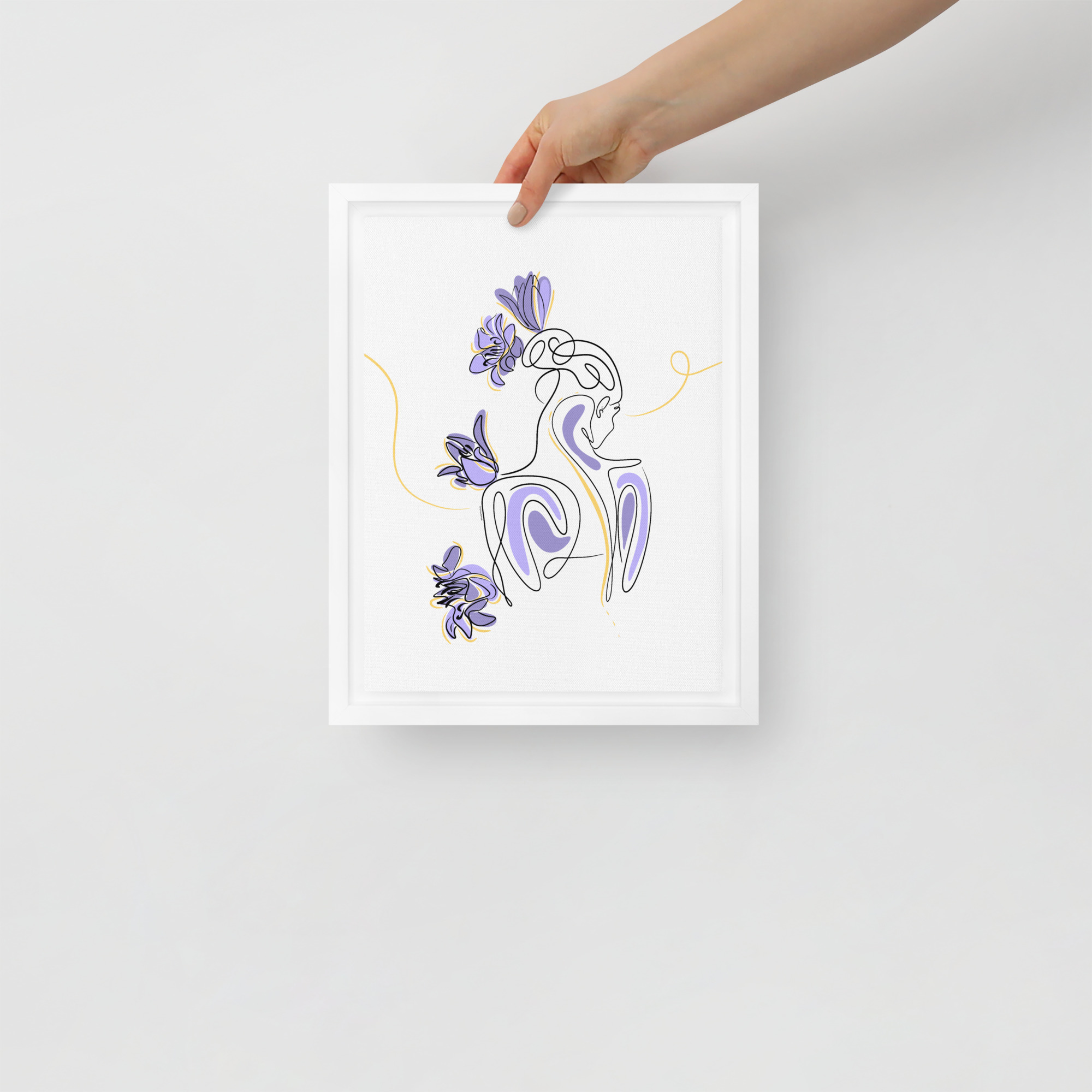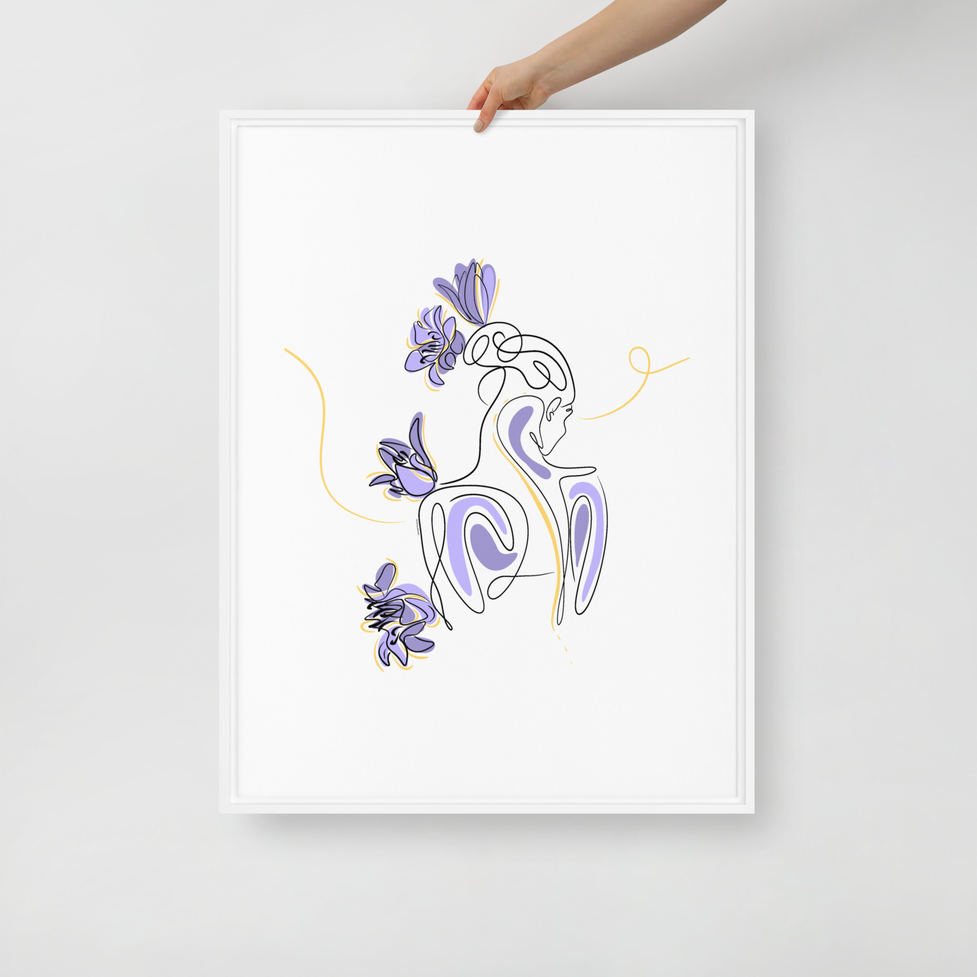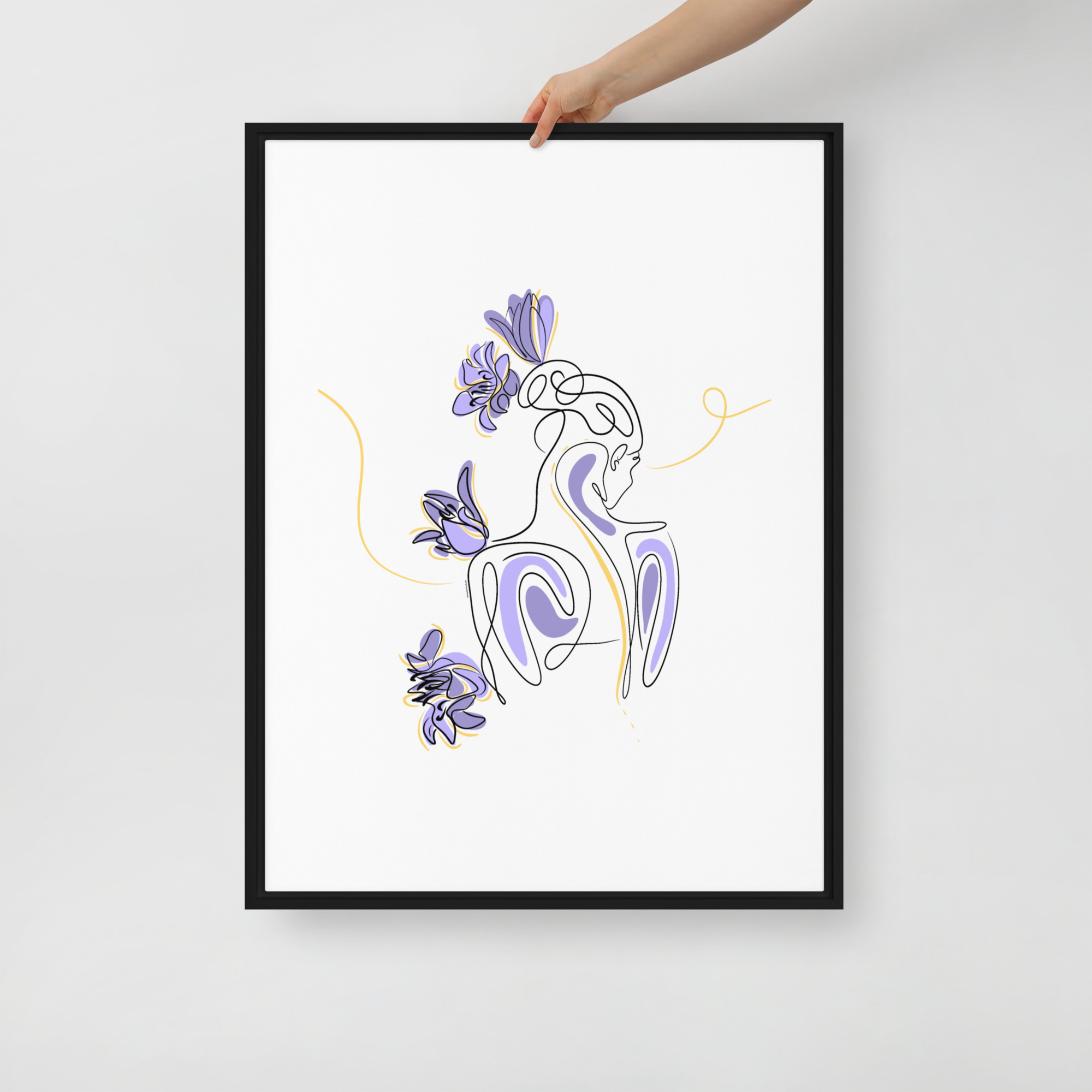 Une illustration minimaliste en line art représentant une silhouette féminine stylisée, entourée de pétales de lilas violets et de courbes dorées.