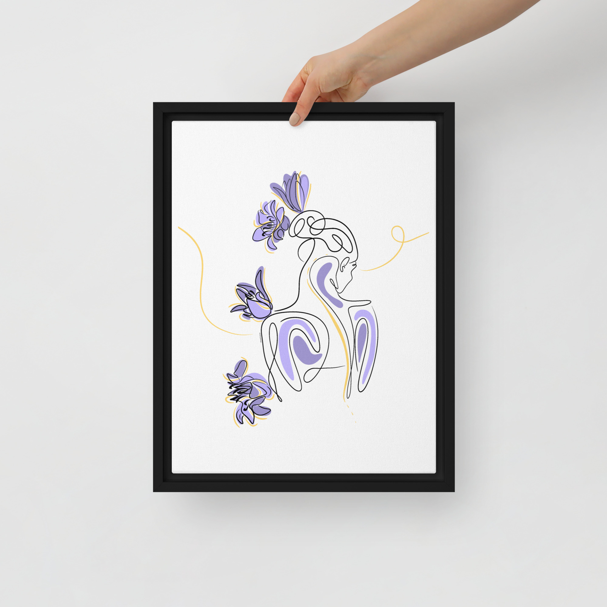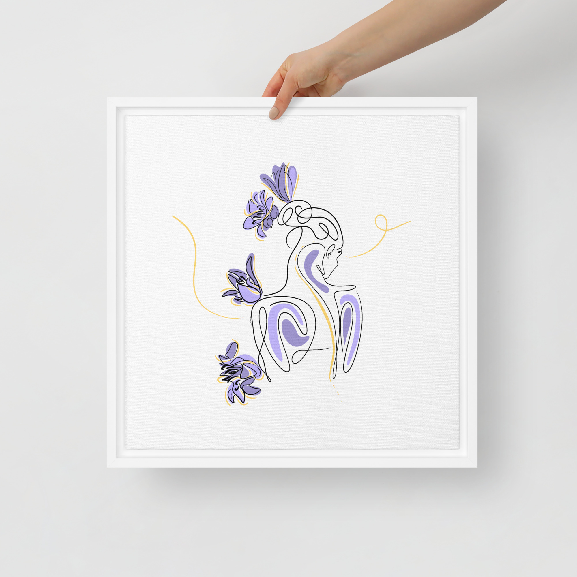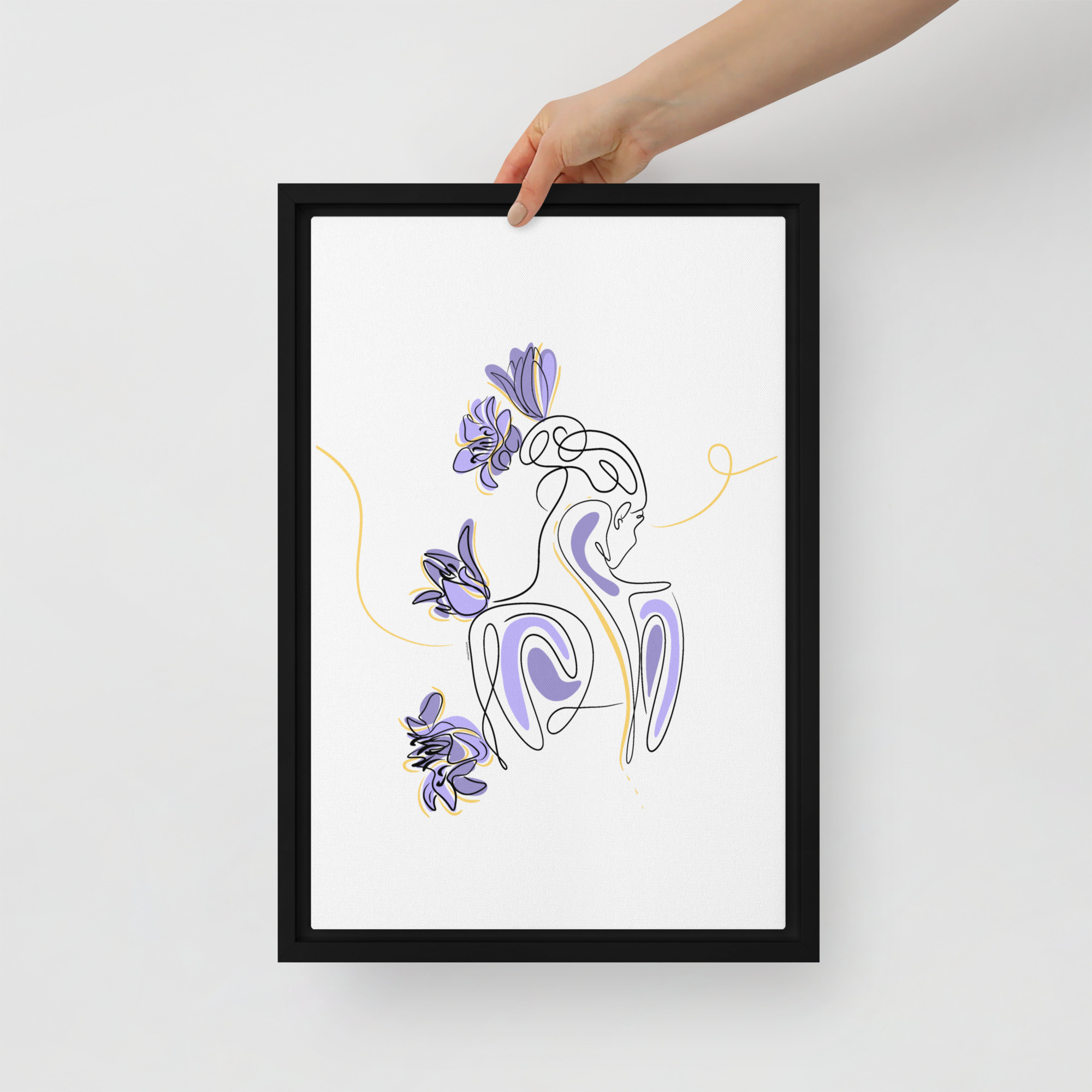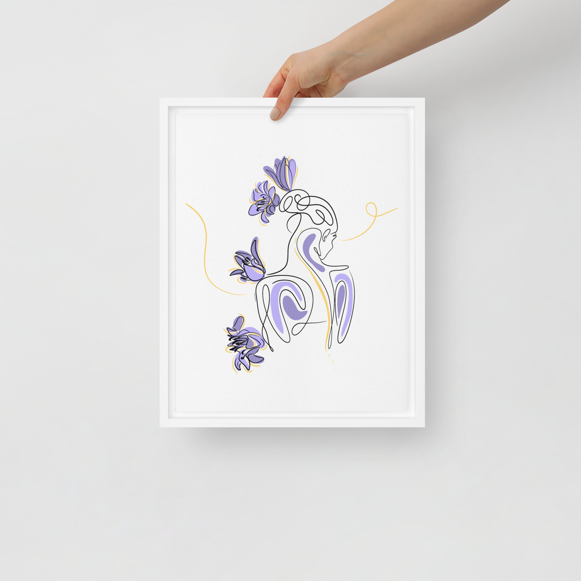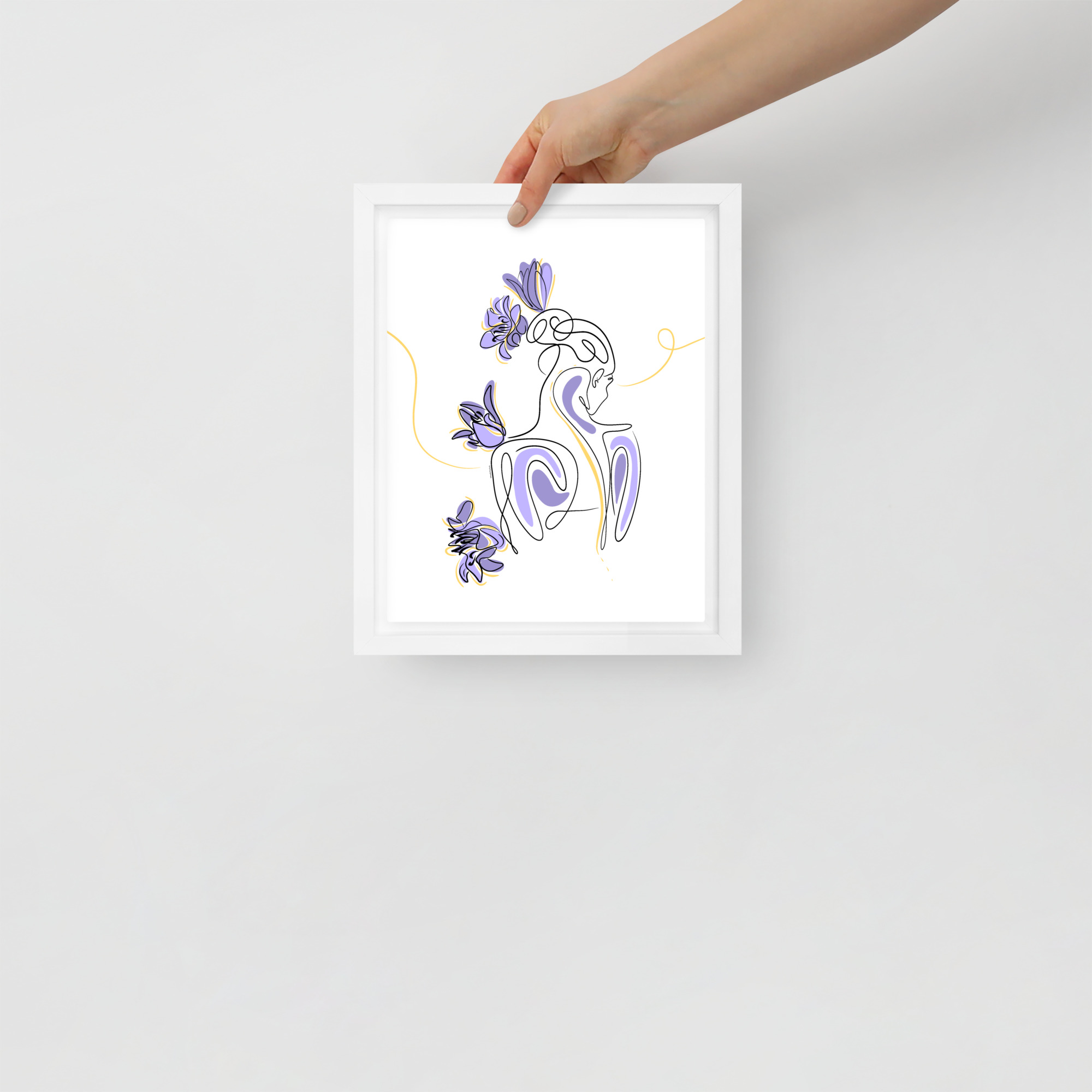 Une illustration minimaliste en line art représentant une silhouette féminine stylisée, entourée de pétales de lilas violets et de courbes dorées.