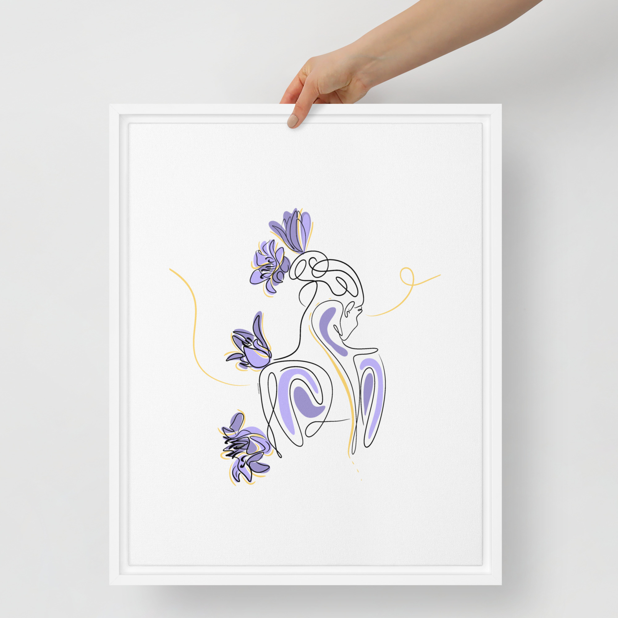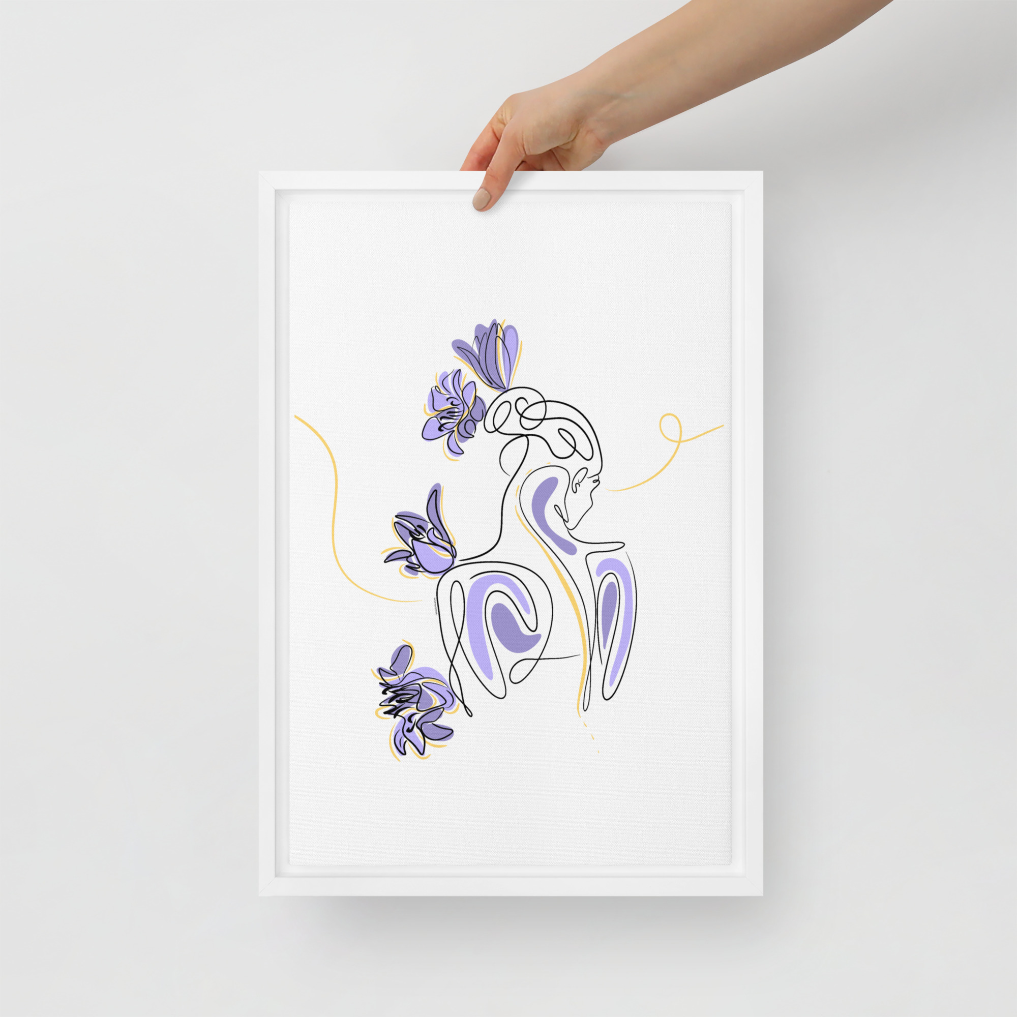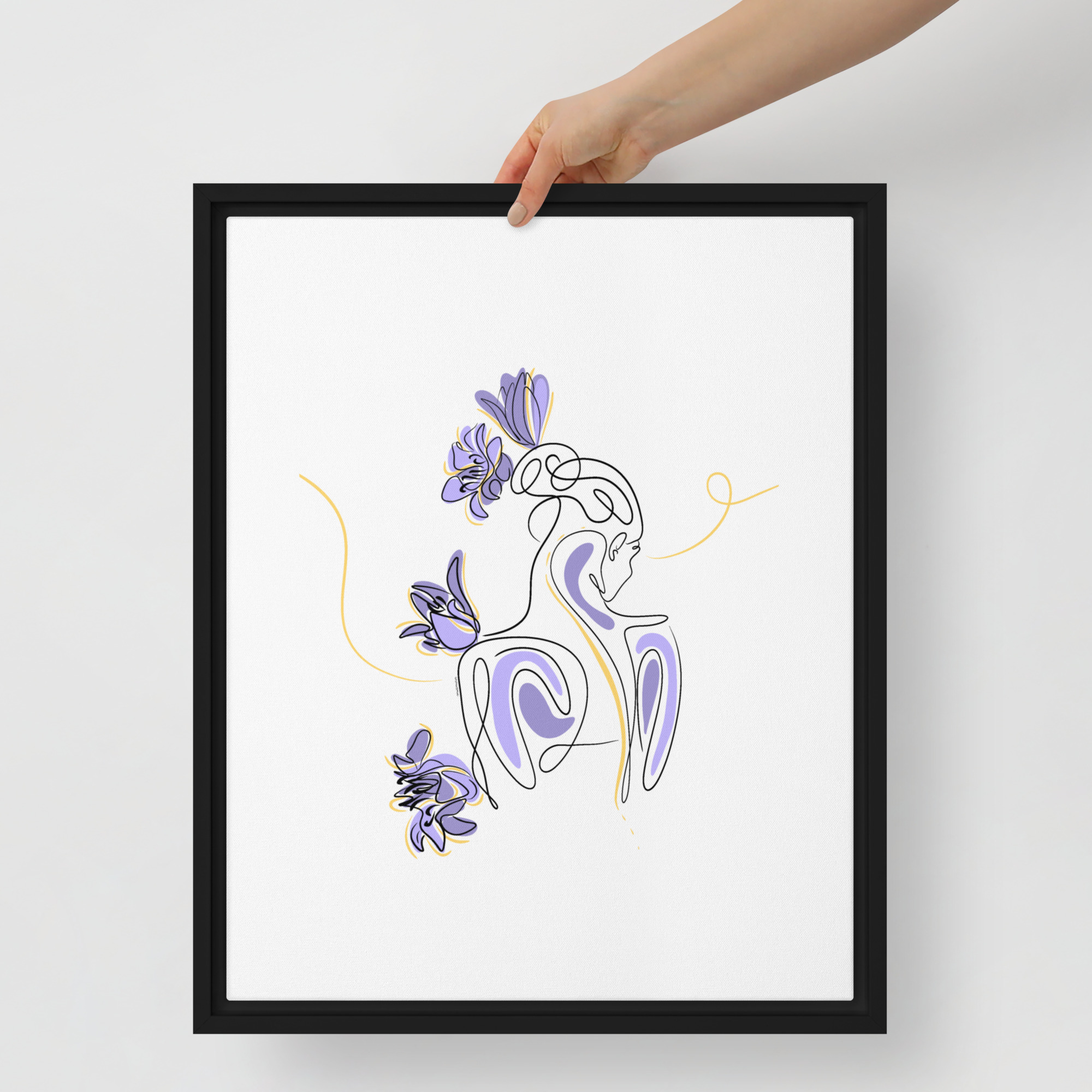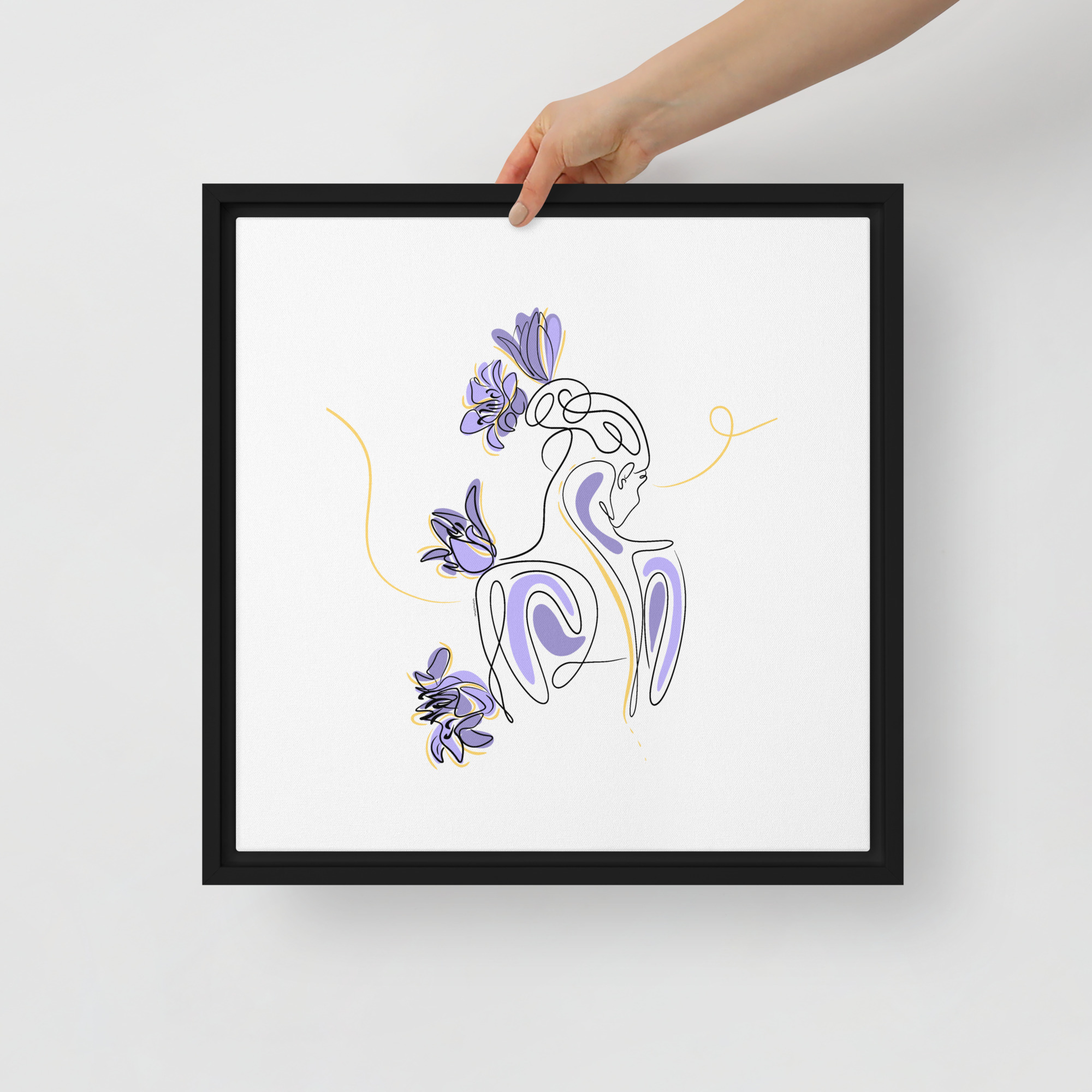 Une illustration minimaliste en line art représentant une silhouette féminine stylisée, entourée de pétales de lilas violets et de courbes dorées.