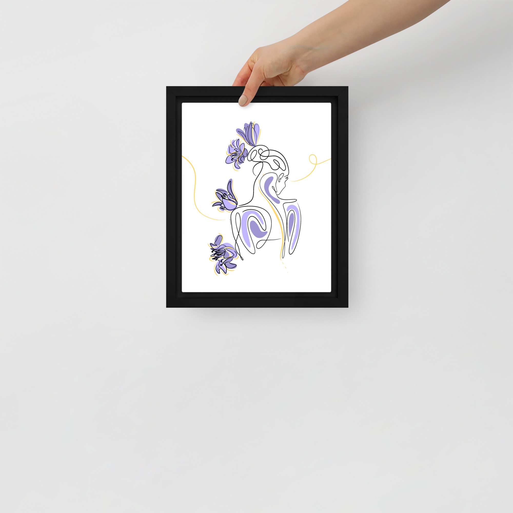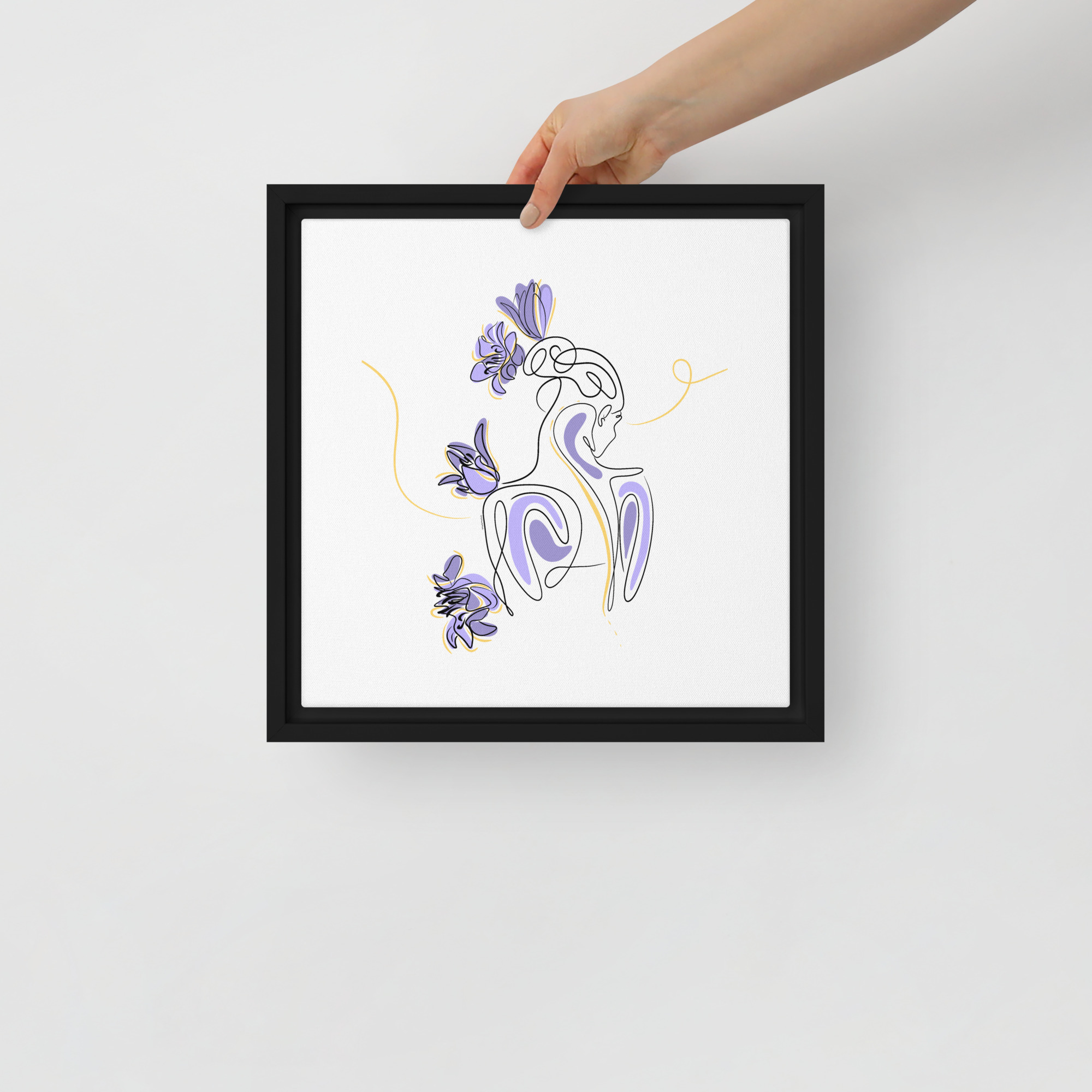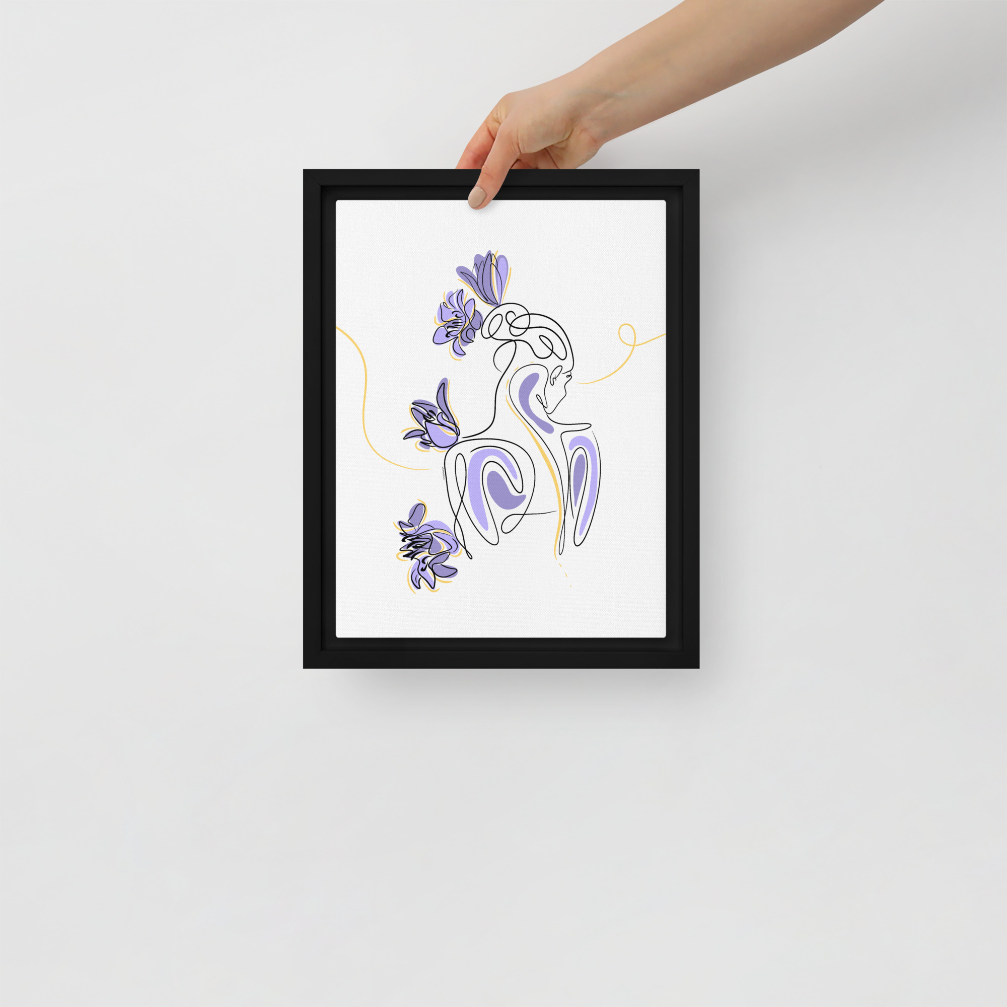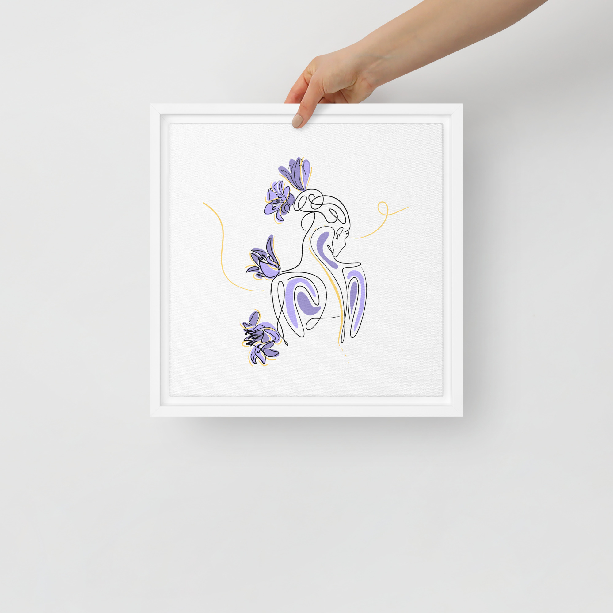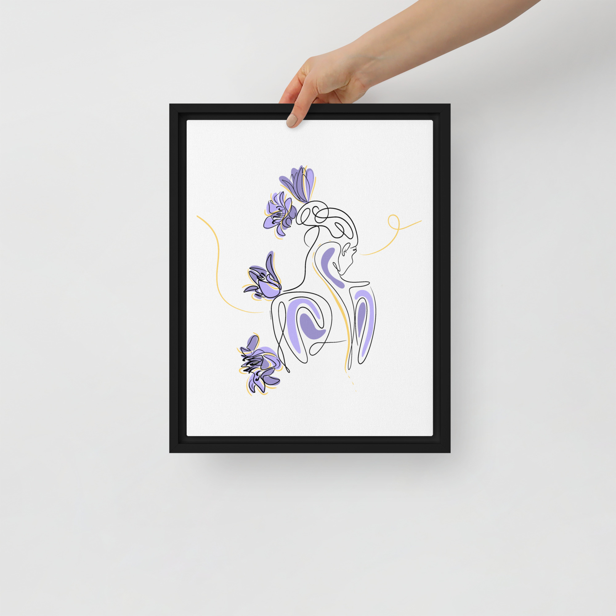 Une illustration minimaliste en line art représentant une silhouette féminine stylisée, entourée de pétales de lilas violets et de courbes dorées.