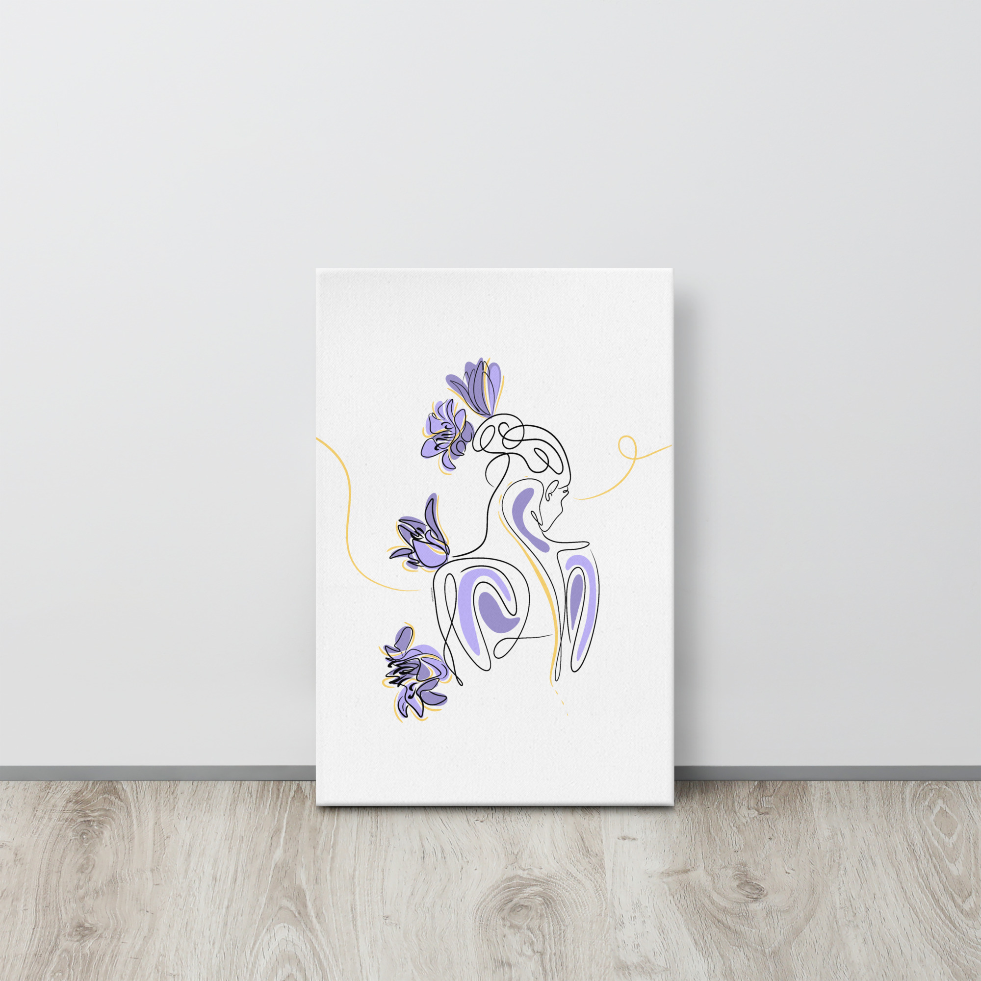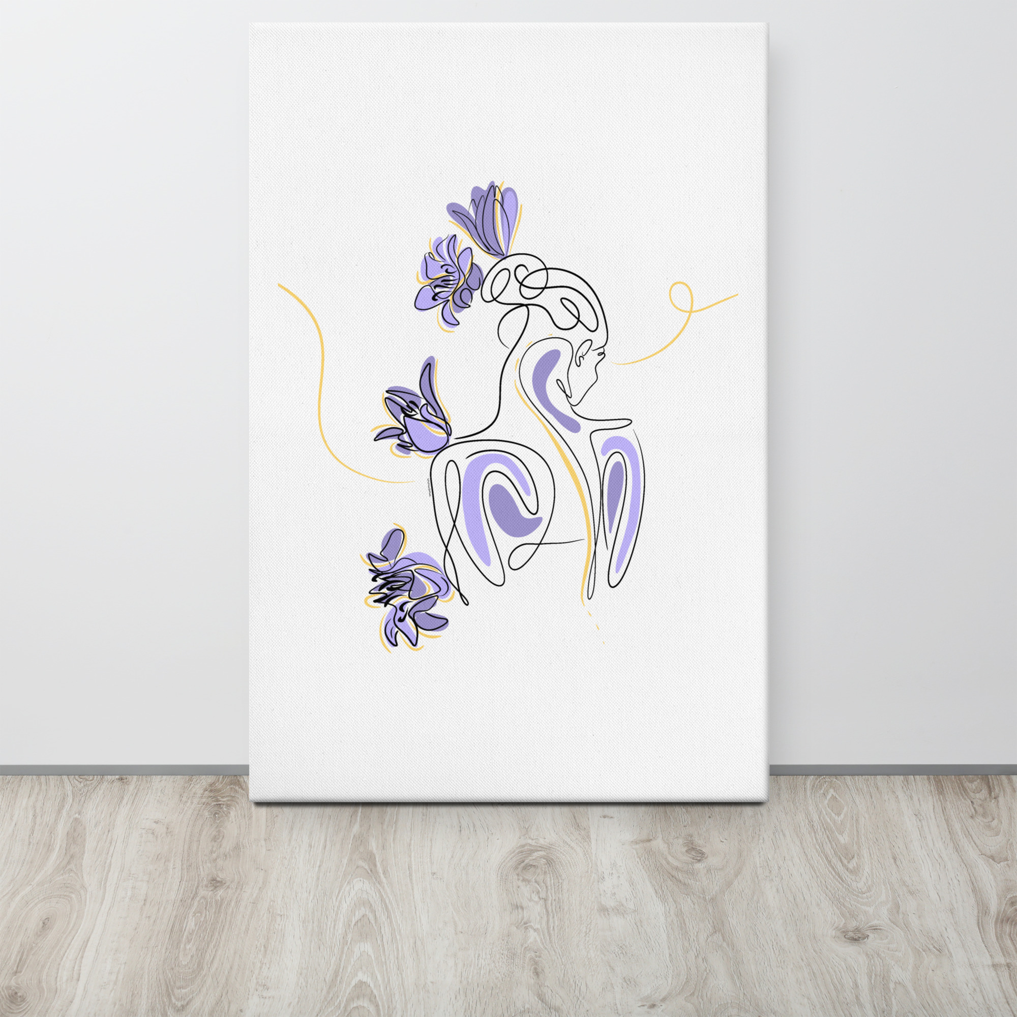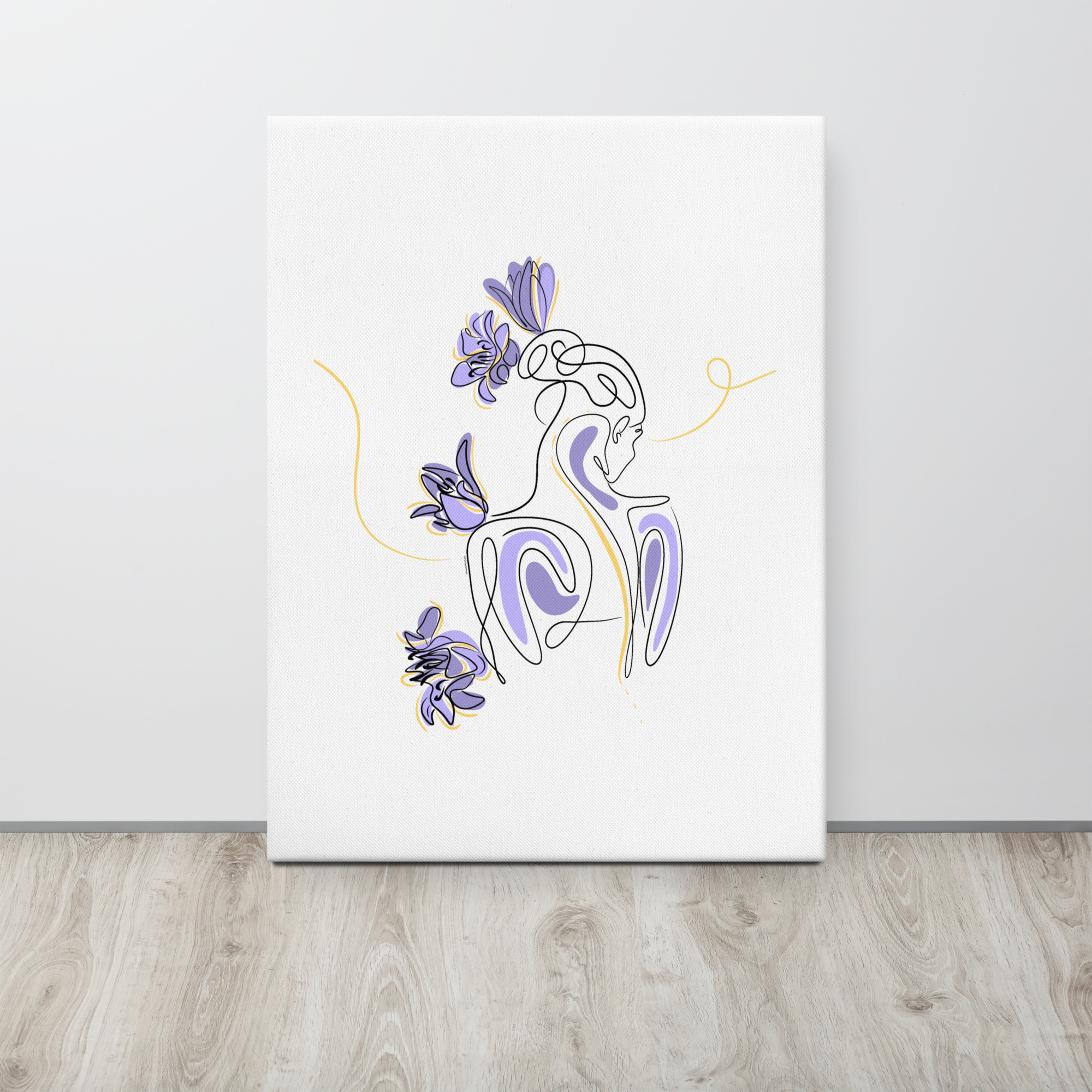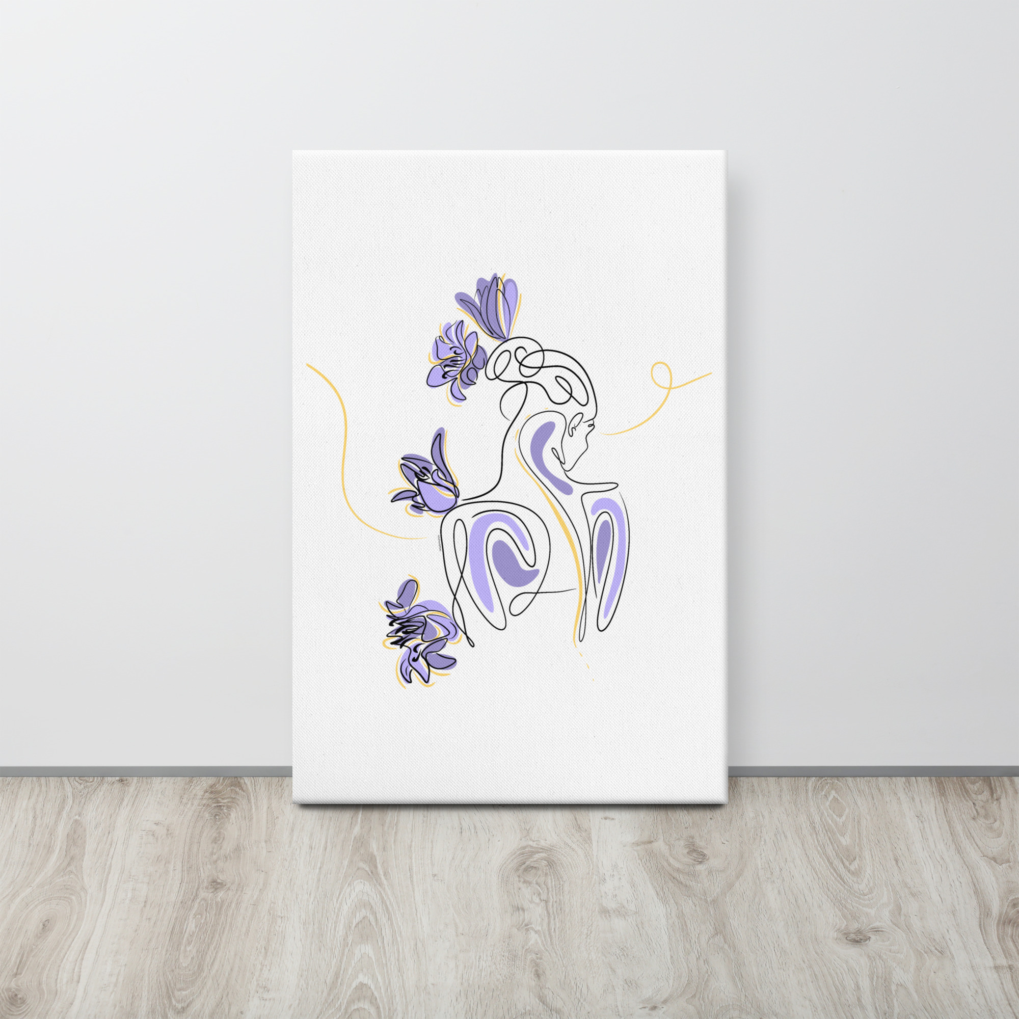 Une illustration minimaliste en line art représentant une silhouette féminine stylisée, entourée de pétales de lilas violets et de courbes dorées.