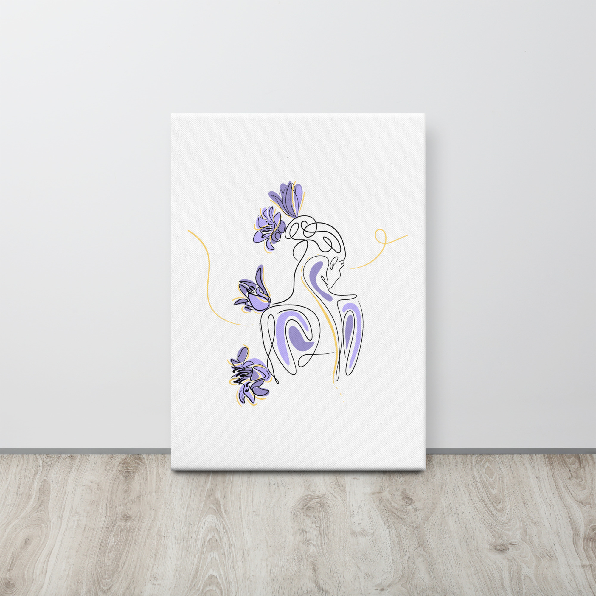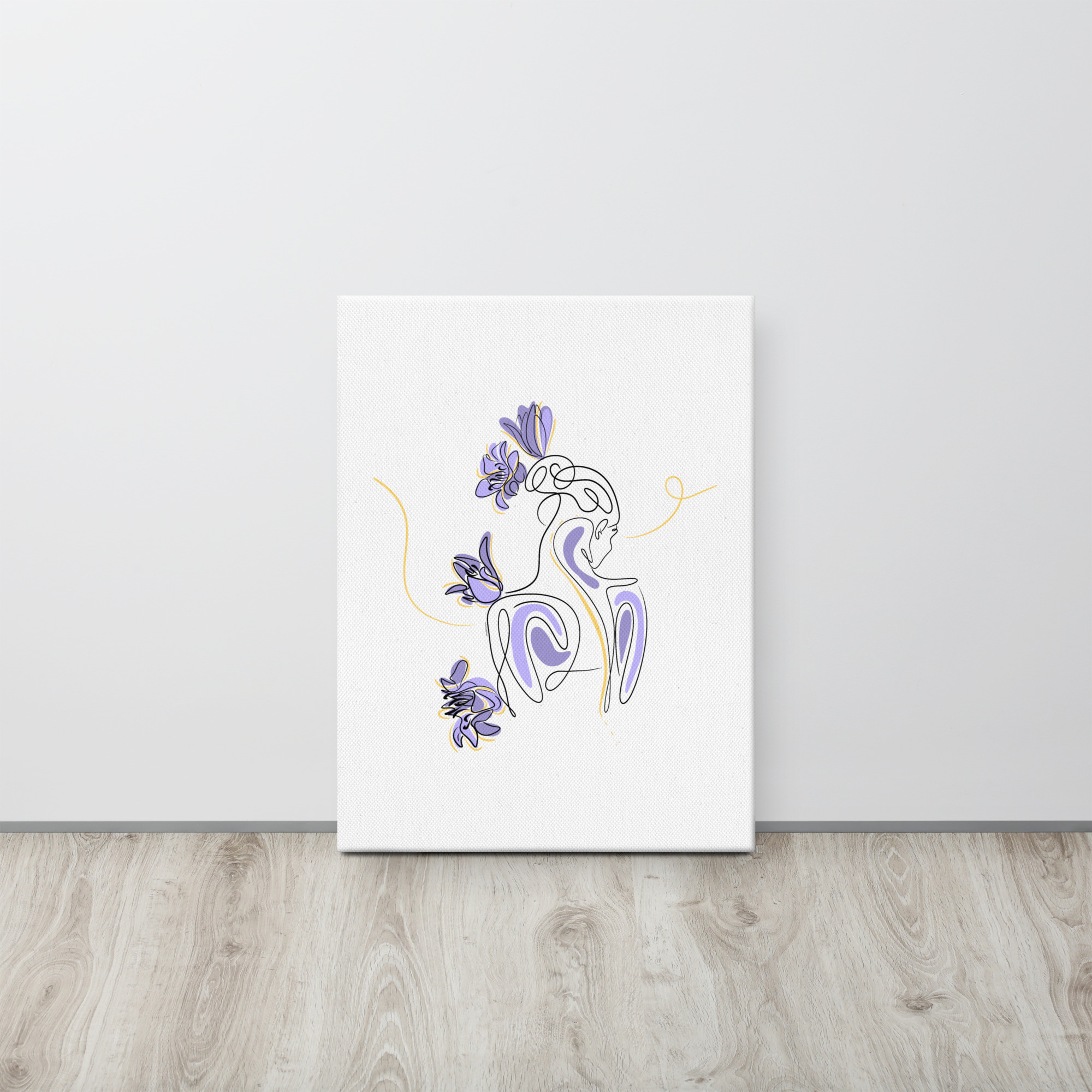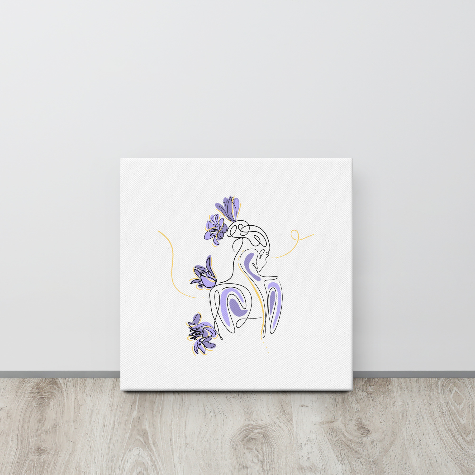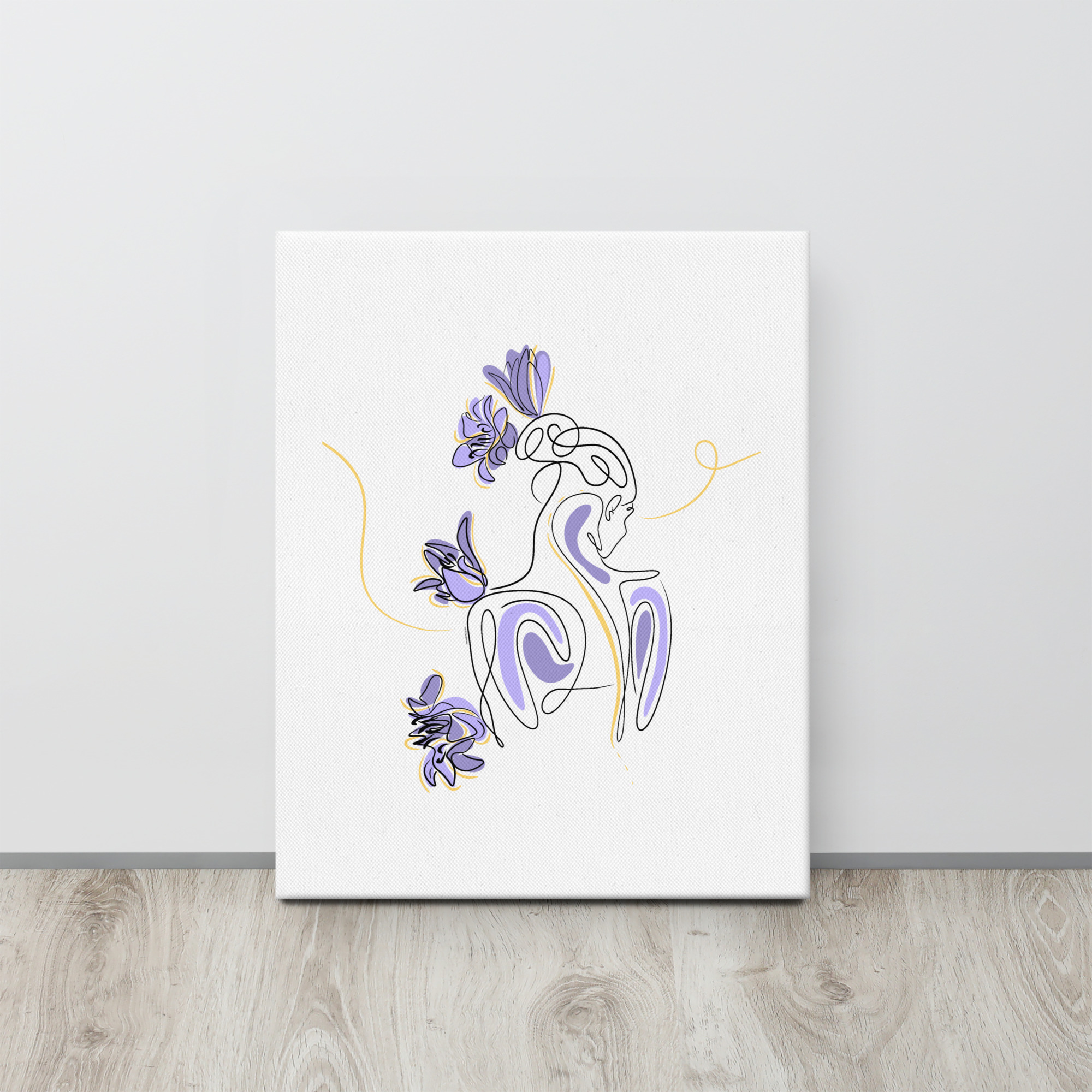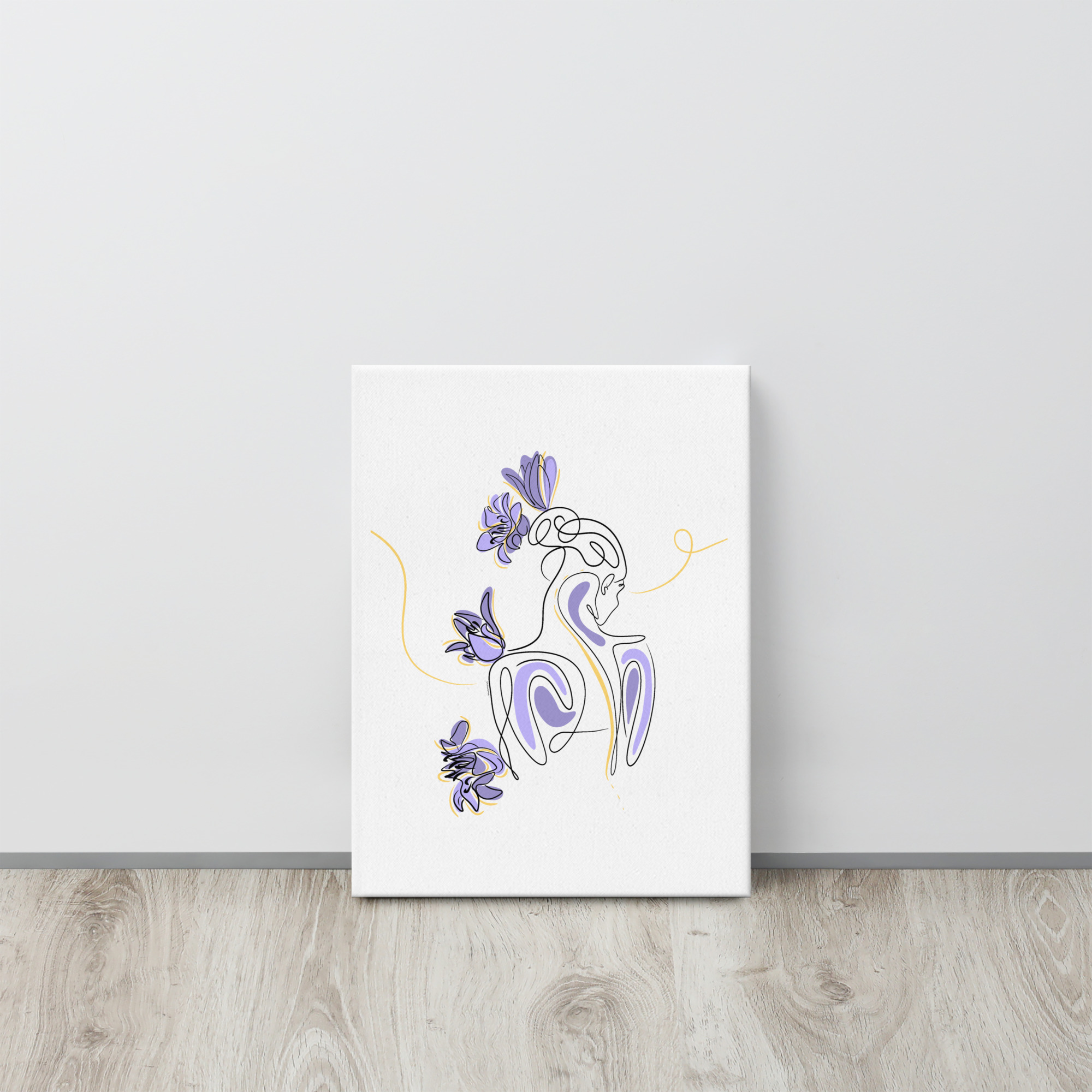 Une illustration minimaliste en line art représentant une silhouette féminine stylisée, entourée de pétales de lilas violets et de courbes dorées.