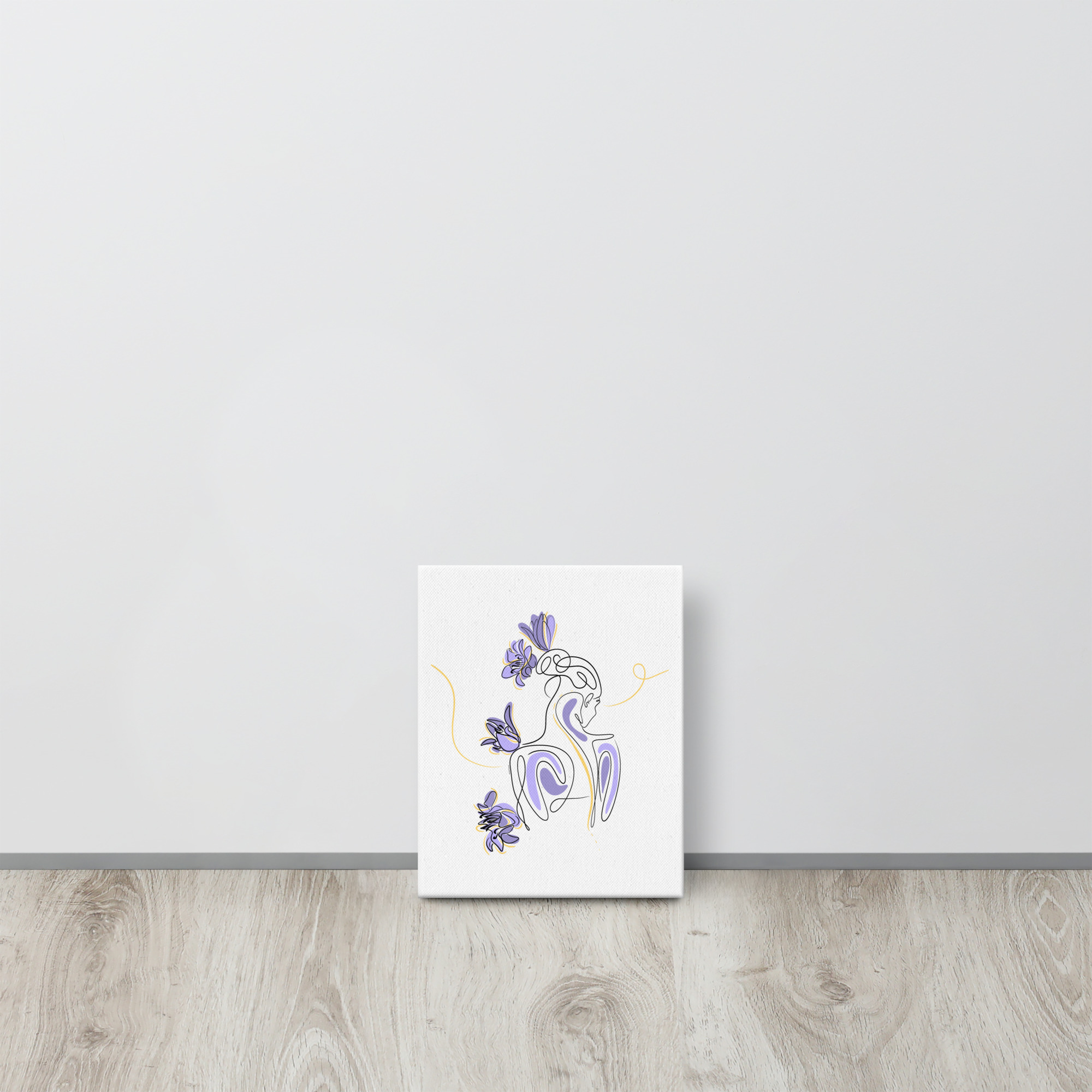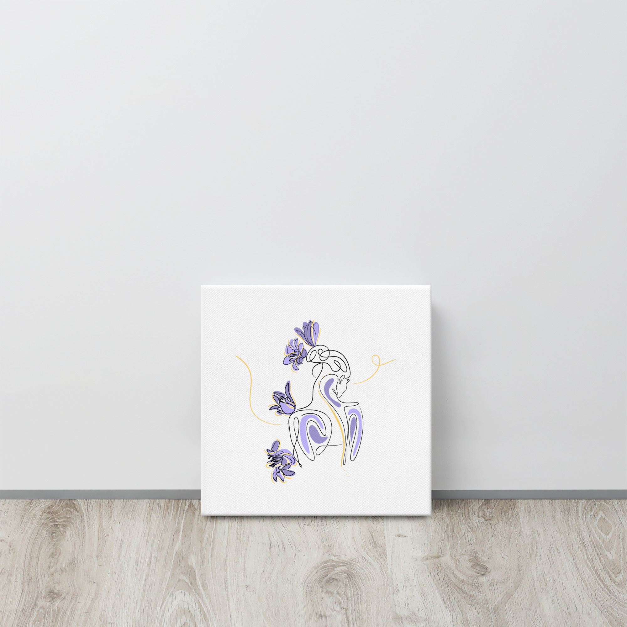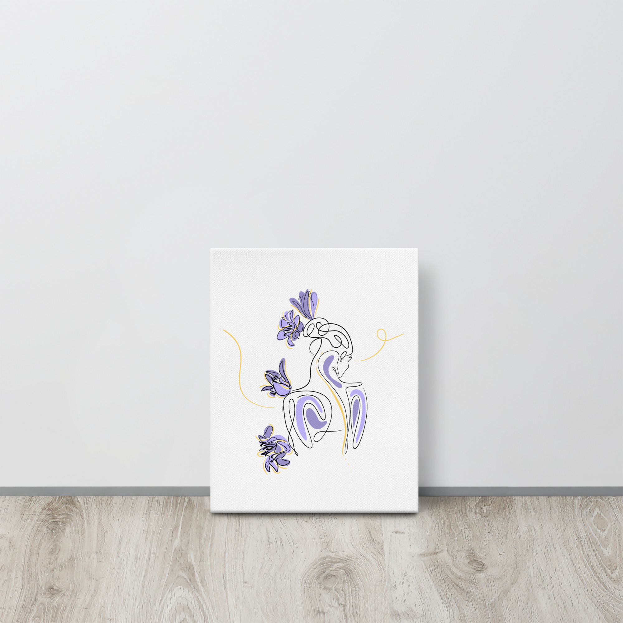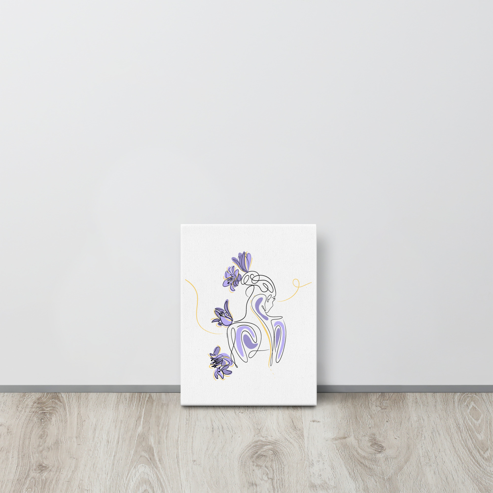Une illustration minimaliste en line art représentant une silhouette féminine stylisée, entourée de pétales de lilas violets et de courbes dorées.