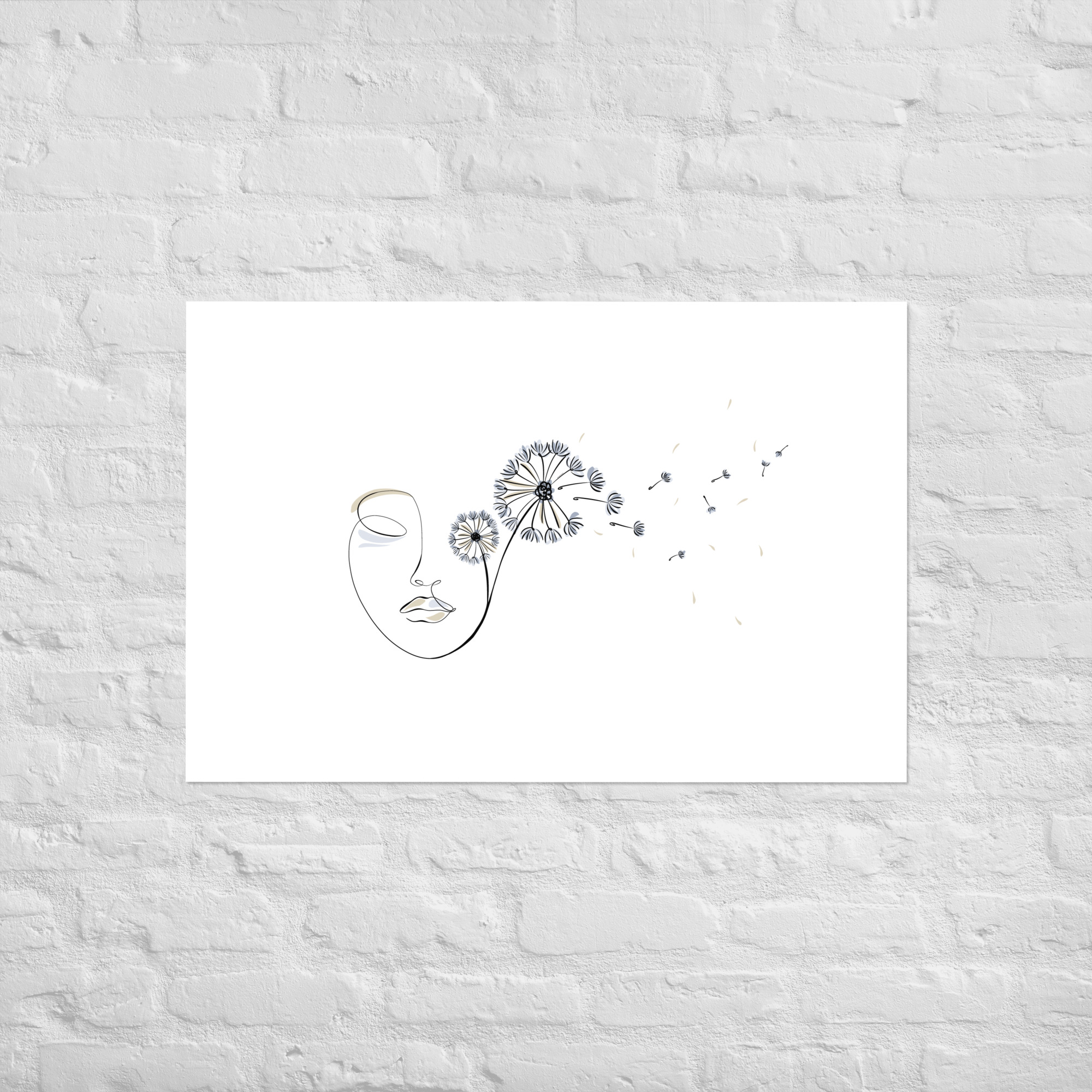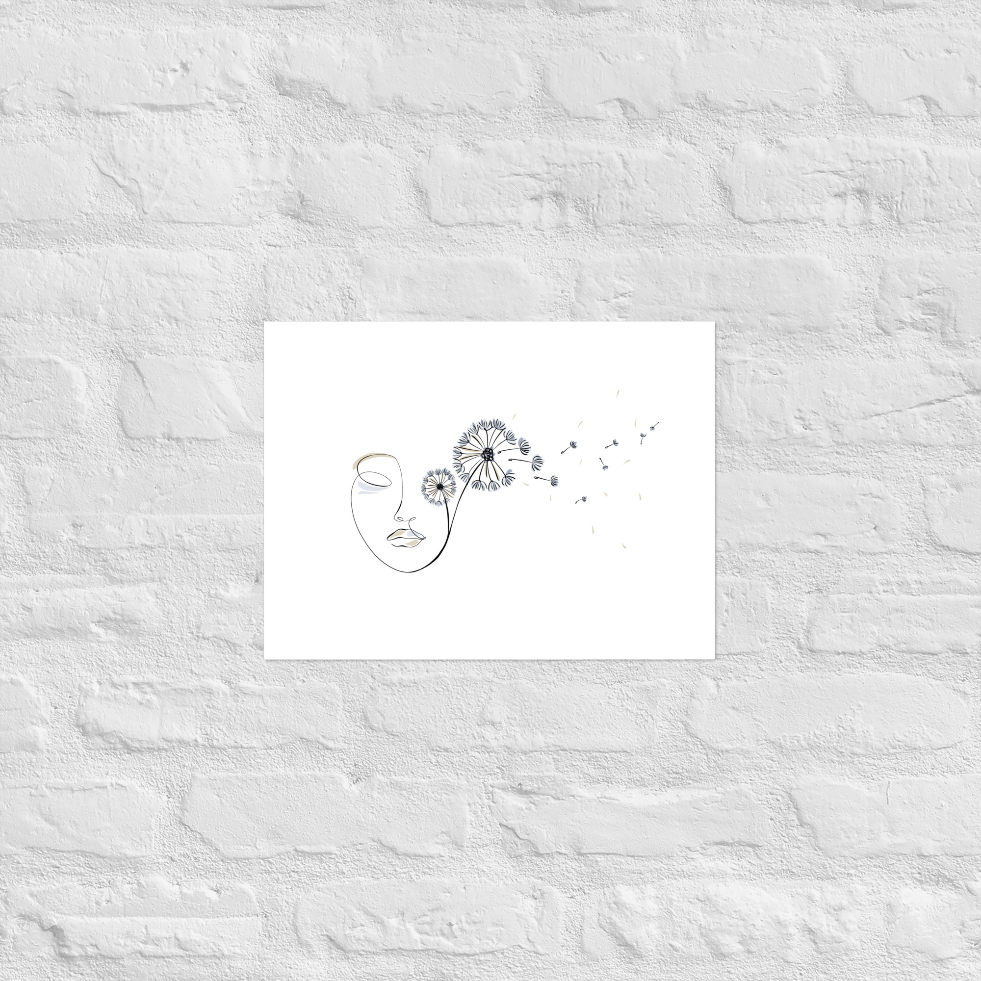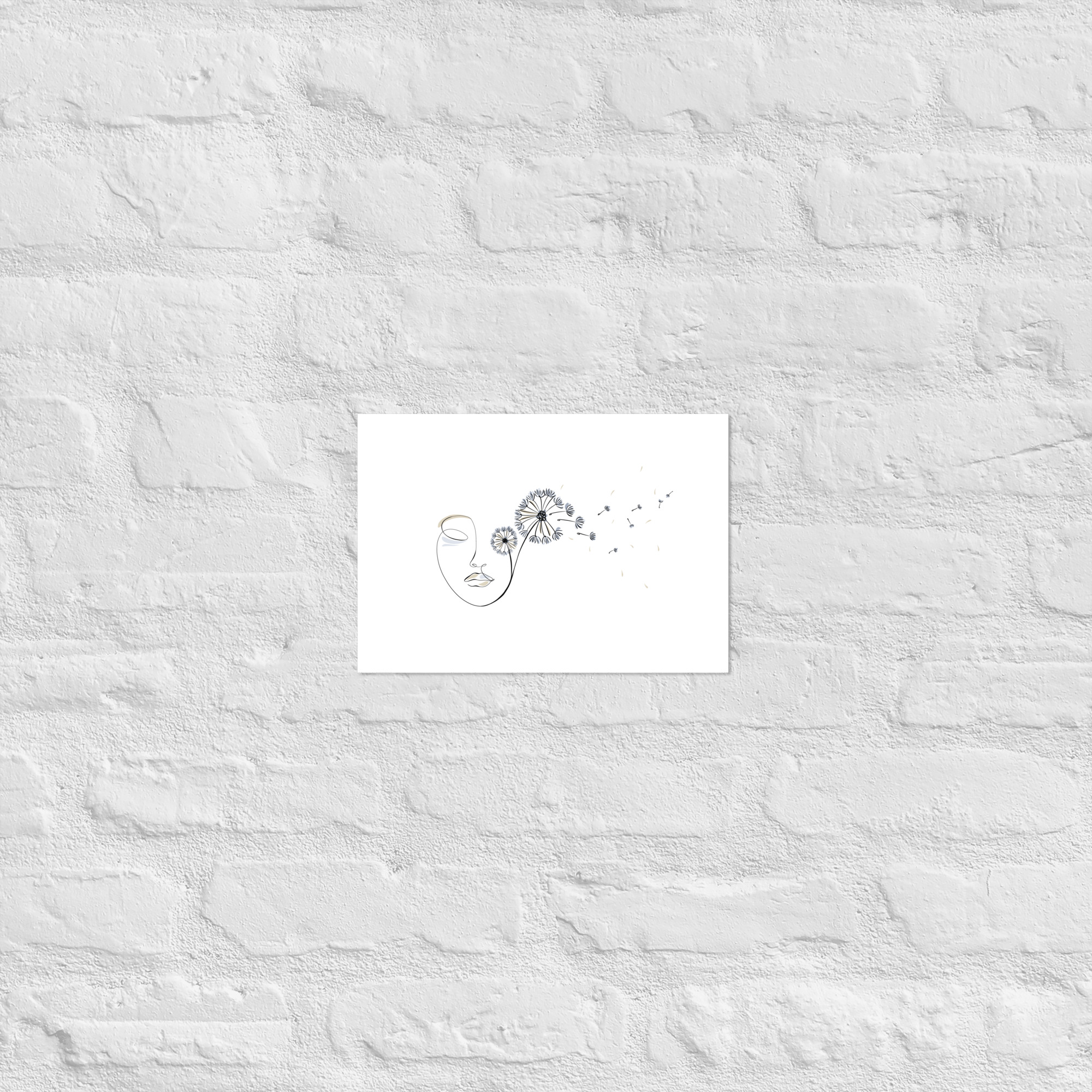 Une illustration minimaliste en line art représentant un visage féminin d’où s’envolent des pissenlits, symboles de liberté, de souffle et de poésie.