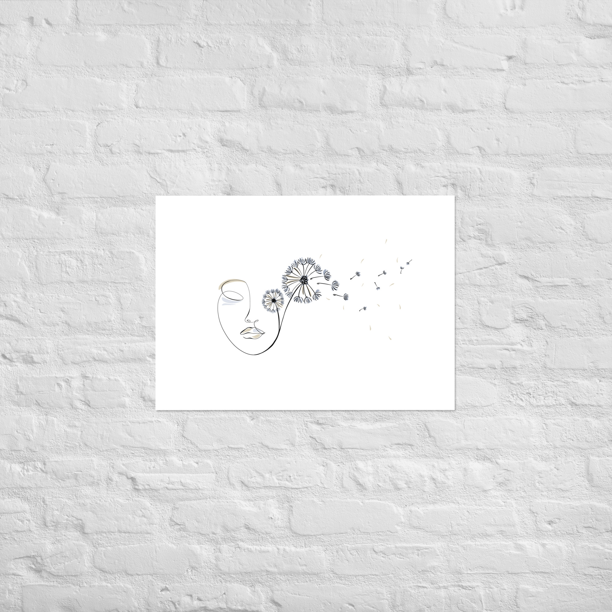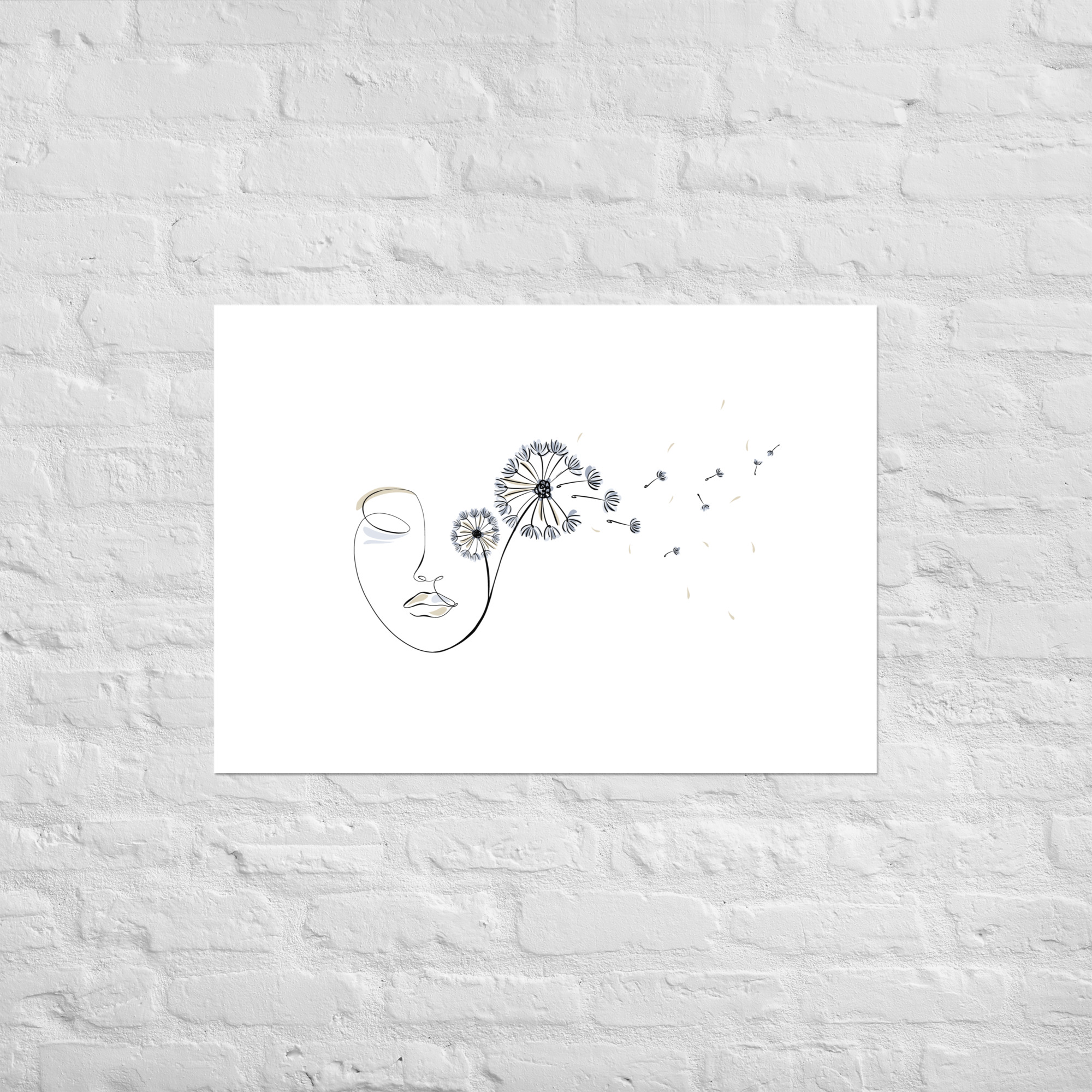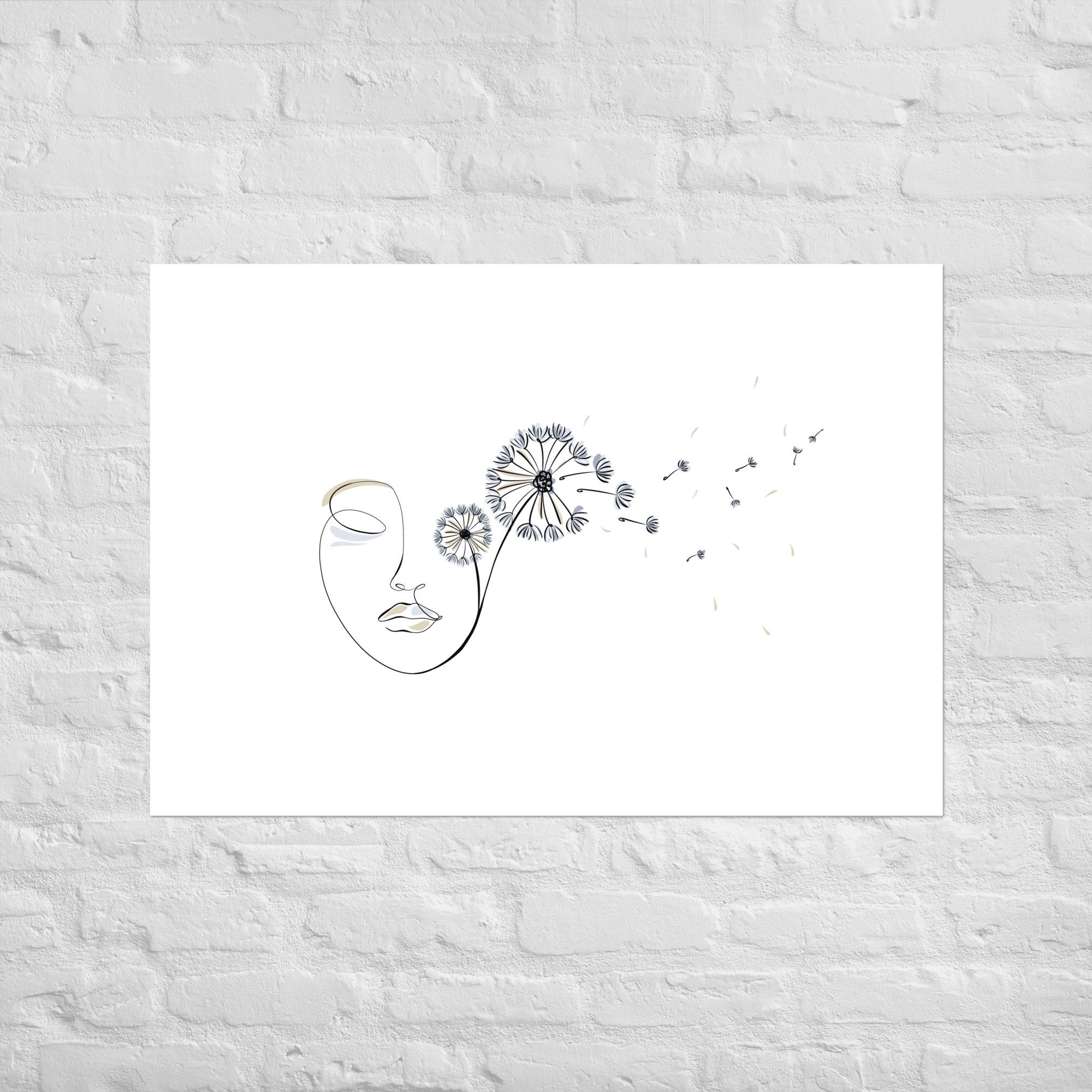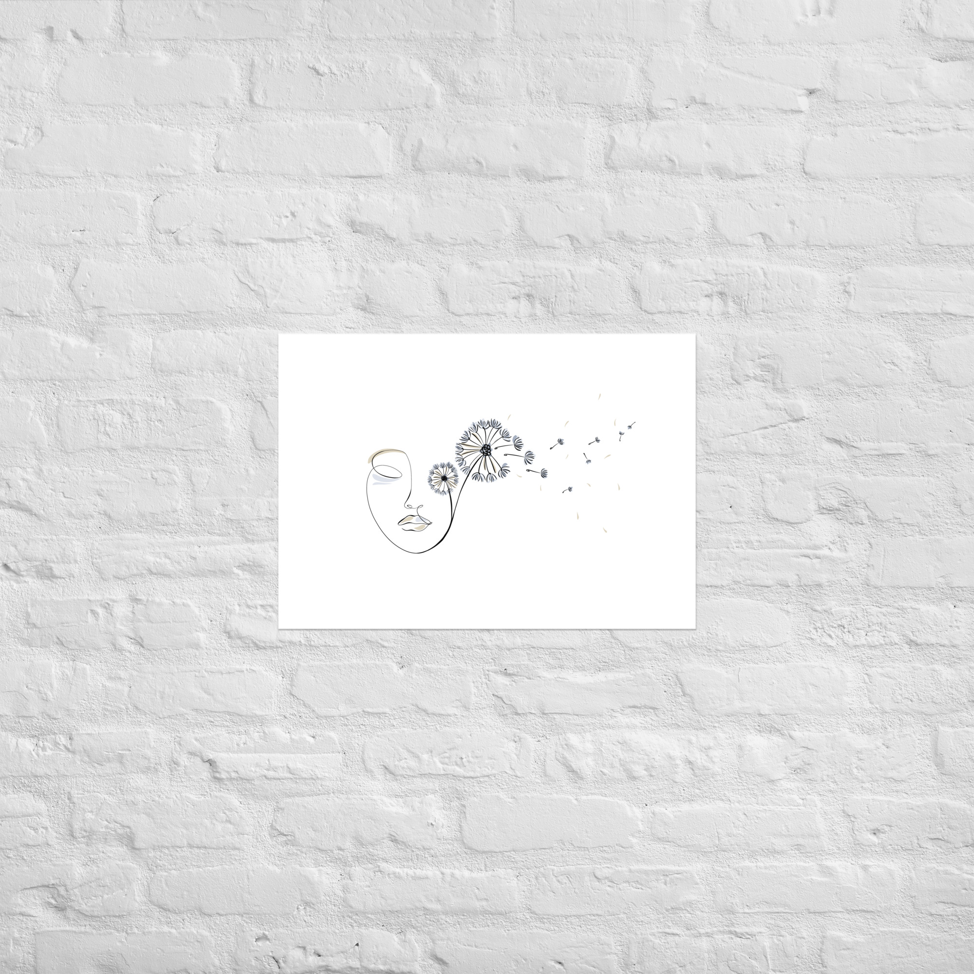 Une illustration minimaliste en line art représentant un visage féminin d’où s’envolent des pissenlits, symboles de liberté, de souffle et de poésie.