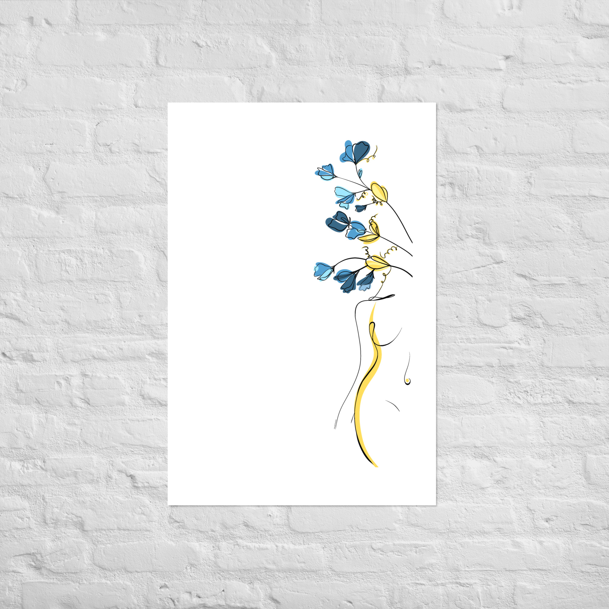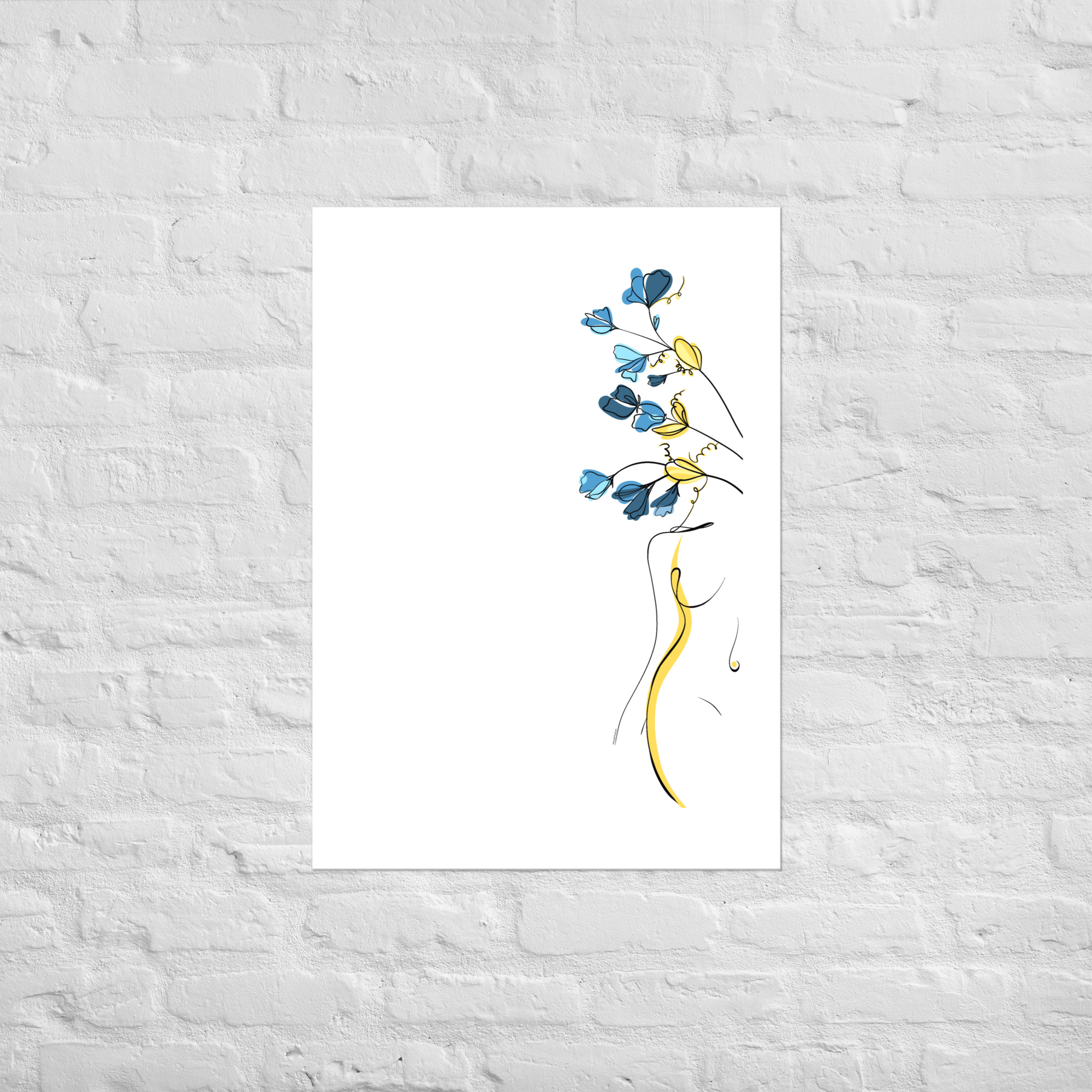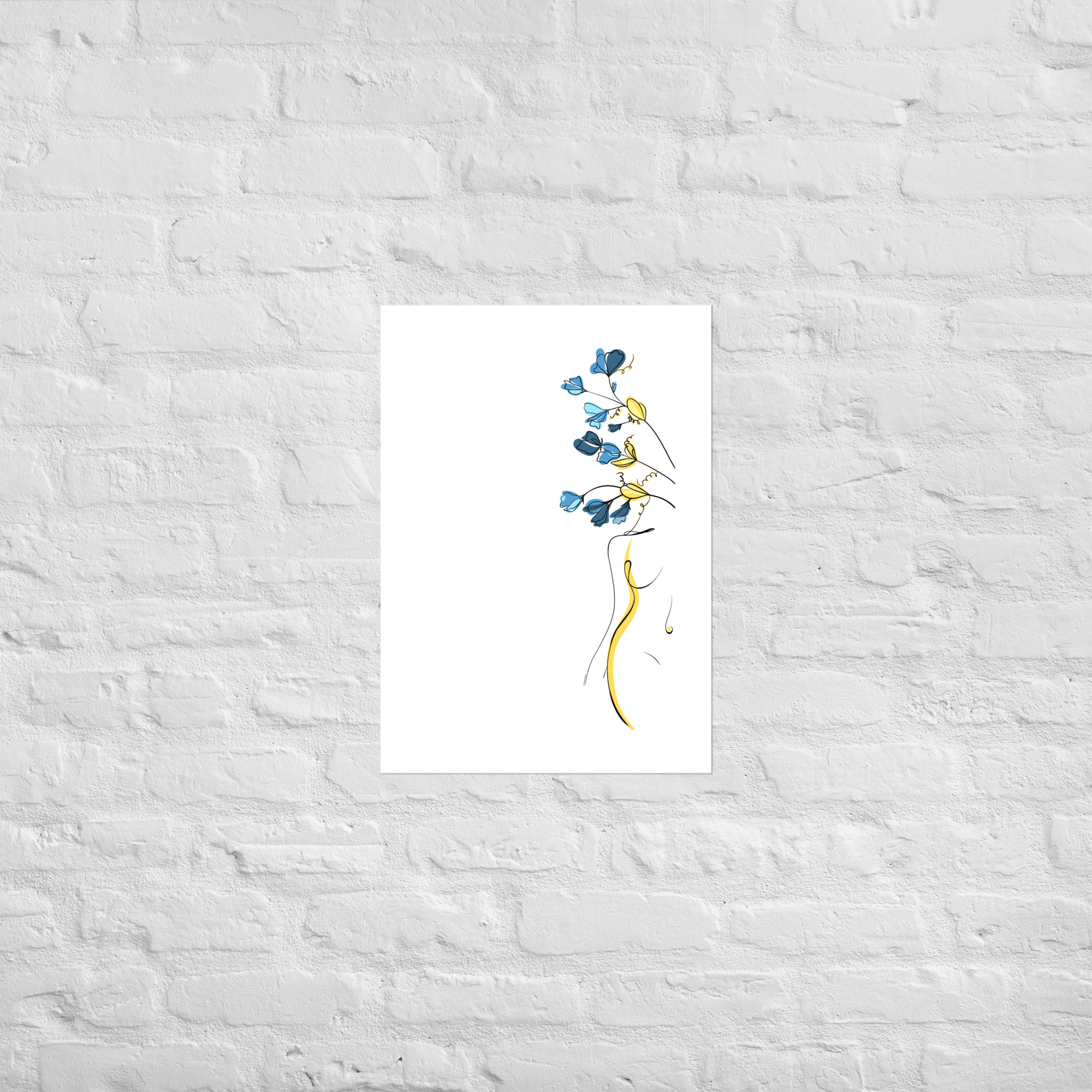Une illustration minimaliste en line art représentant une silhouette féminine ornée de fleurs bleues et jaunes en suspension, évoquant la légèreté et la transformation.