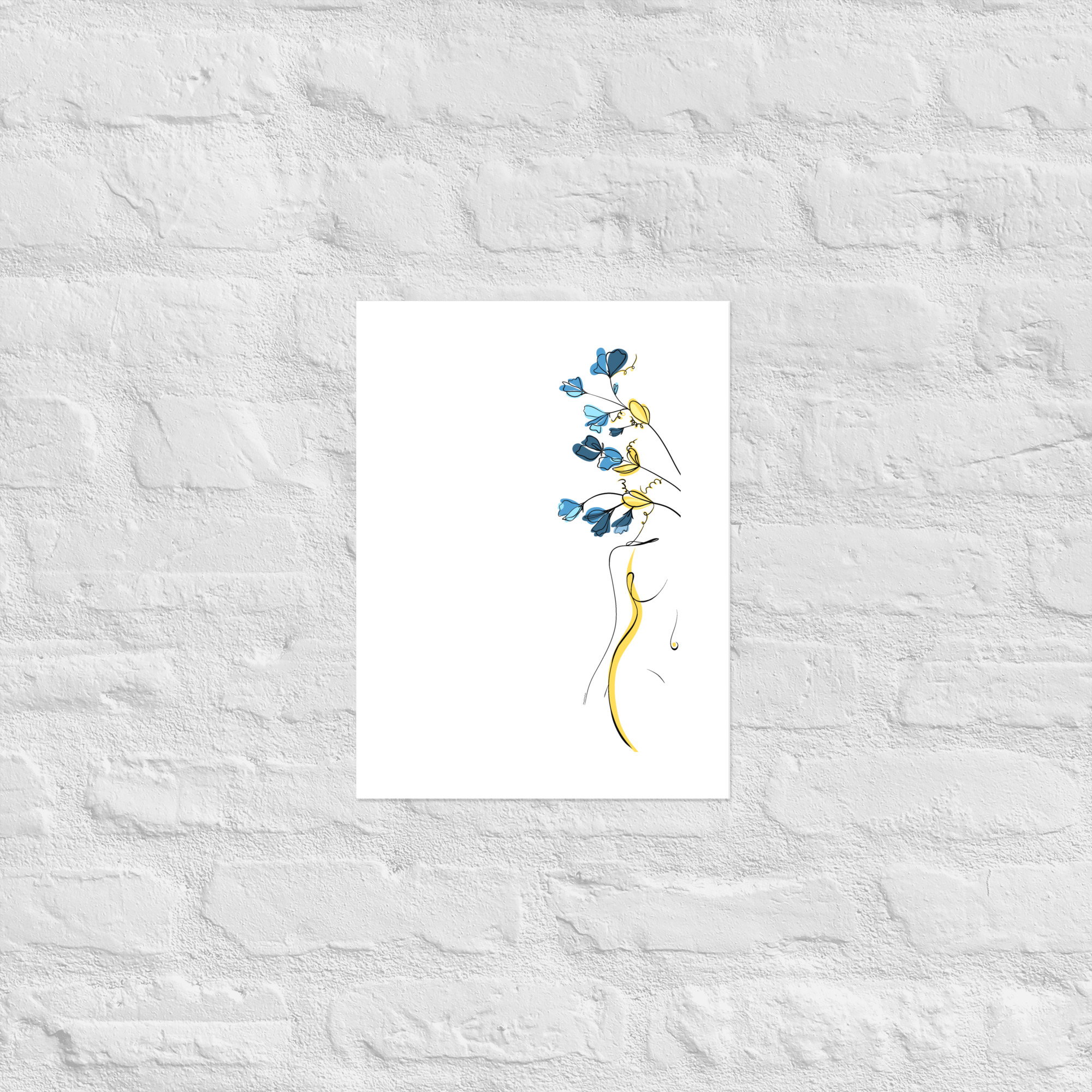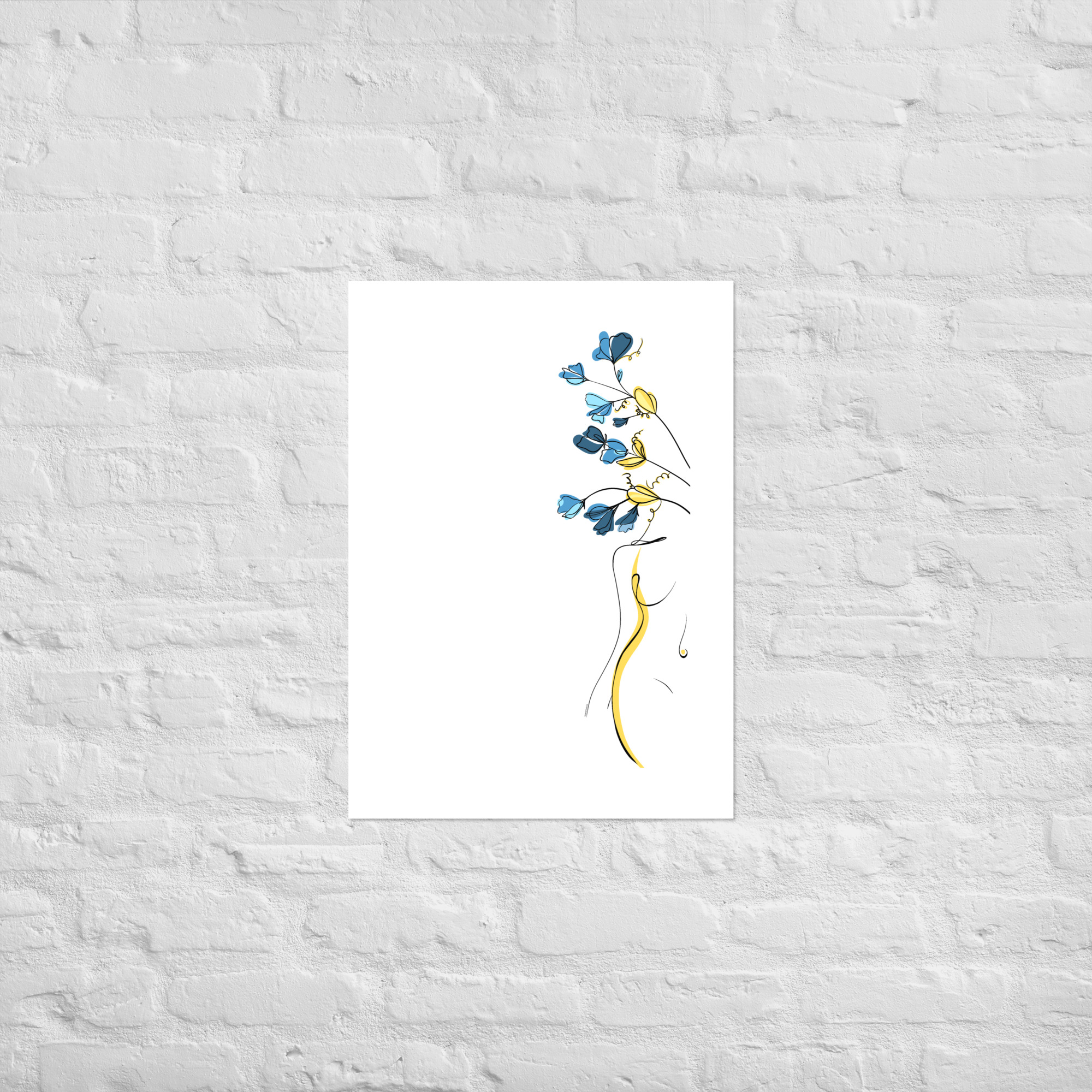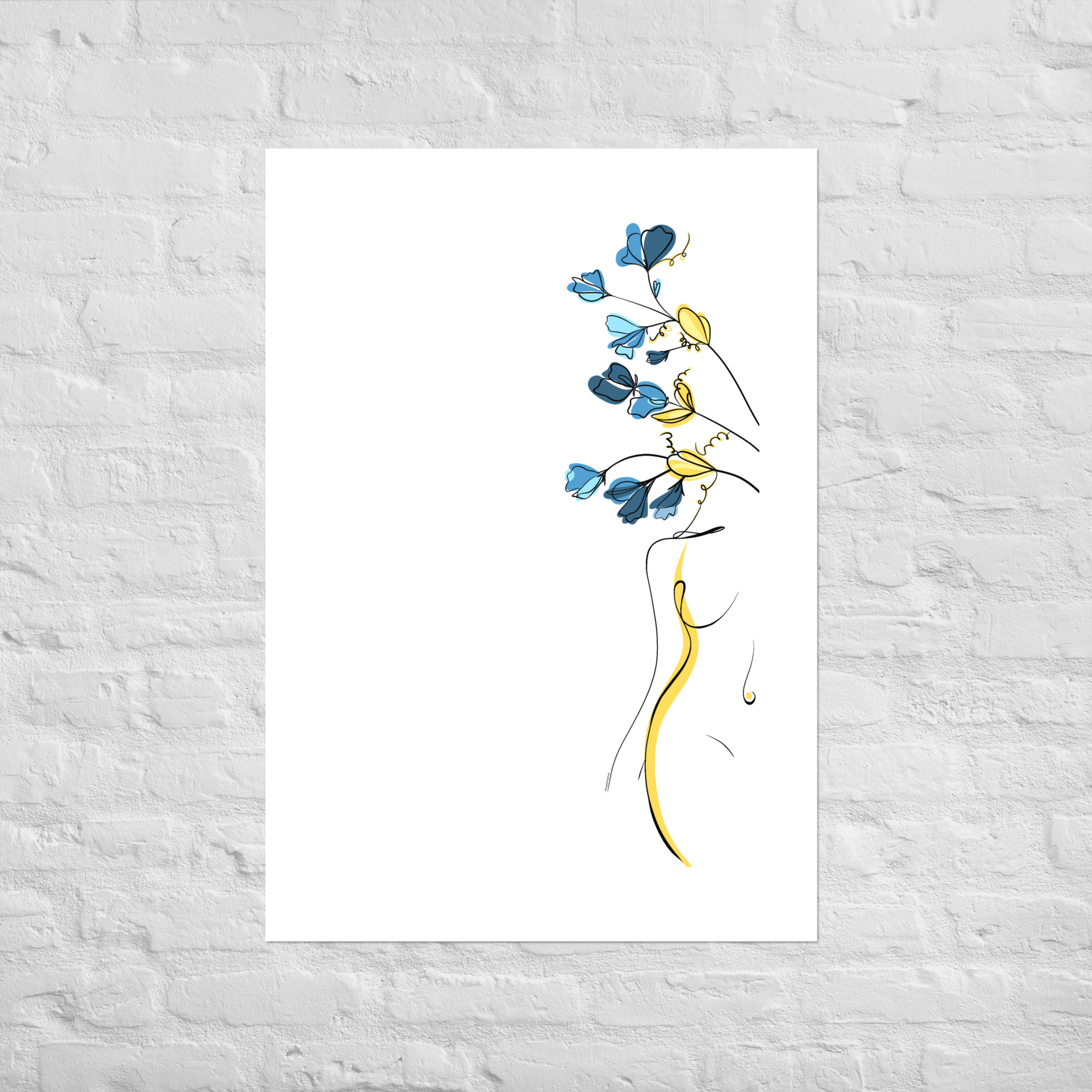 Une illustration minimaliste en line art représentant une silhouette féminine ornée de fleurs bleues et jaunes en suspension, évoquant la légèreté et la transformation.
