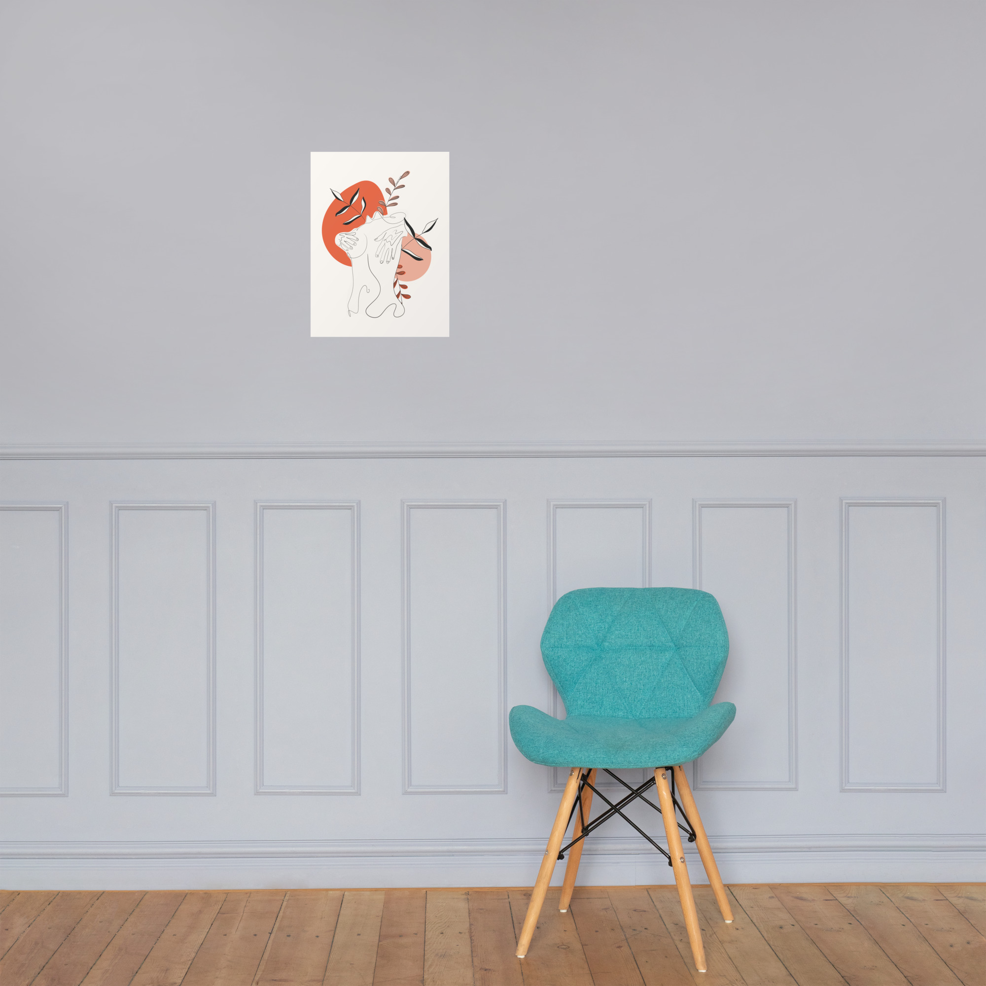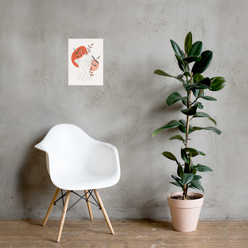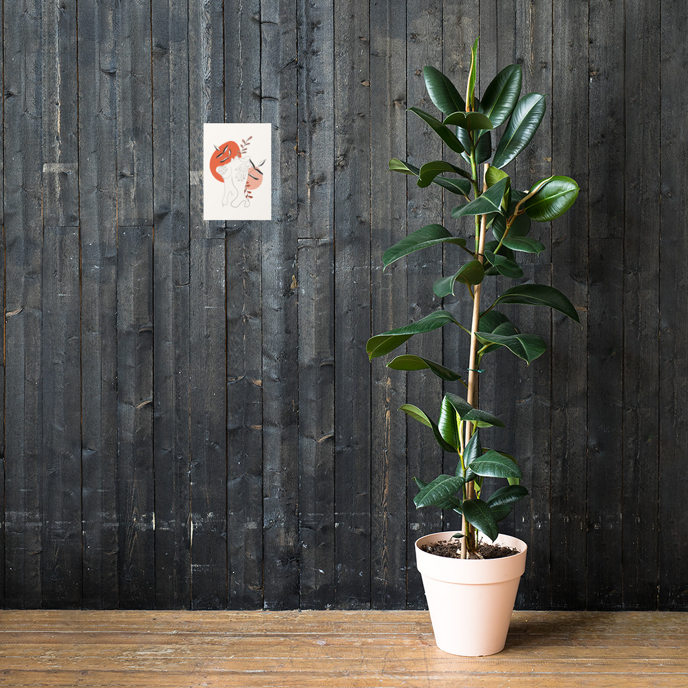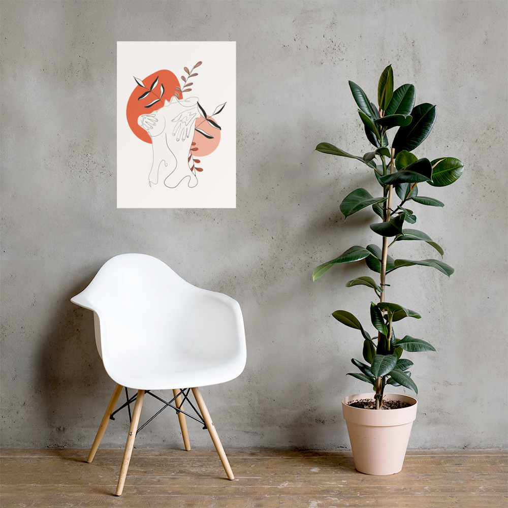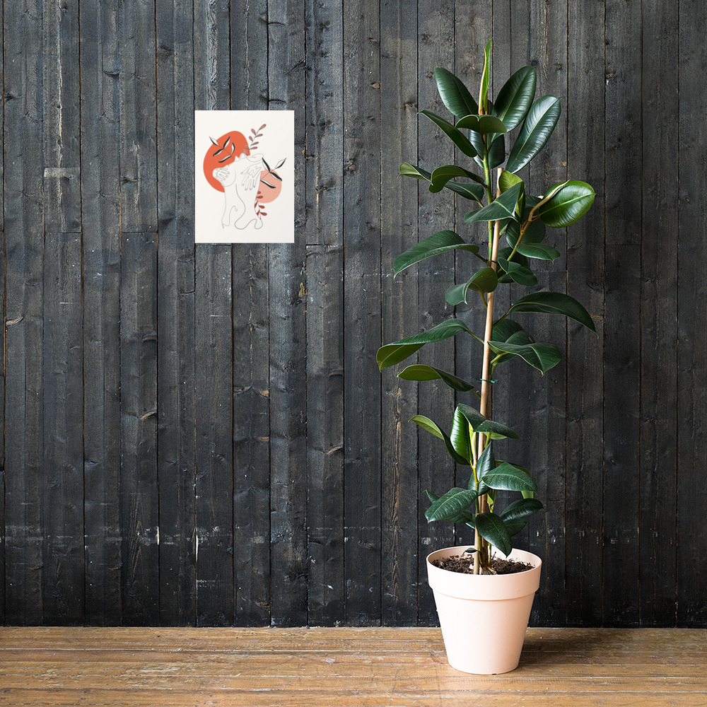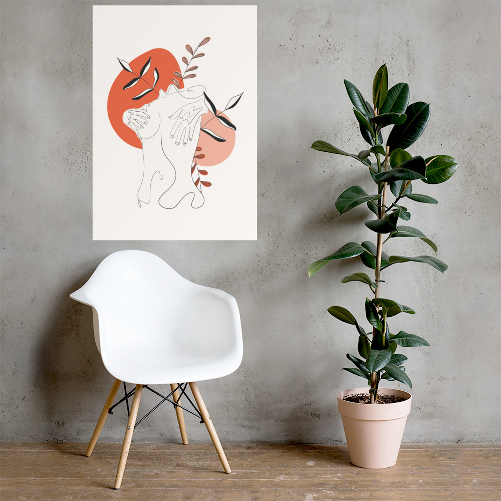 La silhouette se replie sur elle-même, dans un geste de protection douce, tandis que des feuillages sobres émergent en arrière-plan — comme une respiration lente, profonde, retrouvée.