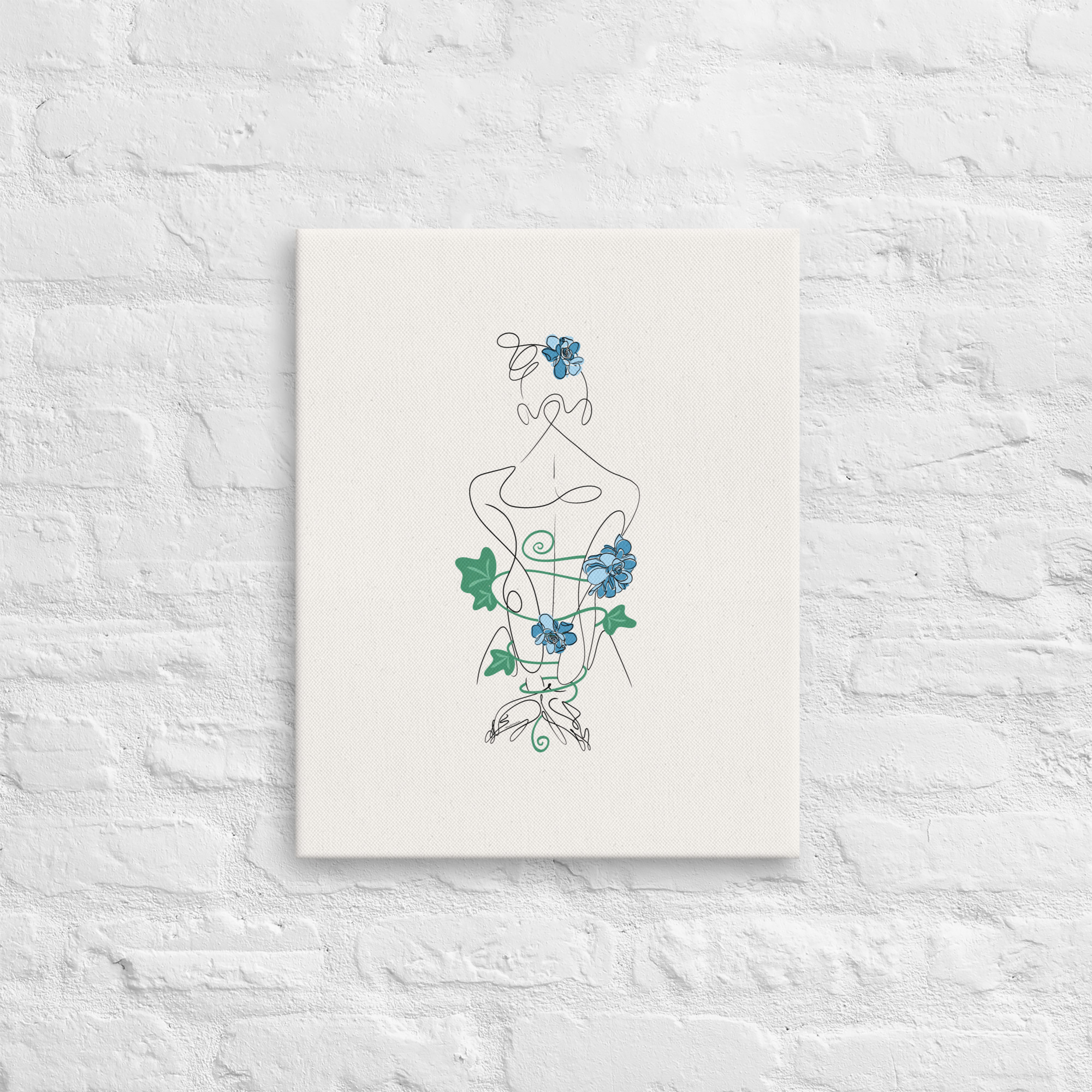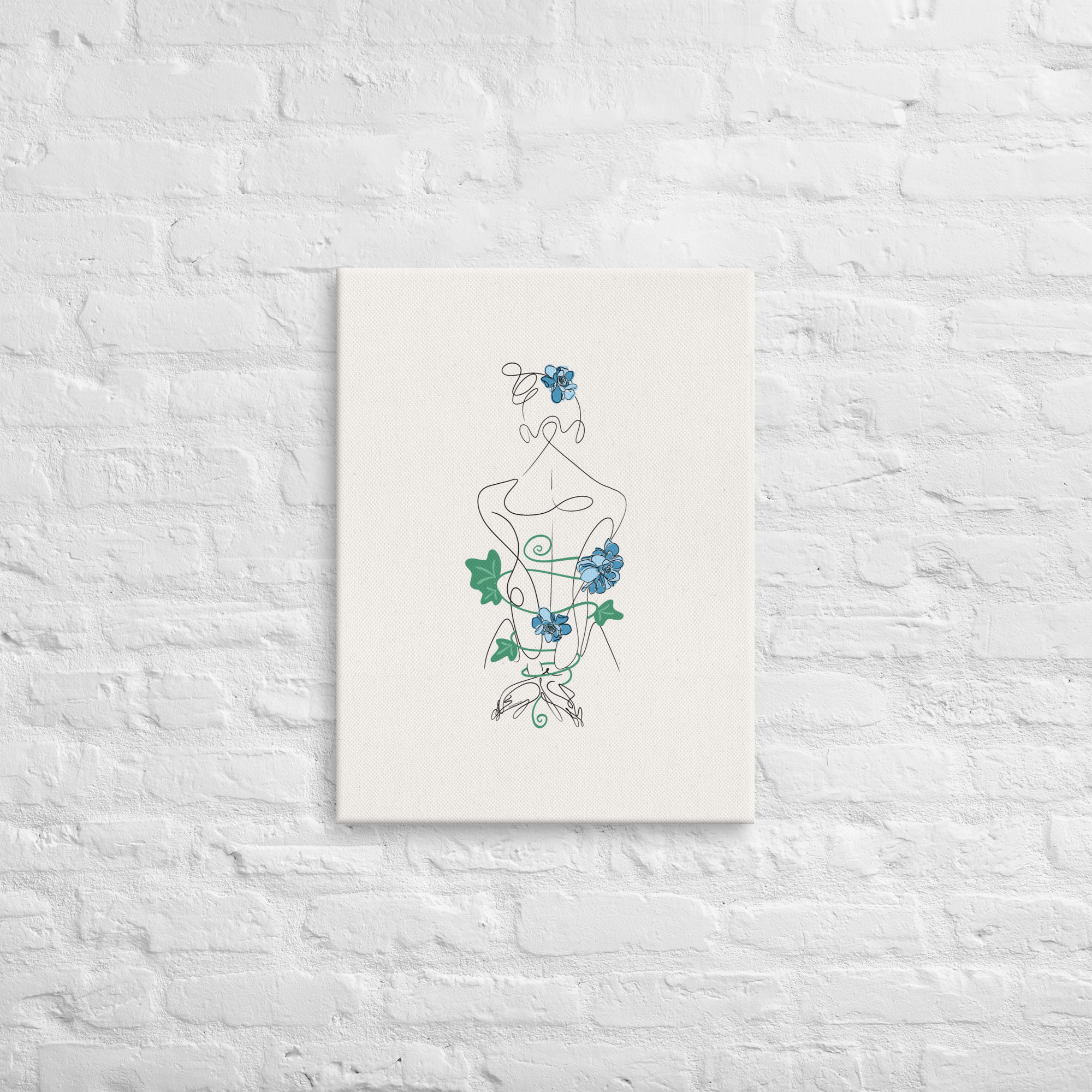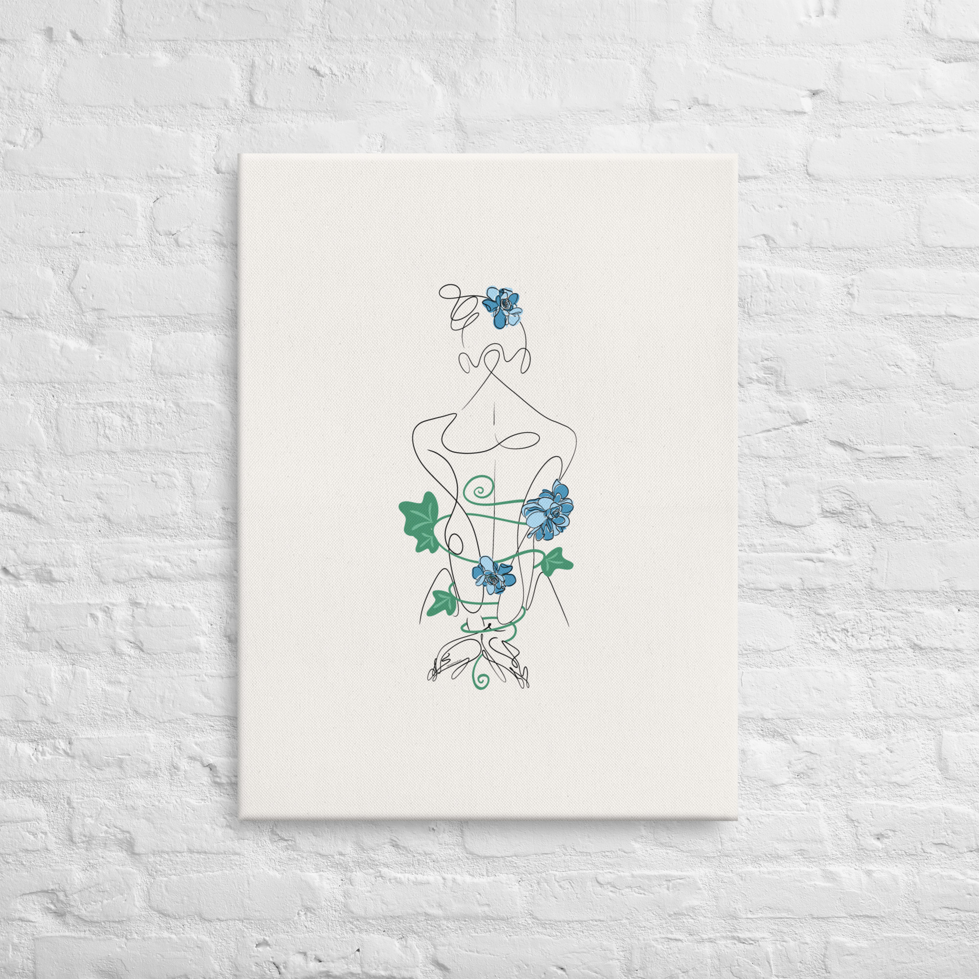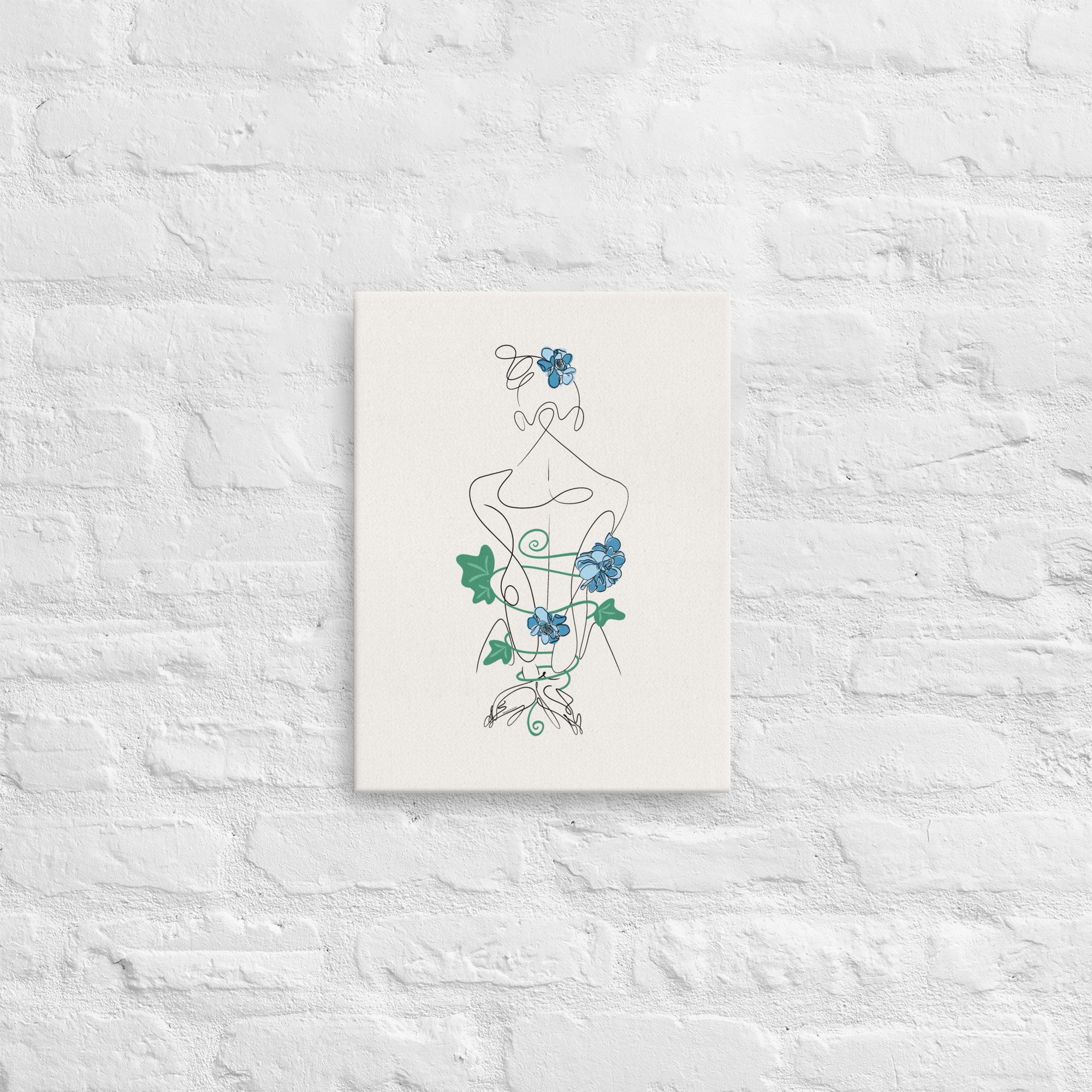De dos, la silhouette féminine se laisse enlacer par des lianes souples, ponctuées de fleurs bleutées, comme autant de liens vivants et sensibles.