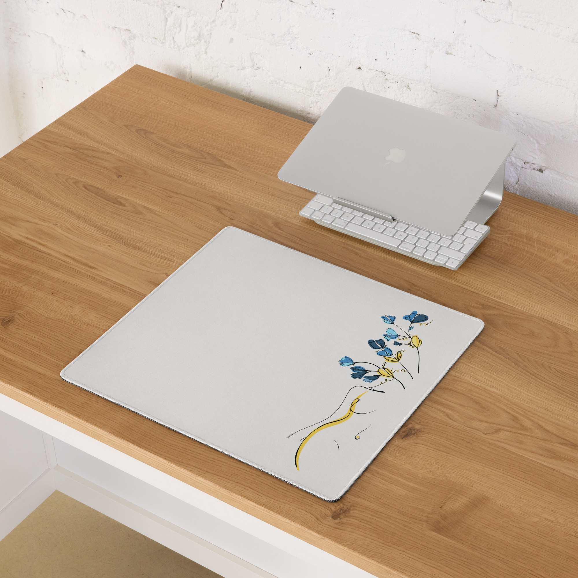 Une illustration minimaliste en line art représentant une silhouette féminine ornée de fleurs bleues et jaunes en suspension, évoquant la légèreté et la transformation.